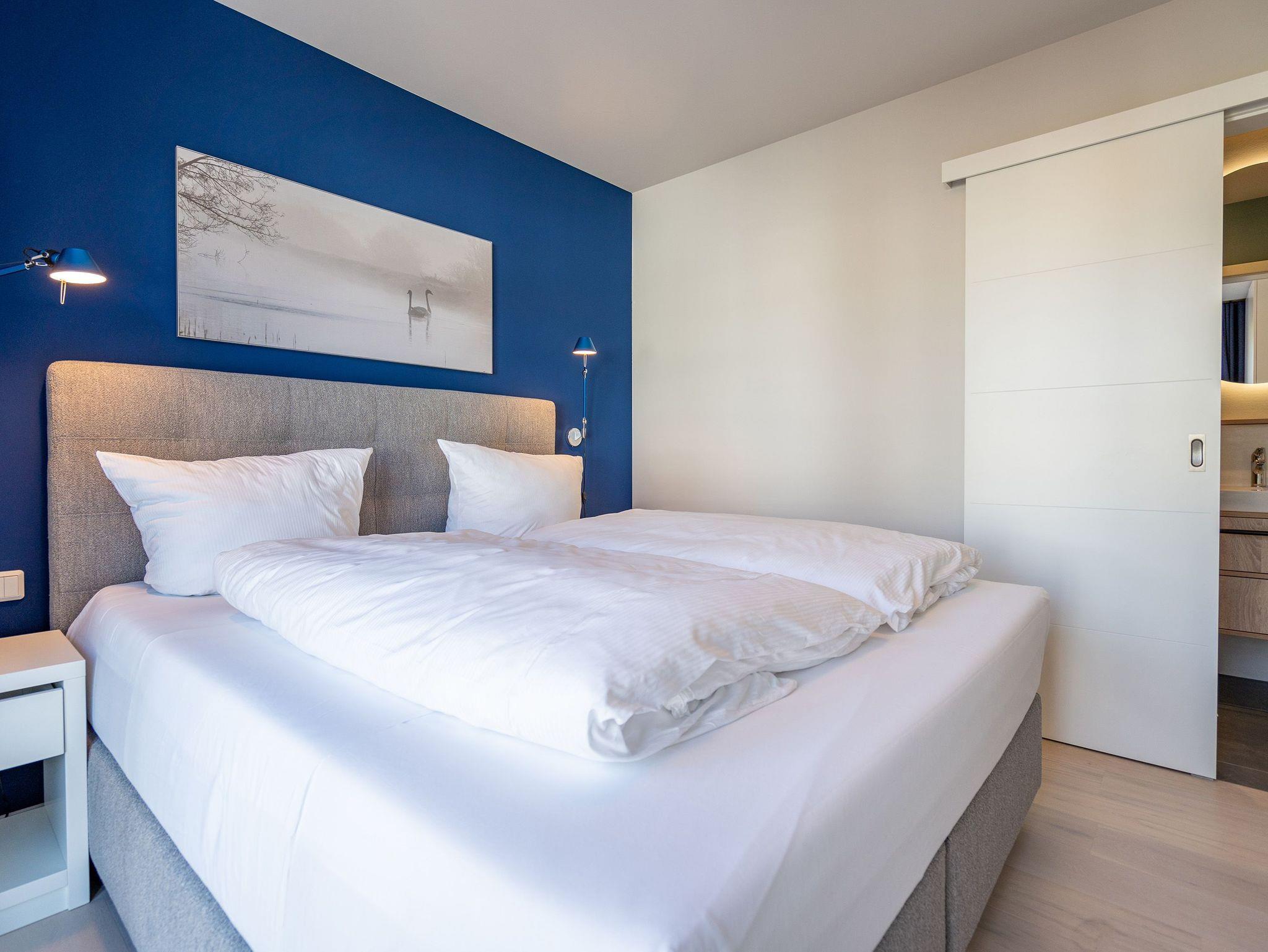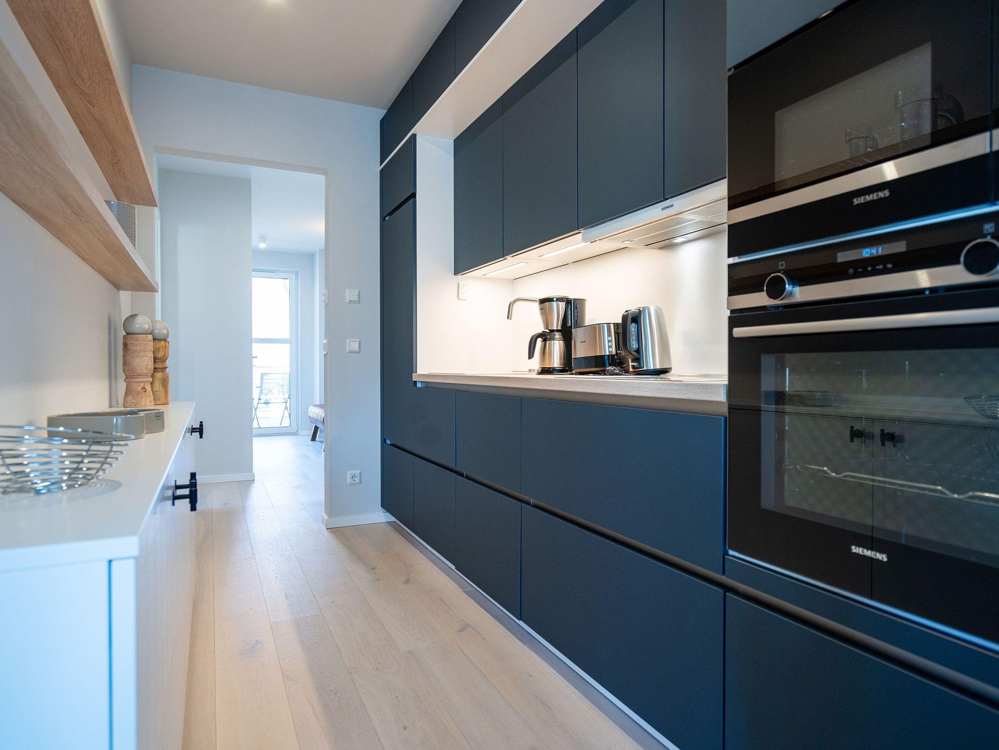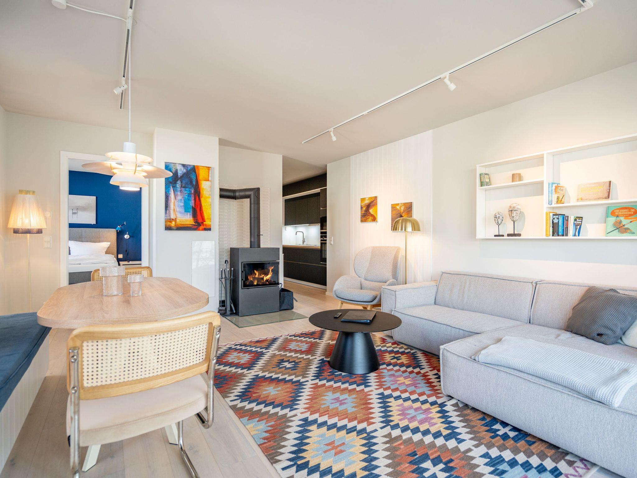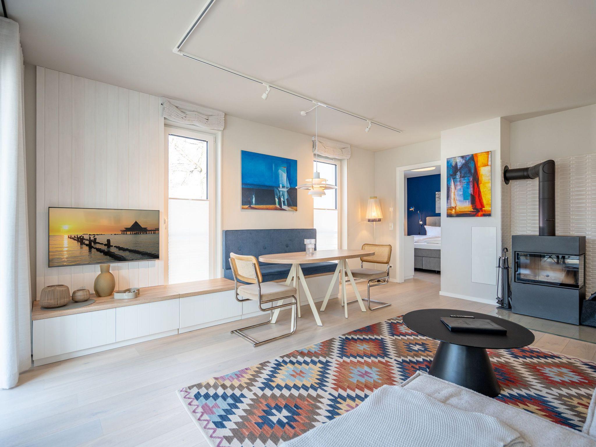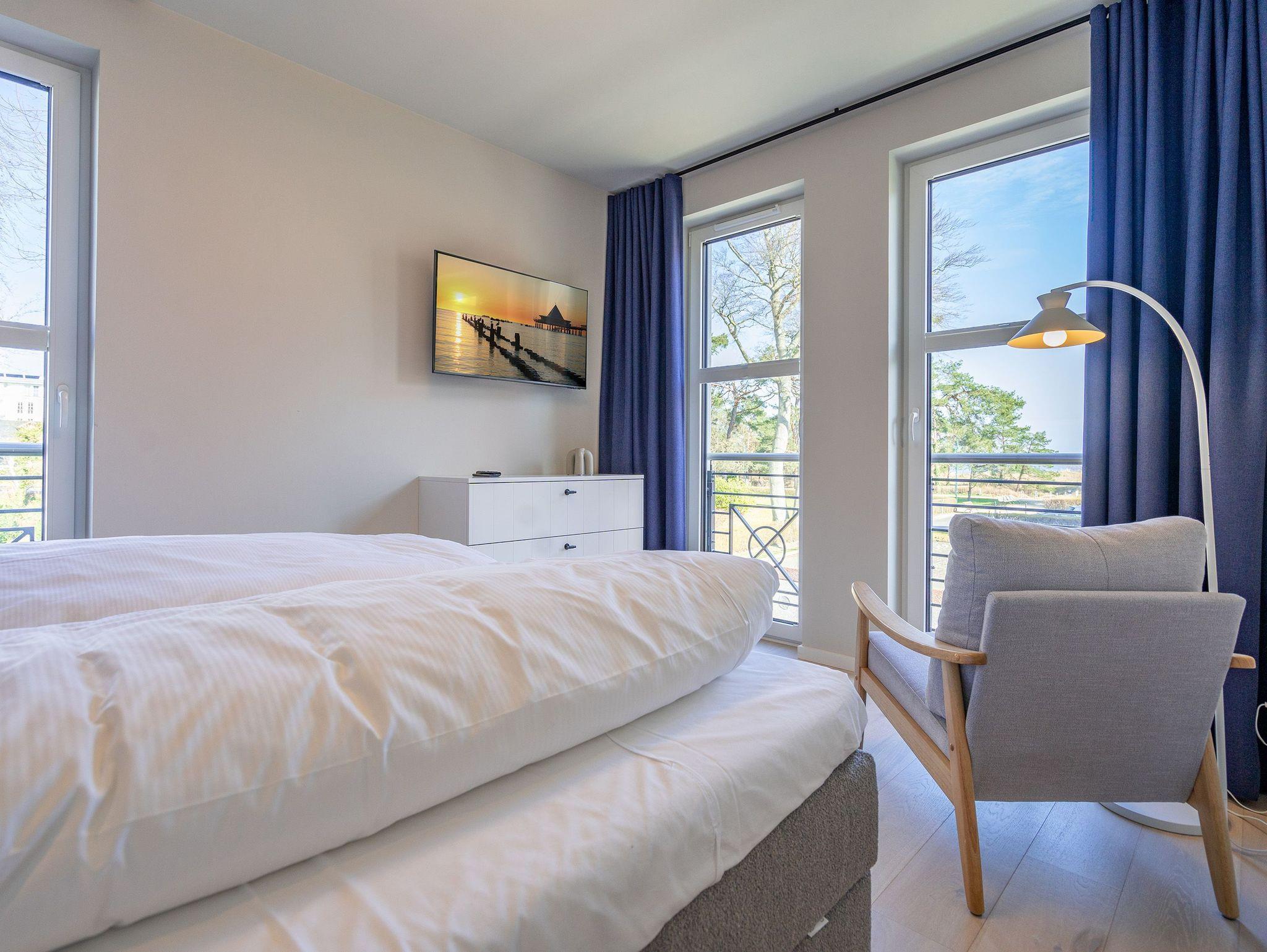 Herzlich willkommen in der exquisiten 3-Raum-Ferienwohnung Nr. 04 im Quartier am Strand! Diese großzügige und stilvolle 84 Quadratmeter Wohnung im 1. Obergeschoss bietet den idealen Rückzugsort für bis zu 4 Erwachsene und ein Kleinkind (in einem Kinderreisebett). Der offene Wohnbereich ist der perfekte Ort, um Ihre Urlaubstage zu genießen. Hier finden Sie eine gemütliche Sitzgruppe, einen Flachbildfernseher (43 Zoll) und einen einladenden Kaminofen. Ein Essplatz für 4 Personen lädt zu gemeinsamen Mahlzeiten und geselligen Abenden ein. Von hier aus gelangen Sie direkt auf den 9 Quadratmeter großen Süd-West-Balkon, auf dem Sie die Sonne und die frische Meeresbrise genießen können. Die voll ausgestattete Küchenzeile verfügt über moderne Annehmlichkeiten, darunter einen Induktionsherd und eine Mikrowelle, die Ihnen die Zubereitung von köstlichen Mahlzeiten erleichtern. Die Wohnung bietet zwei Schlafzimmer, von denen eines mit einem Boxspringdoppelbett (1,80m x 2,00m) ausgestattet ist und direkten Zugang zum innenliegenden Masterbad bietet. Hier finden Sie eine Dusche, einen Waschtisch und ein WC. Das zweite Schlafzimmer verfügt ebenfalls über ein komfortables Boxspringdoppelbett (1,80m x 2,00m), einen Flachbildfernseher und einen traumhaften Seeblick, der Ihre Morgen mit atemberaubenden Ausblicken bereichert. Zusätzlich zu dem Masterbad gibt es ein zweites Tageslichtbad mit Waschtisch, Dusche, WC, Waschmaschine und Trockner, um Ihren Aufenthalt so angenehm wie möglich zu gestalten. Für Ihre Entspannung sorgt die finnische Sauna für 2-3 Personen, in der Sie sich nach einem erlebnisreichen Tag erholen können. Genießen Sie den Ausblick Richtung Ostsee vom 2. Balkon (6 qm) aus und erleben Sie Momente der Ruhe und Entspannung. Ihr Fahrzeug findet einen sicheren Platz in der Tiefgarage, der auch eine optional buchbare E-Ladesäule beinhaltet. Zudem steht Ihnen ein wohnungseigener Fahrradkeller zur Verfügung. Wir laden Sie herzlich ein, Ihre Ferien in dieser traumhaften Ferienwohnung zu verbringen und die Schönheit der Umgebung zu erkunden. Buchen Sie jetzt und freuen Sie sich auf unvergessliche Tage im Quartier am Strand!