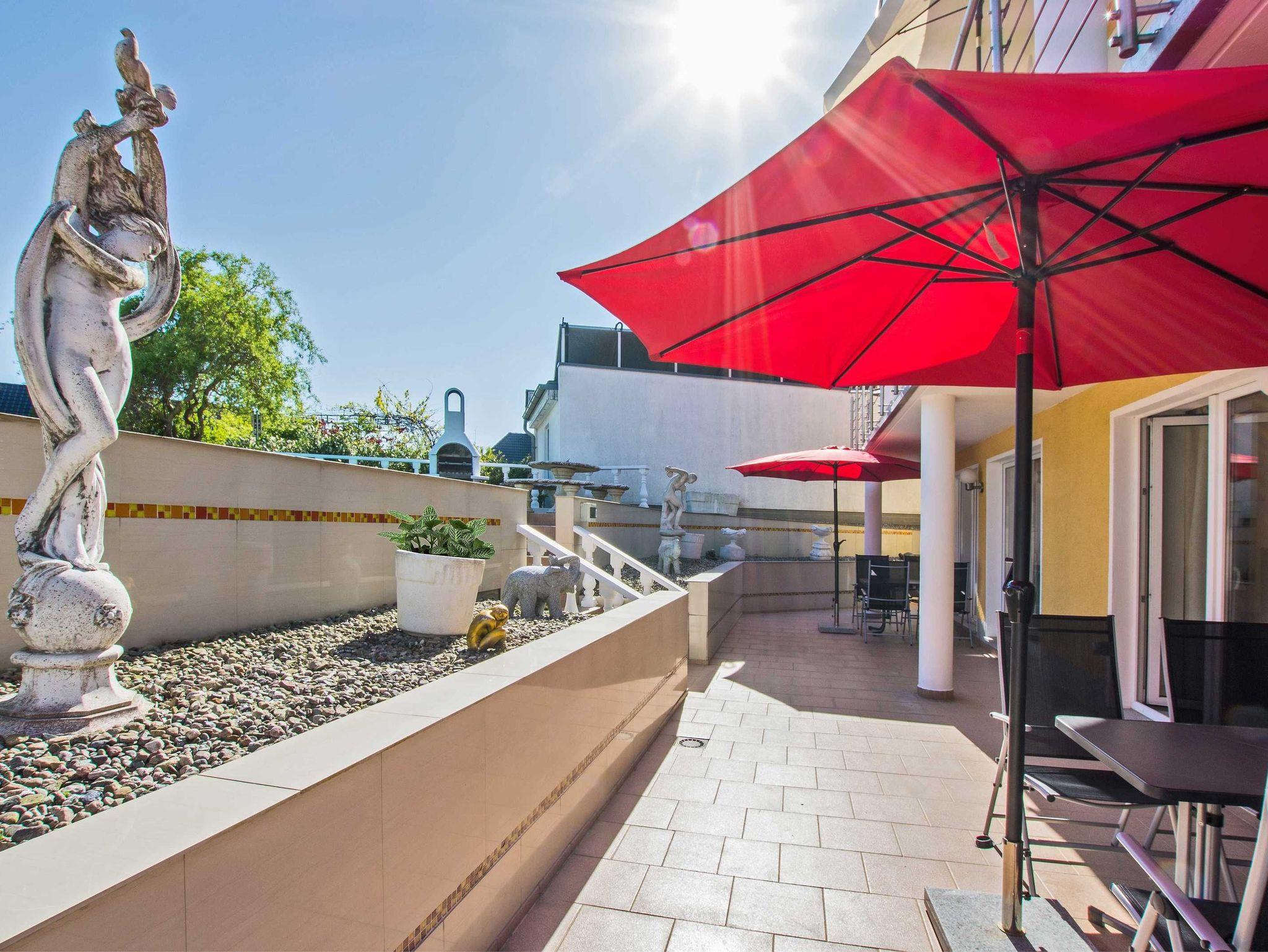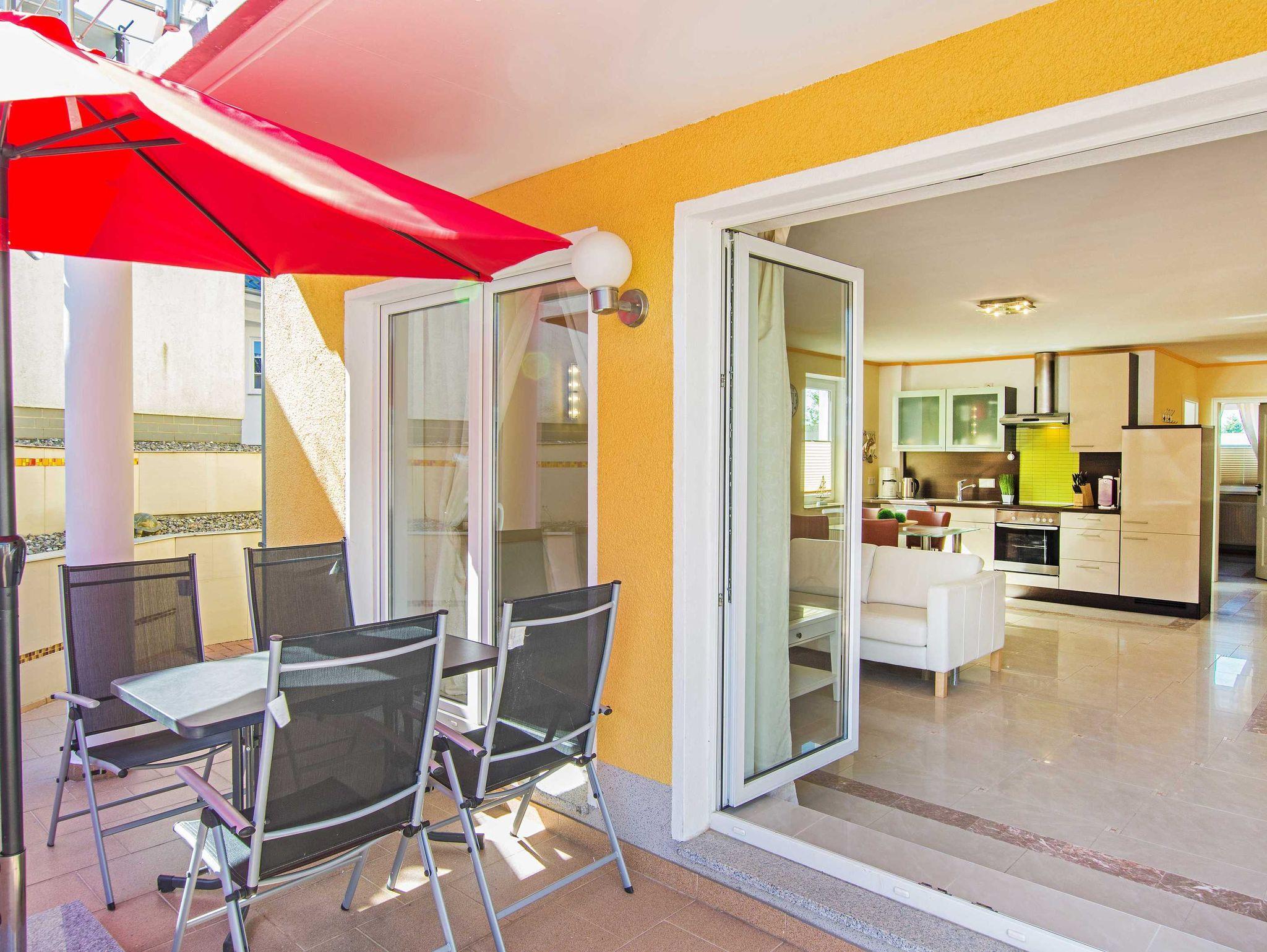 Über die Terrasse gelangen Sie direkt zum sonnenbeheizten gemeinschaftlichen Außenpool, dem Grillplatz, den Sonnenliegen, den Sitzmöglichkeiten sowie dem XXL-Strandkorb.