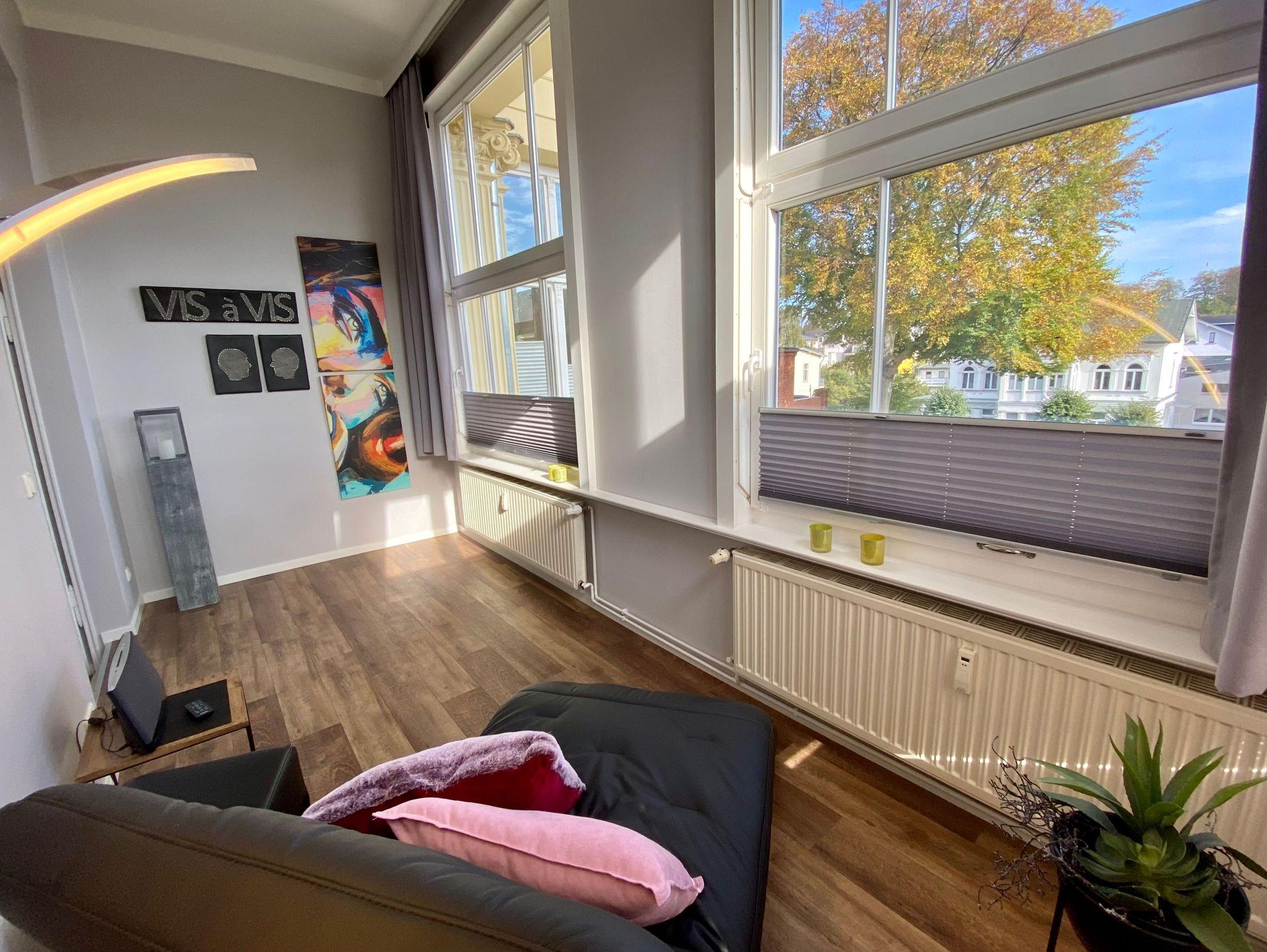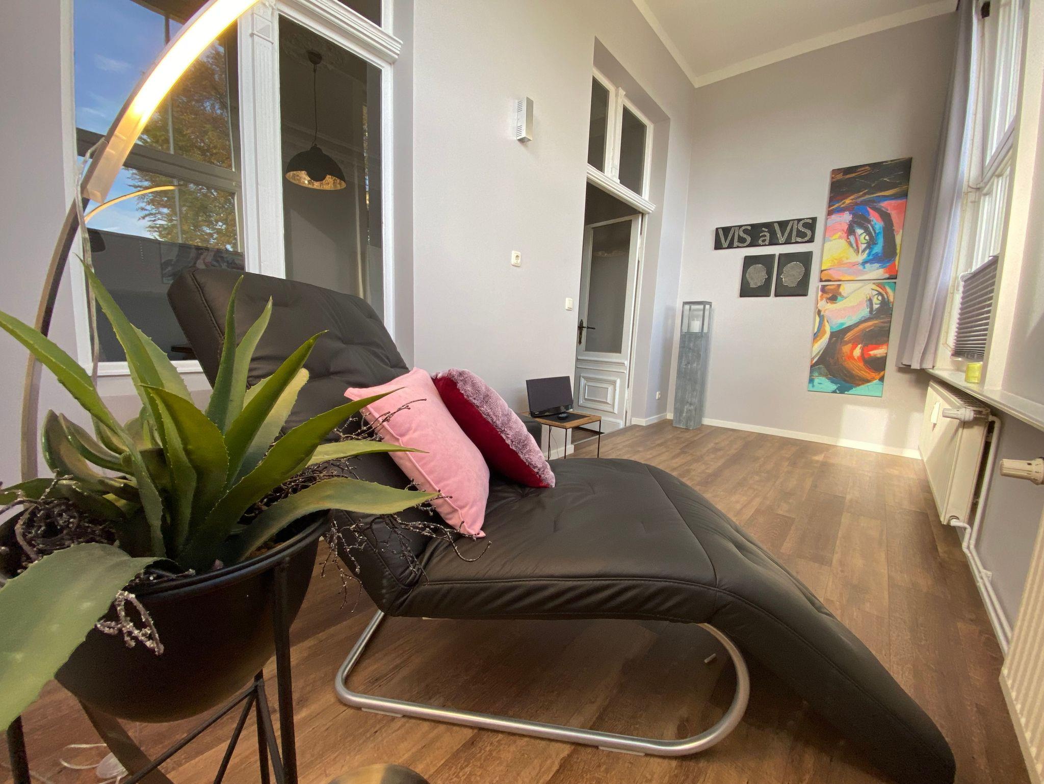 Die liebevoll sanierte Zweiraum- Ferienwohnung Vis à vis ist komplett mit hochmodernem Designbelag ausgelegt. Die Vis à vis überzeugt durch stilvolle Einrichtung und überraschende Elemente wie einen Schaukelstuhl in der Veranda.Die Betten sowie die gesamte Ferienwohnung sind allergikergerecht. Die Ferienwohnung ist mit moderner Technik ausgestattet und bietet viel Platz und Raum zum Entspannen. In der Komplettküche können die Gäste alle Speisen selbst zubereiten und am Tresen gleich probieren. Zur Ferienwohnung gehört ein passendes Bad in edlen Materialien und schickem Design. Unter der stylischen Regendusche wird Duschen zum Vergnügen.