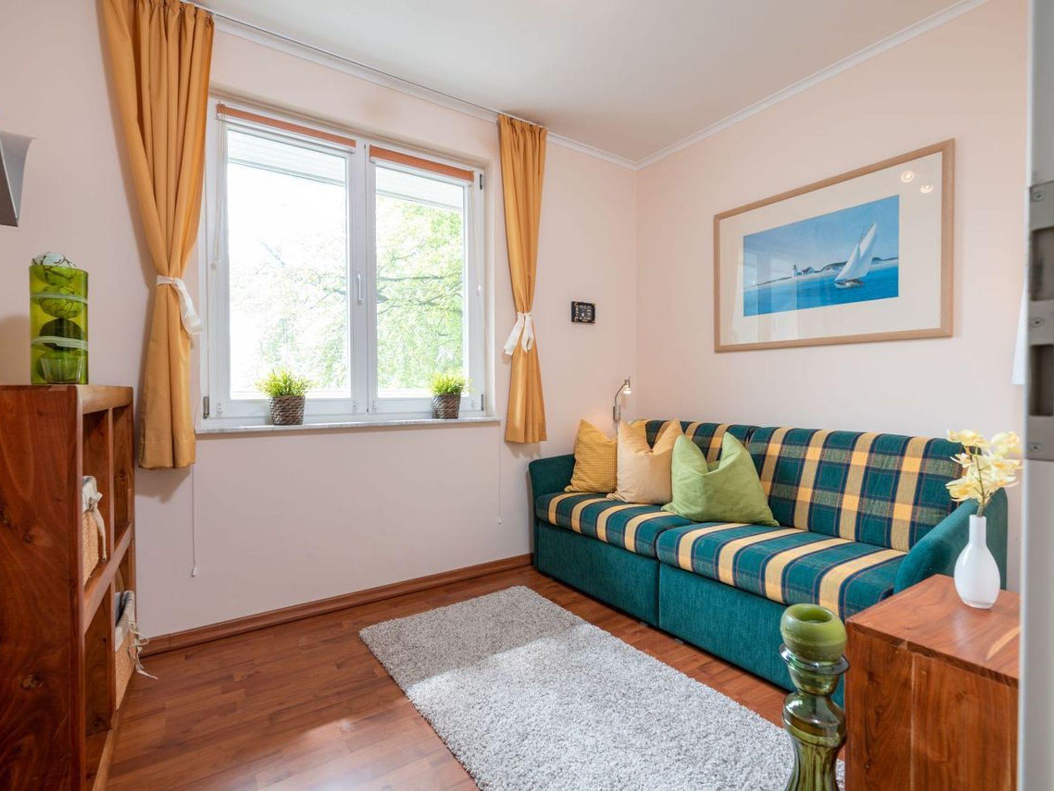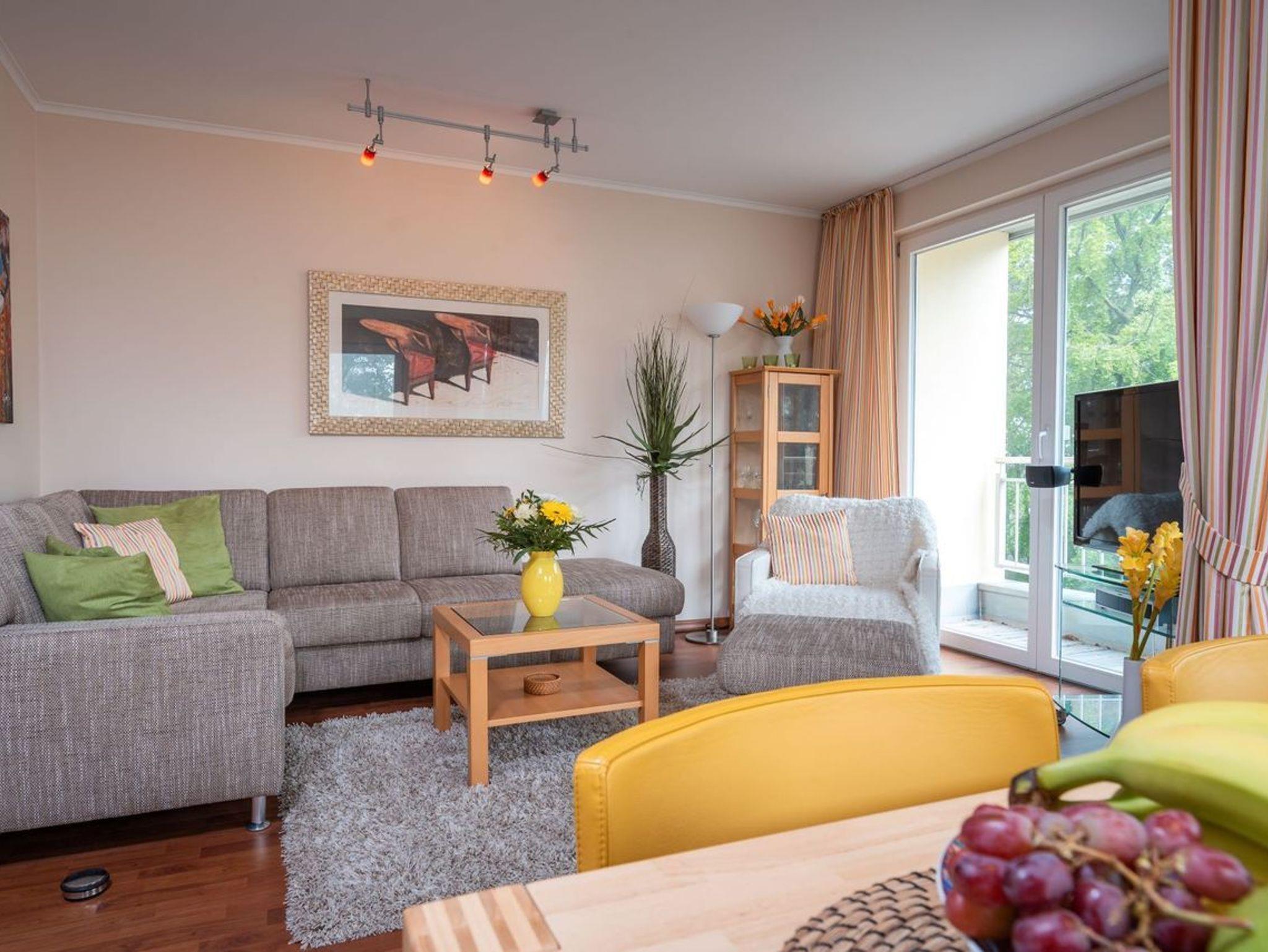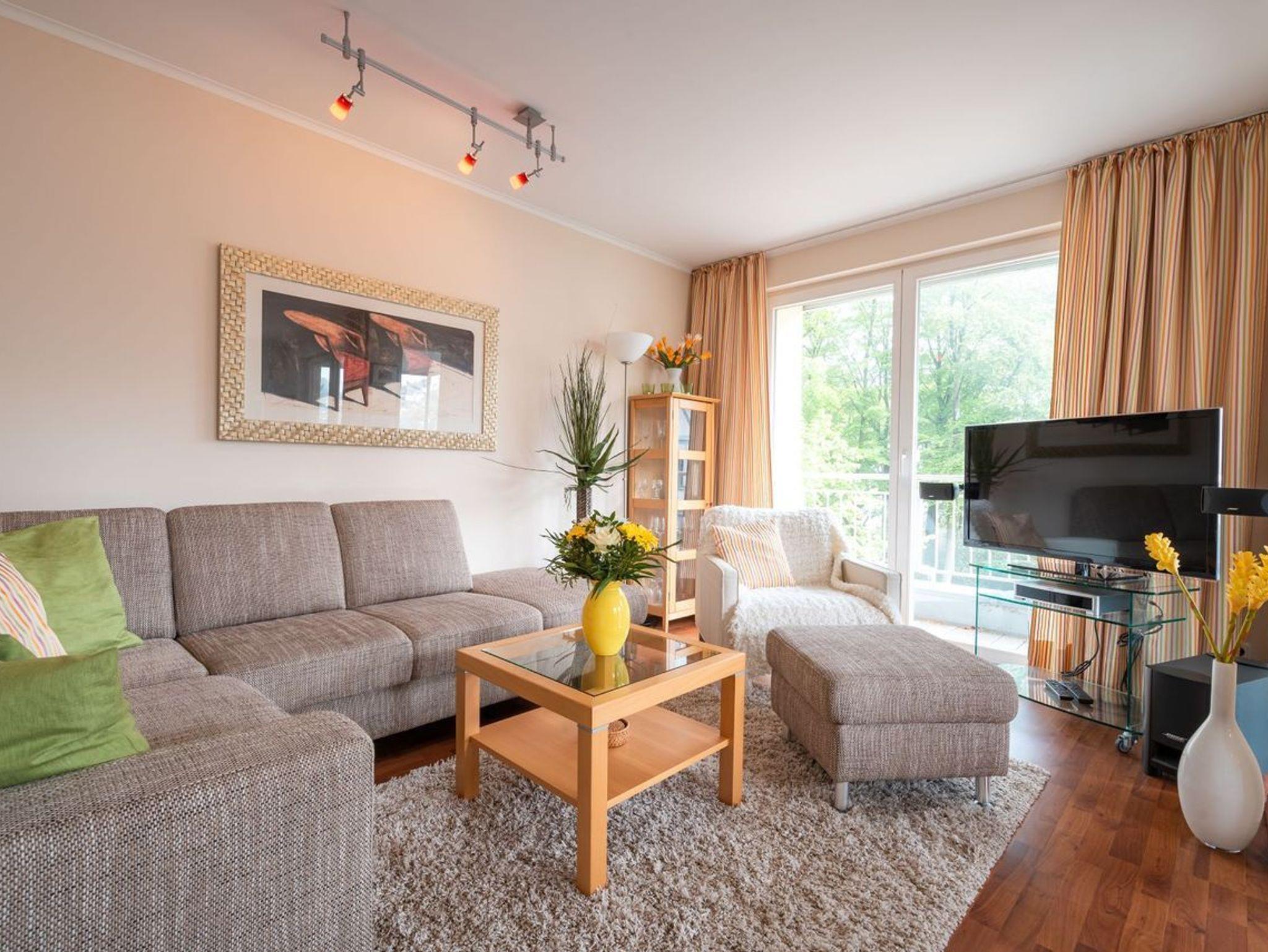 In dem geschmackvoll eingerichteten hellen Wohnbereich mit bequemer Couch und FlatTV erhalten Sie einen schönen Blick auf das Meer bzw. die Promenade von Heringsdorf.