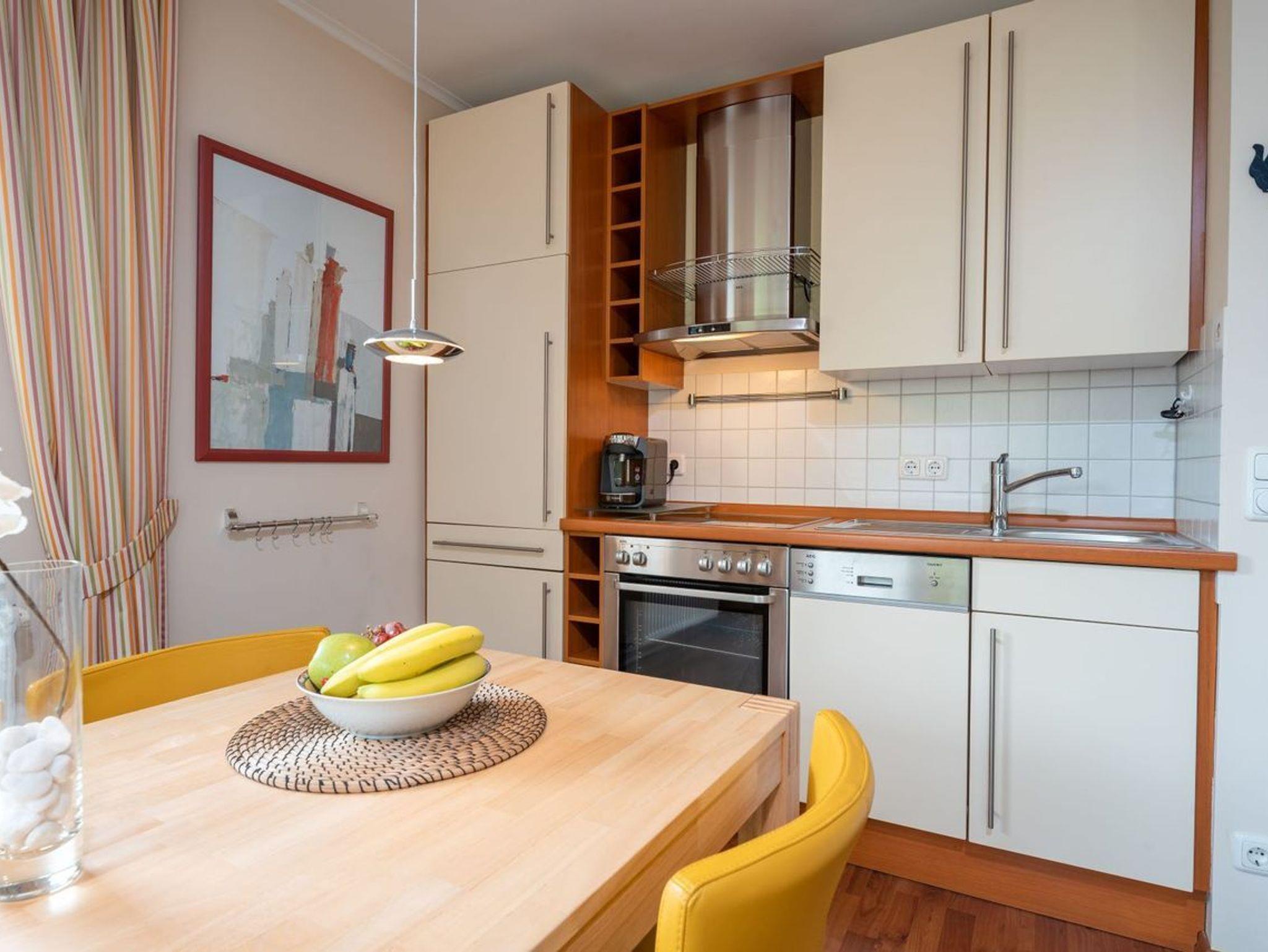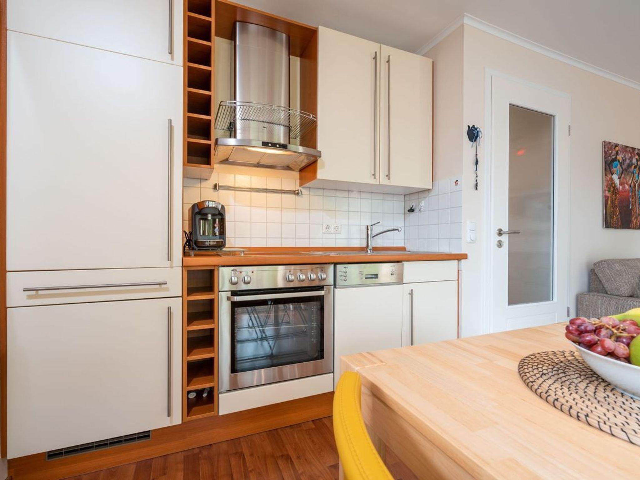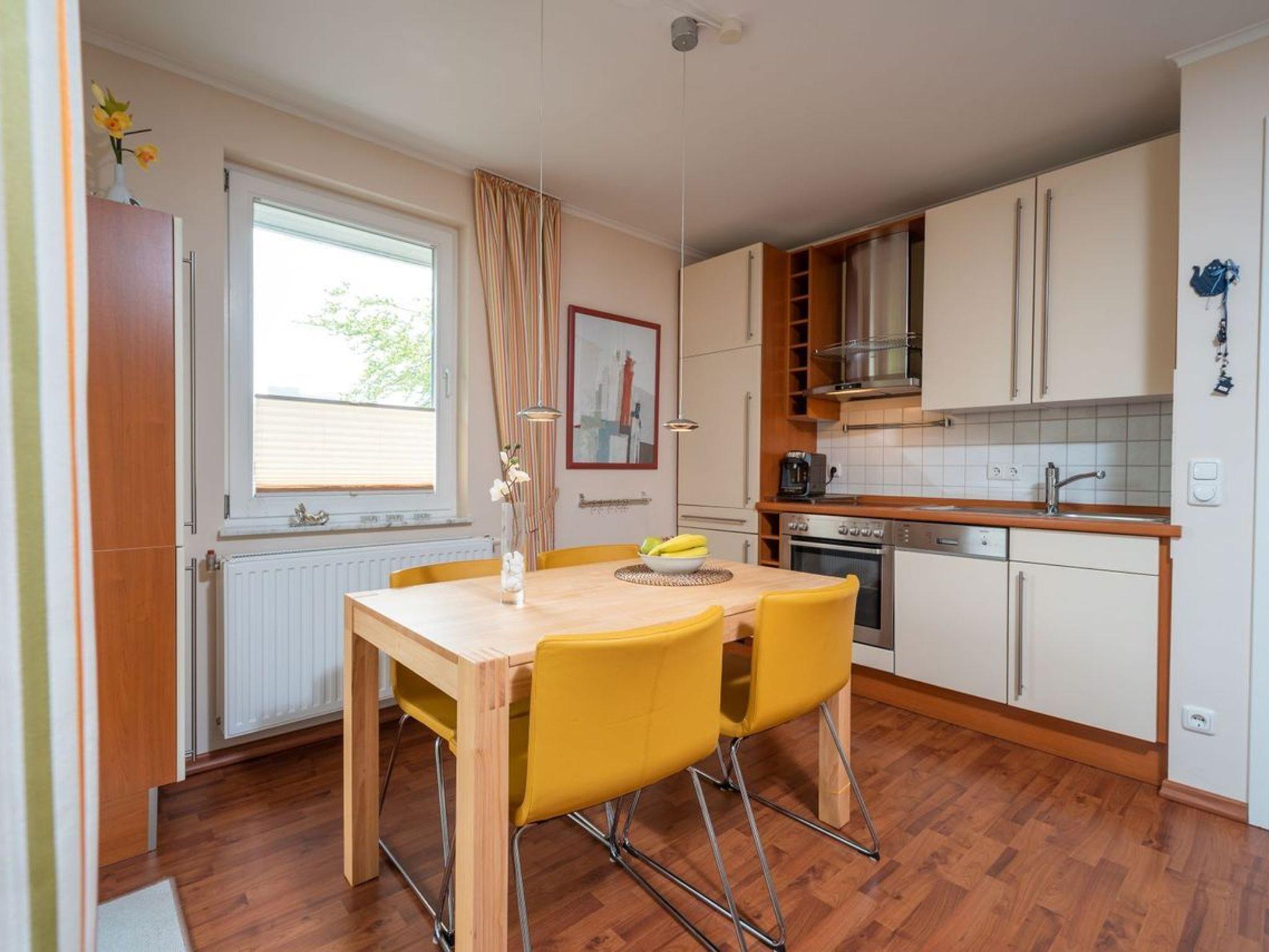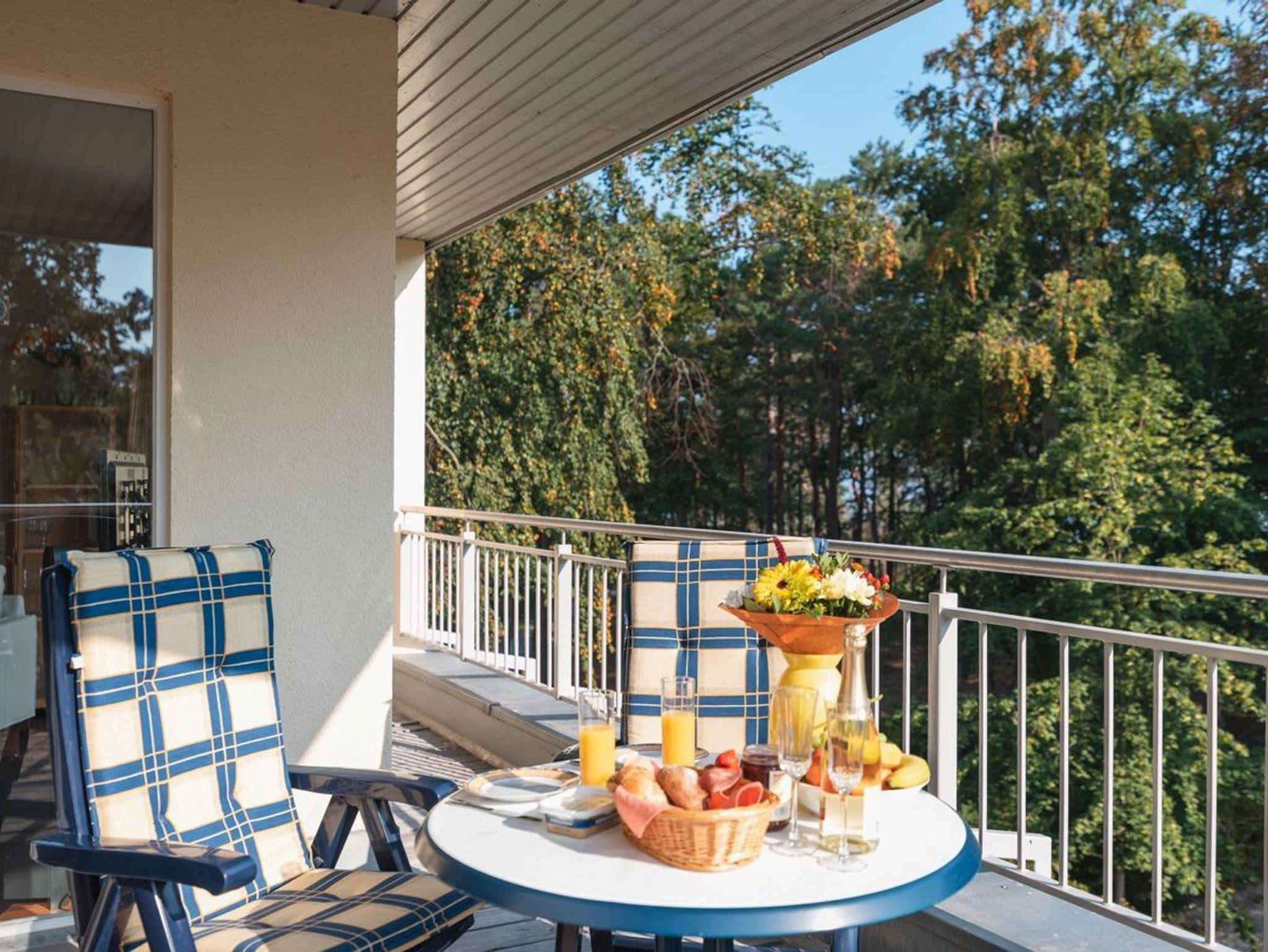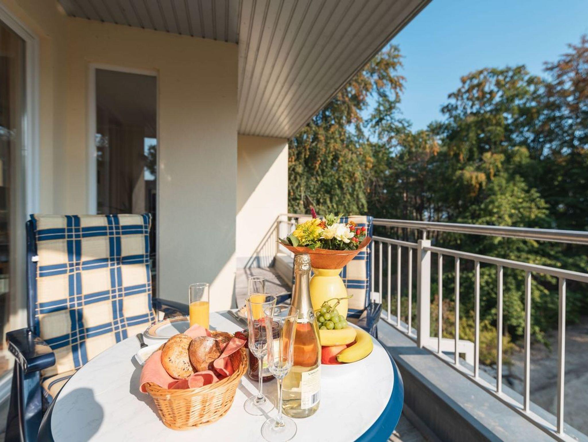 Hier befindet sich ebenfalls der Essbereich sowie die offene, voll ausgestattete Küchenzeile. Dank Backofen, Kühlschrank mit Gefrierfach, Geschirrspülmaschine, Mikrowelle, Wasserkocher, Toaster und Kaffeemaschine können Sie auch während Ihrer Urlaubszeit sich all Ihre Lieblingsspeisen zubereiten. Ihr Frühstück können Sie von hier aus direkt in der Morgensonne auf dem Balkon ungestört einnehmen. Durch den komplett umlaufenden Balkon haben Sie ebenfalls die Möglichkeit, die Abendsonne auf der anderen Seite der Wohnung zu genießen. Ebenso können Sie direkt aus dem Schlafzimmer auf den Balkon austreten, der Platz für 2 Stühle bietet. Im gemütlichen Schlafzimmer befindet sich ein Doppelbett, ein großer, moderner Kleiderschrank und FlatTV sowie der direkte Zugang auf den Balkon. Das zweite kleinere Zimmer besitzt eine hochwertige und bequeme Schlafcouch, die bei der Aufbettung bereits für Sie bezogen ist. Das innenliegende Bad ist mit Dusche und WC ausgestattet und verfügt über eine zu öffnende Lichtkuppel.