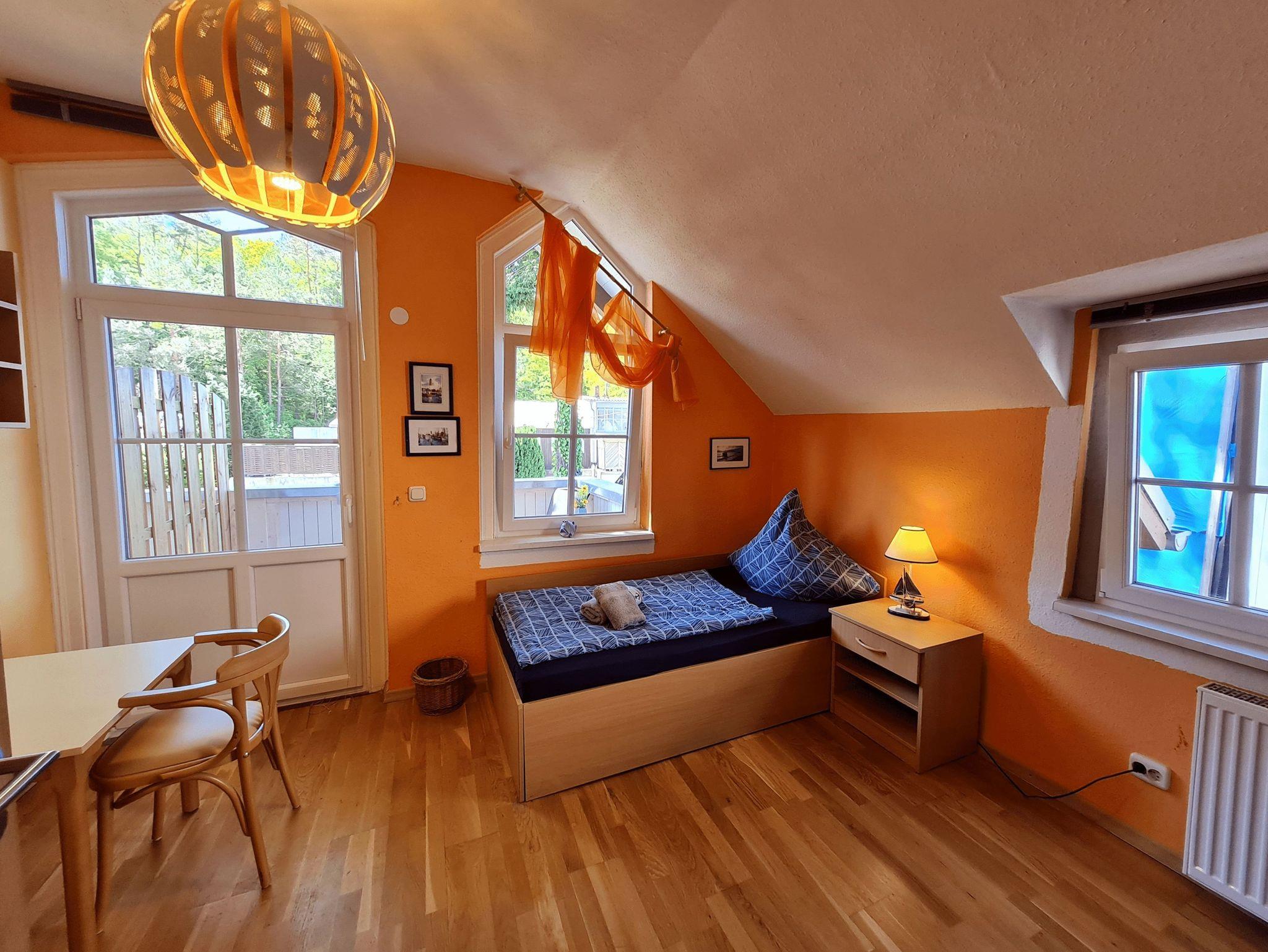 Das kleine, aber feine Appartement 2 bietet Platz für 1 Person mit Kleinkind bis 3 Jahre und befindet sich im Obergeschoß des Hauses. Ähnlich wie das Appartement 1 besteht die Wohnung aus einem kombinierten Wohn- und Schlafraum mit einem Einzelbett, sowie einem kleinen Badezimmer mit Dusche und WC. Eine Küche haben Sie in dem Appartement nicht, jedoch steht Ihnen ein Wasserkocher, eine Kaffeemaschine und ein Mini-Kühlschrank zur Verfügung.