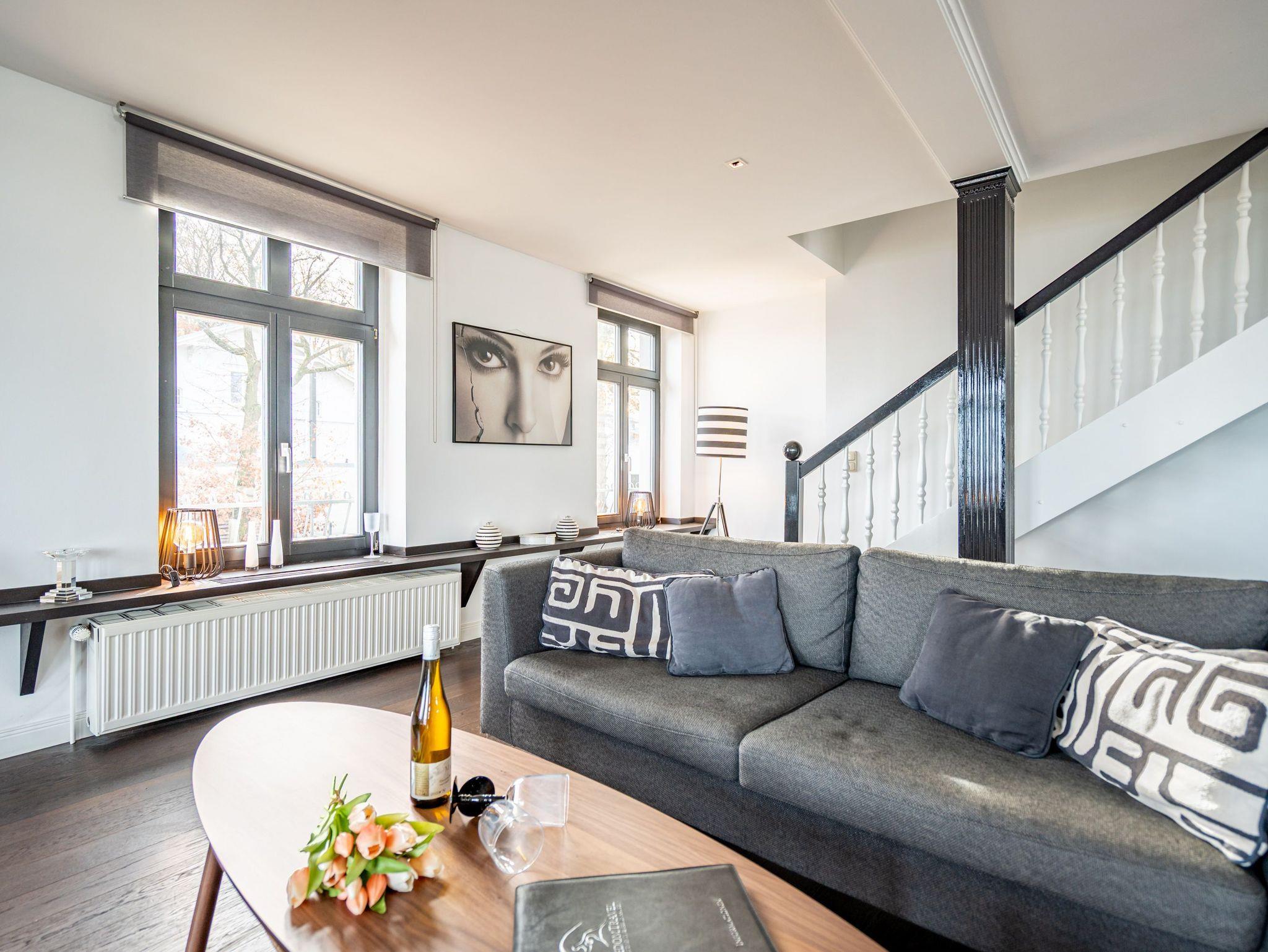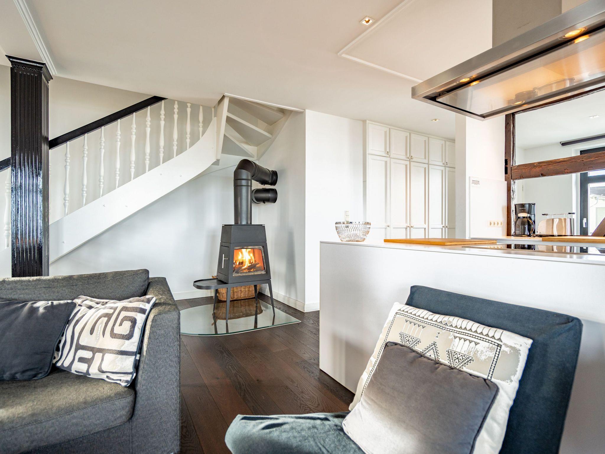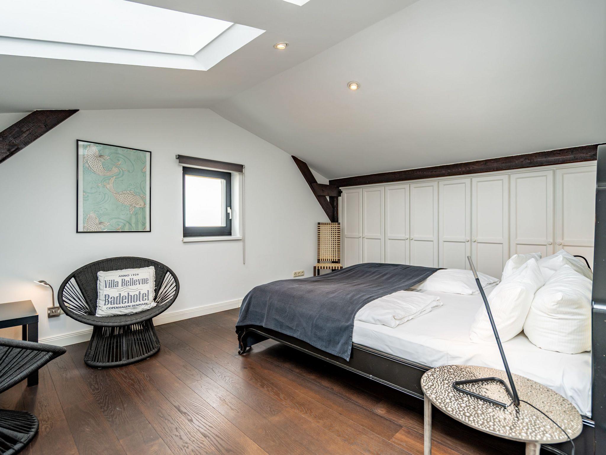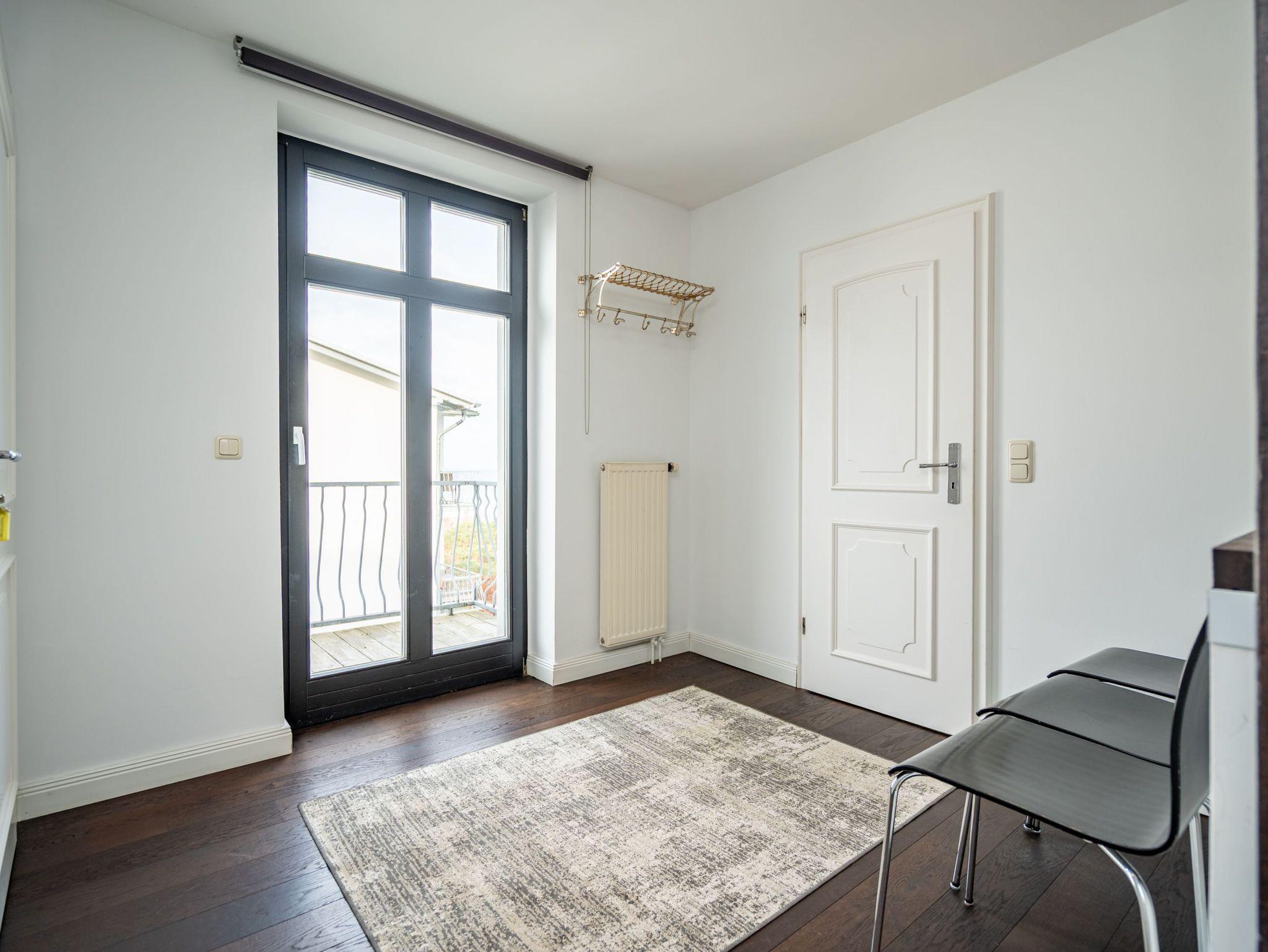 Black [&] White. Urbanes, frisches Leben, mitten in Heringsdorf. Für alle, die Außergewöhnliches lieben! Schwarzes Eichenparkett, stilvolle, moderne Möbel, ausgesuchte Designerstücke und dazu ein grandioser Meerblick. Die üppige 104 qm Maisonnette-Ferienwohnung hat noch mehr zu bieten. Ein großzügiger Wohnbereich mit Kamin und einer offenen, komplett ausgestatteten Küche empfängt Sie im unteren Bereich der Wohnung. Hier befindet sich auch das stilvolle Bad mit Badewanne und Dusche. Natürlich auch mit Meerblick. Zwei Balkone bieten Freiraum zum Sonne tanken. Unter dem Dach, in der zweiten Etage gibt es zwei Schlafzimmer. Das Kleinere gemütlich unter der Dachschräge mit einem Doppelbett (1,40m) und einer Schlafmatratze für ein Kleinkind. Das größere Schlafzimmer mit etwas mehr Platz, eigenem WC und frei stehendem Waschtisch, Schlafecke für ein Kind und einer Sauna mit Meerblick. Ein perfektes Hideway für 4 Erwachsene und zwei Kleinkinder (bis 3 Jahre). Ein PKW-Stellplatz steht auf dem abgeschlossenen Grundstück zur Verfügung.