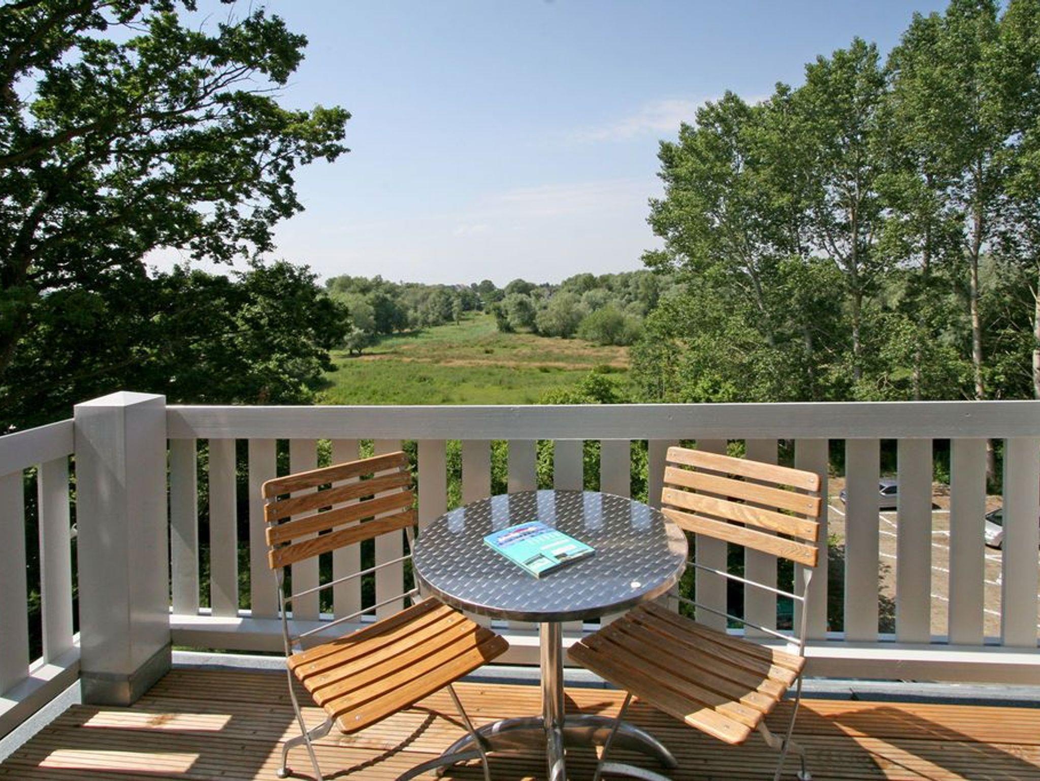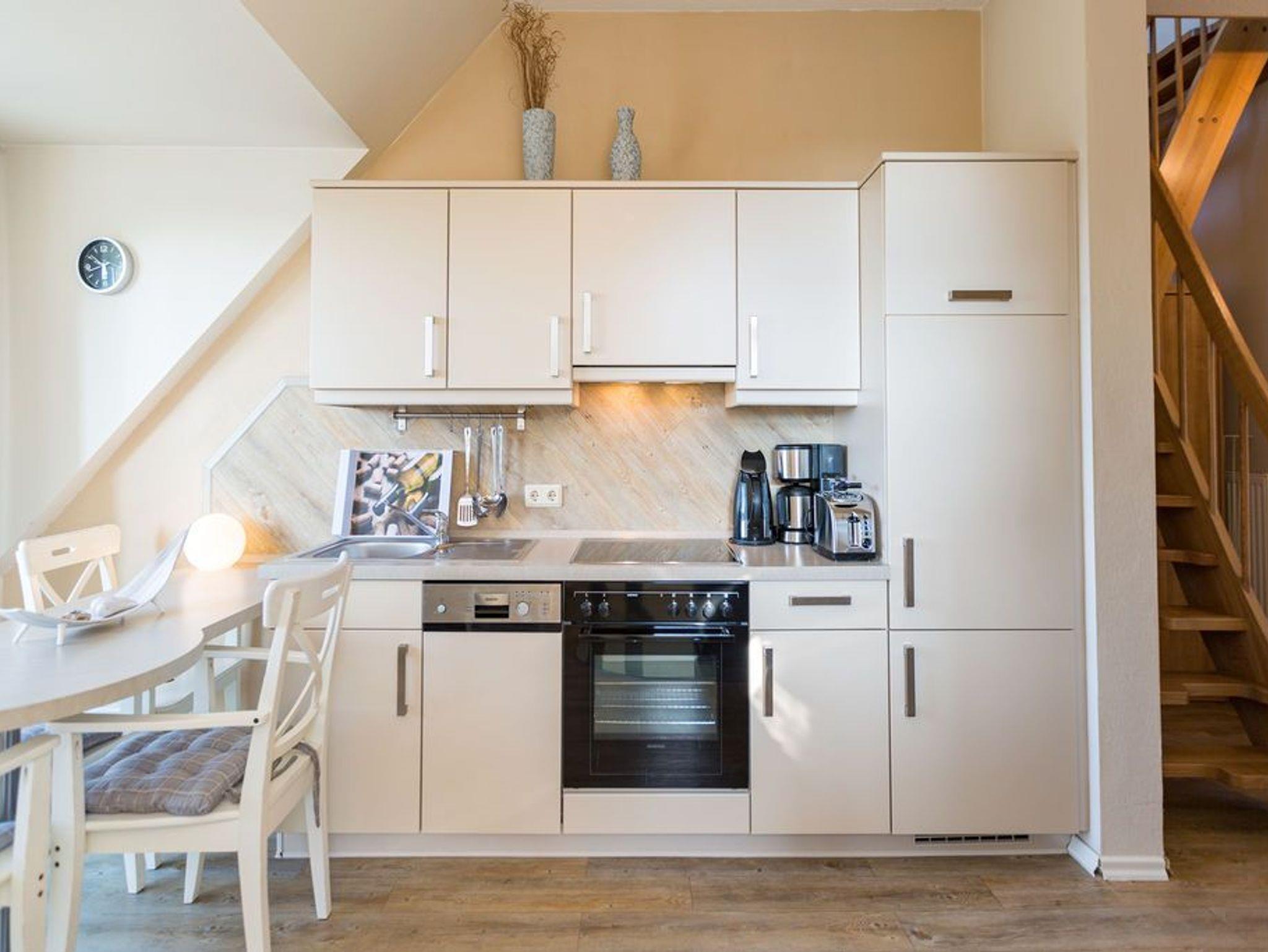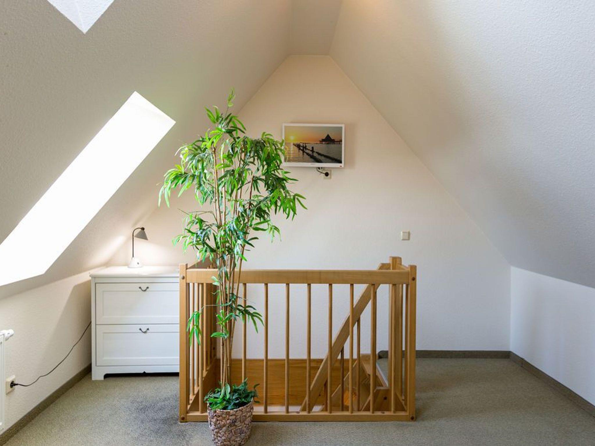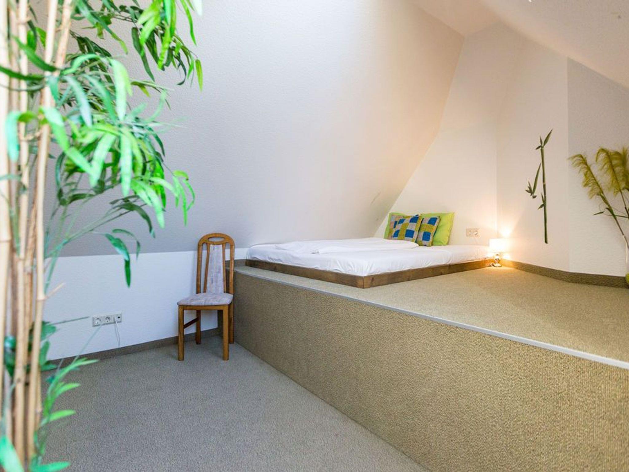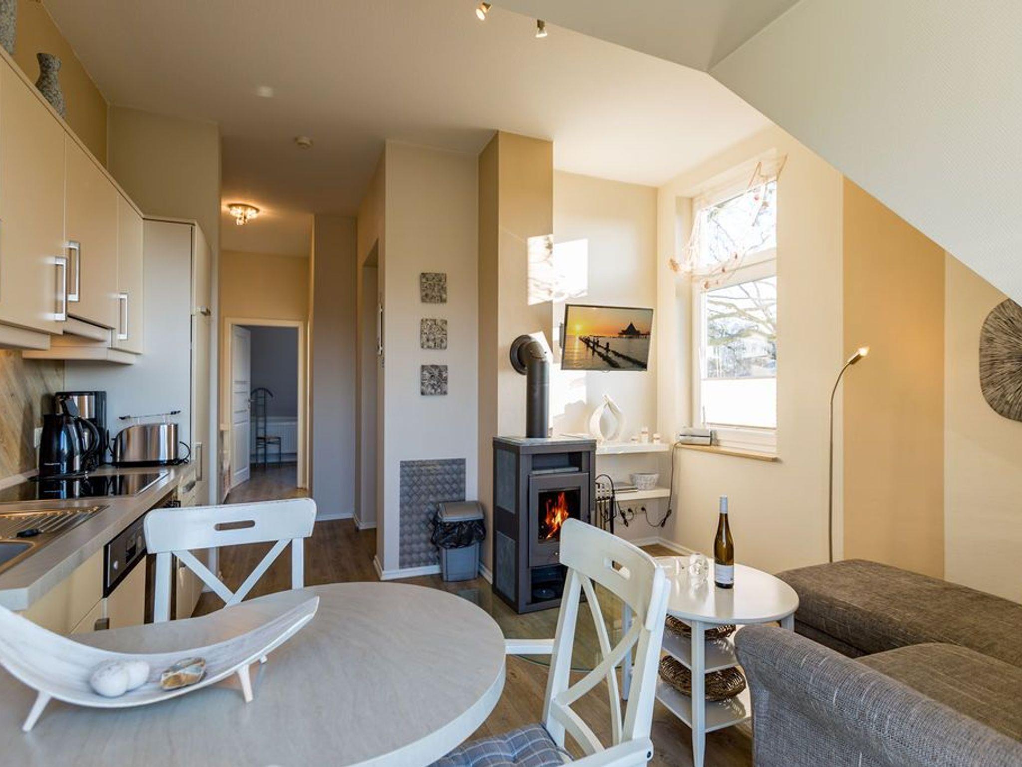 Modern. Lichtdurchflutet. Stilsicher - so empfängt Sie die Ferienwohnung (57qm) im Obergeschoss des Hauses für 2 Personen und ein Kleinkind (bis 3 Jahre). Sie fahren mit dem Fahrstuhl direkt in Ihre Wohnung. Hier ankommen erreichen Sie den Wohnbereich mit offener Küche und Kaminofen. Ein Schlafzimmer mit Boxspringdoppelbett (1,60m x 2,00m) und eigenem, großzügigen Balkon und ein Bad mit Dusche und WC befindet sich auf der gleichen Etage. Direkt unter dem Dach befindet sich eine Kuschelecke mit TV, die über eine kleine (aber steile) Treppe zu erreichen ist. Ein zweiter Balkon zur Südseite mit Blick ins Grüne lädt besonders in den Nachmittagsstunden zum Entspannen ein. Der Kaminofen verspricht besonders in der kalten Jahreszeit angenehme Stunden. Auf Wunsch stellen wir für unsere kleinen Gäste ein Kinderreisebett (ohne zusätzliche Matratze [&] Bettzeug) und einen Kinderhochstuhl ( gegen einen Aufpreis) zur Verfügung.