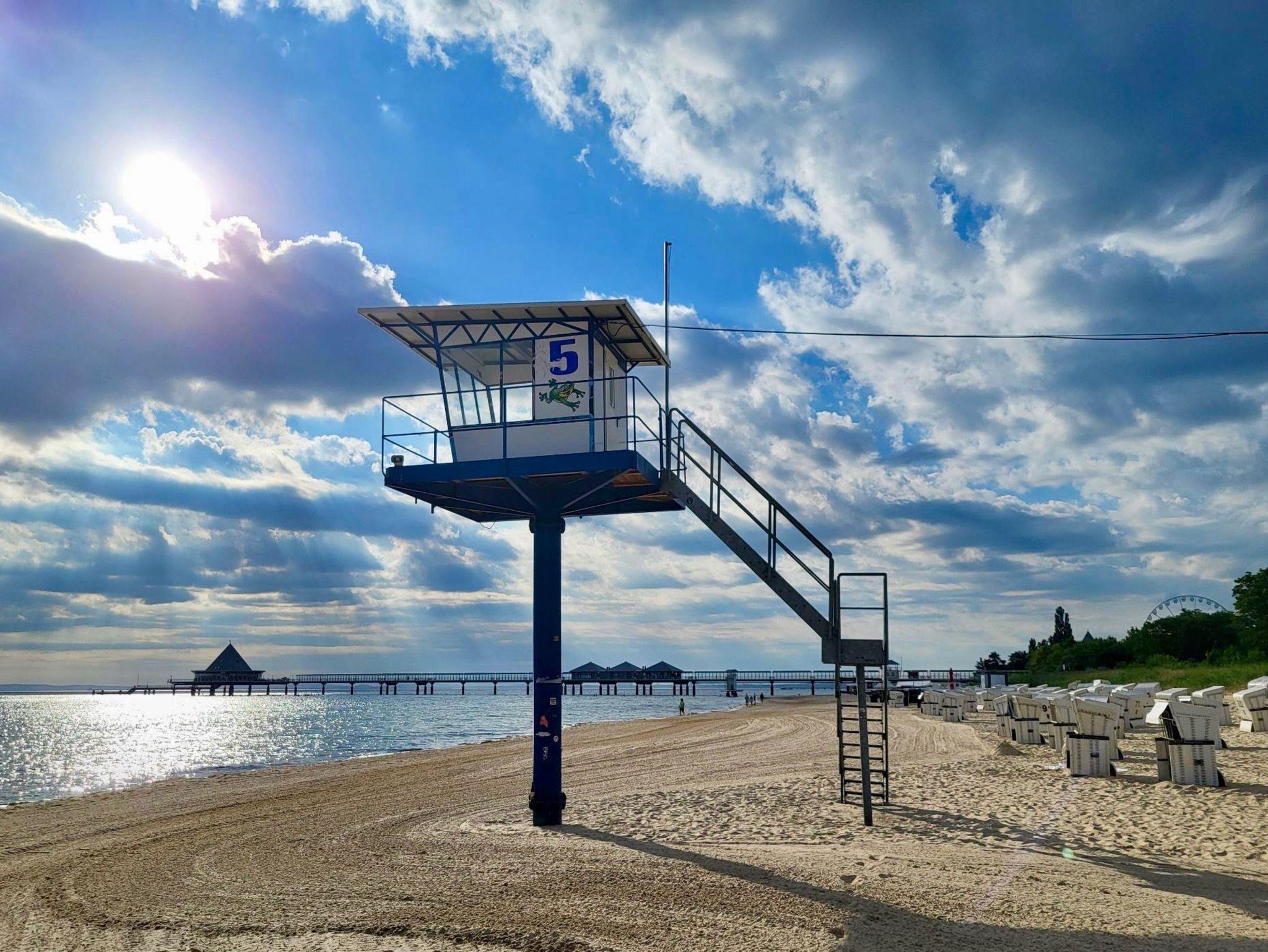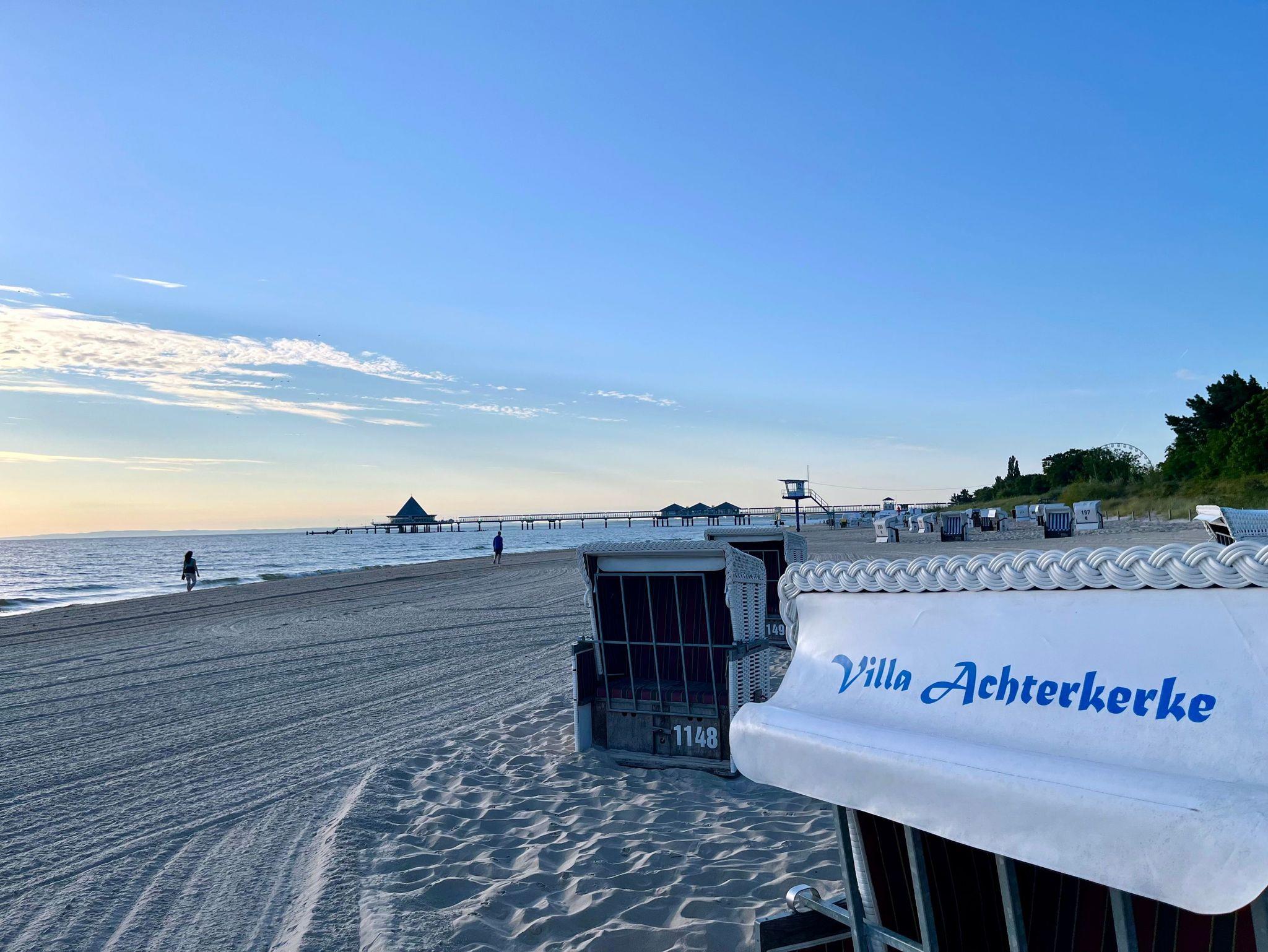 Auf dem Grundstück führt eine Treppe hinunter in den Kurpark und an den breiten, weißen Sandstrand. Hier bieten wir Ihnen von Mai bis September die Möglichkeit - noch vor Reiseantritt - einen unserer 4 Strandkörbe zu reservieren (70 €/Woche). Unser Strandabschnitt liegt etwas ruhiger, abseits vom quirligen Strandleben rund um die Seebrücke. Restaurants sowie Möglichkeiten zum Bummeln und Shoppen gibt es in der Kulmstraße und im wenige Schritte entfernten Ortszentrum.