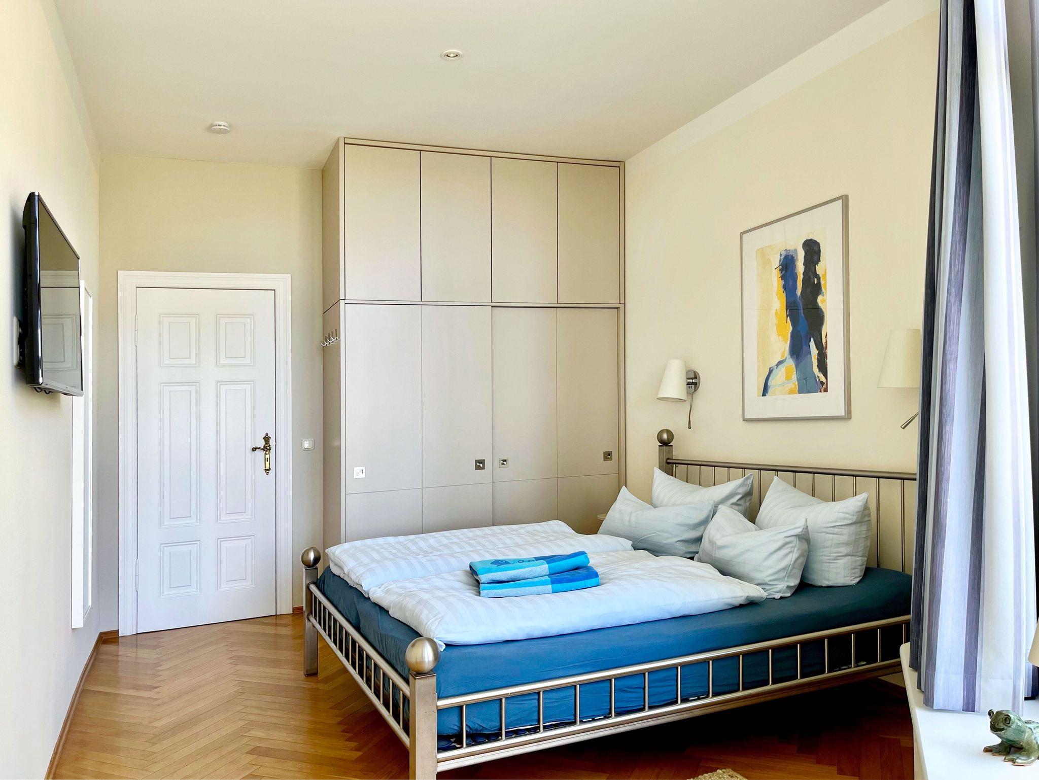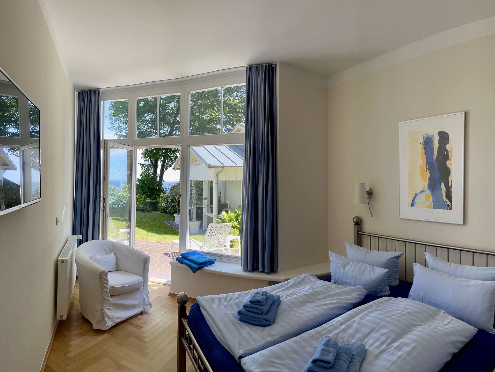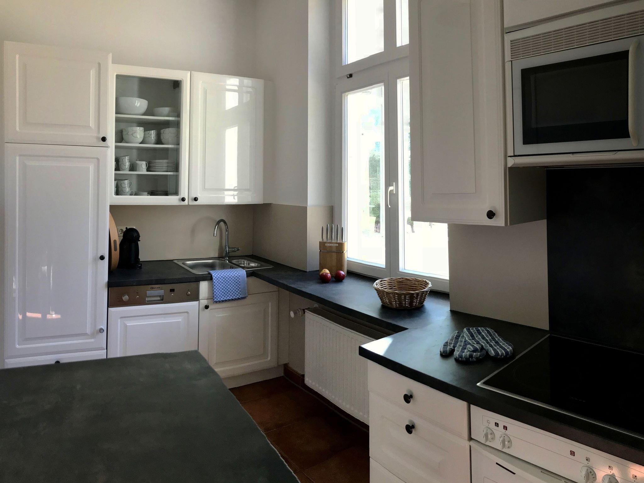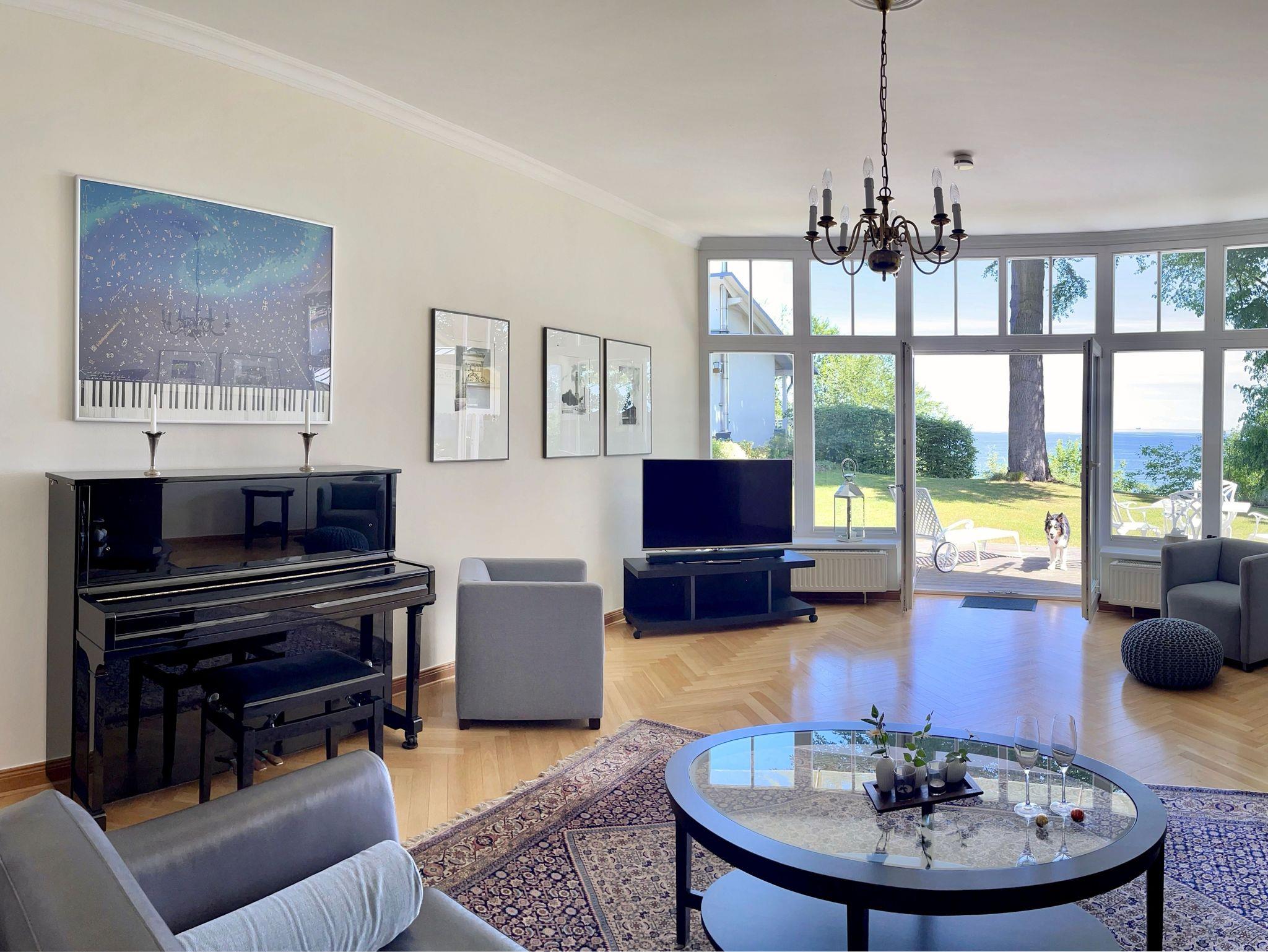 Sie bewohnen großzügig eine komplette Etage der Villa mit zwei Schlafzimmern und Bädern. Dabei genießen Sie die vorteilhafte Ausrichtung des Hauses mit dem herrlichen Meerblick auf der Nord-Ost-Seite und dem historischen Verandenvorbau auf der Süd-West-Seite, mit Sonnenschein bis in die Abendstunden. Da eine Etage aus zwei miteinander verbundenen Wohnungen besteht, kann durch Schließen der zweiflügeligen Verbindungstüren eine Trennung der Wohnbereiche vorgenommen werden. Ausgesuchte Möbelstücke und Bilder, Echtholz-Parkett - teils mit hochwertigen Teppichen belegt ? prägen den Stil des Hauses. Die Meerblick-Schlafzimmer sind mit manufakturgefertigten Edelstahlbetten, Einbauschränken incl. Safe, Flachbild-TV sowie Verdunklung und Insektenschutz ausgestattet. Komfortable Leder(Schlaf)couches in den Wohnzimmern können als zusätzliche Schlafgelegenheiten genutzt werden. Zum Inventar gehören weiterhin Smart-TV`s mit Soundbar - zur einfachen Verbindung mit dem Smartphone, iPad oder einem anderen bluetoothfähigen Gerät - sowie DVD-Player. Es steht eine komplett ausgestattete, in sich abgeschlossene Küche (Kühlschrank mit Gefrierfach, Backofen, Cerankochfeld, Dunstabzug, Mikrowelle, Toaster, Wasserkocher, Filter-Kaffeemaschine u. Nespresso-Kapselmaschine, Rührgerät etc.) zur Verfügung. In den meerseitigen Wohnbereich ist eine weitere komplett ausgestattete Küchenzeile integriert. Bei den Bädern handelt es sich um Tageslicht-Badezimmer, wobei ein Bad zusätzlich mit einer Badewanne ausgestattet ist.