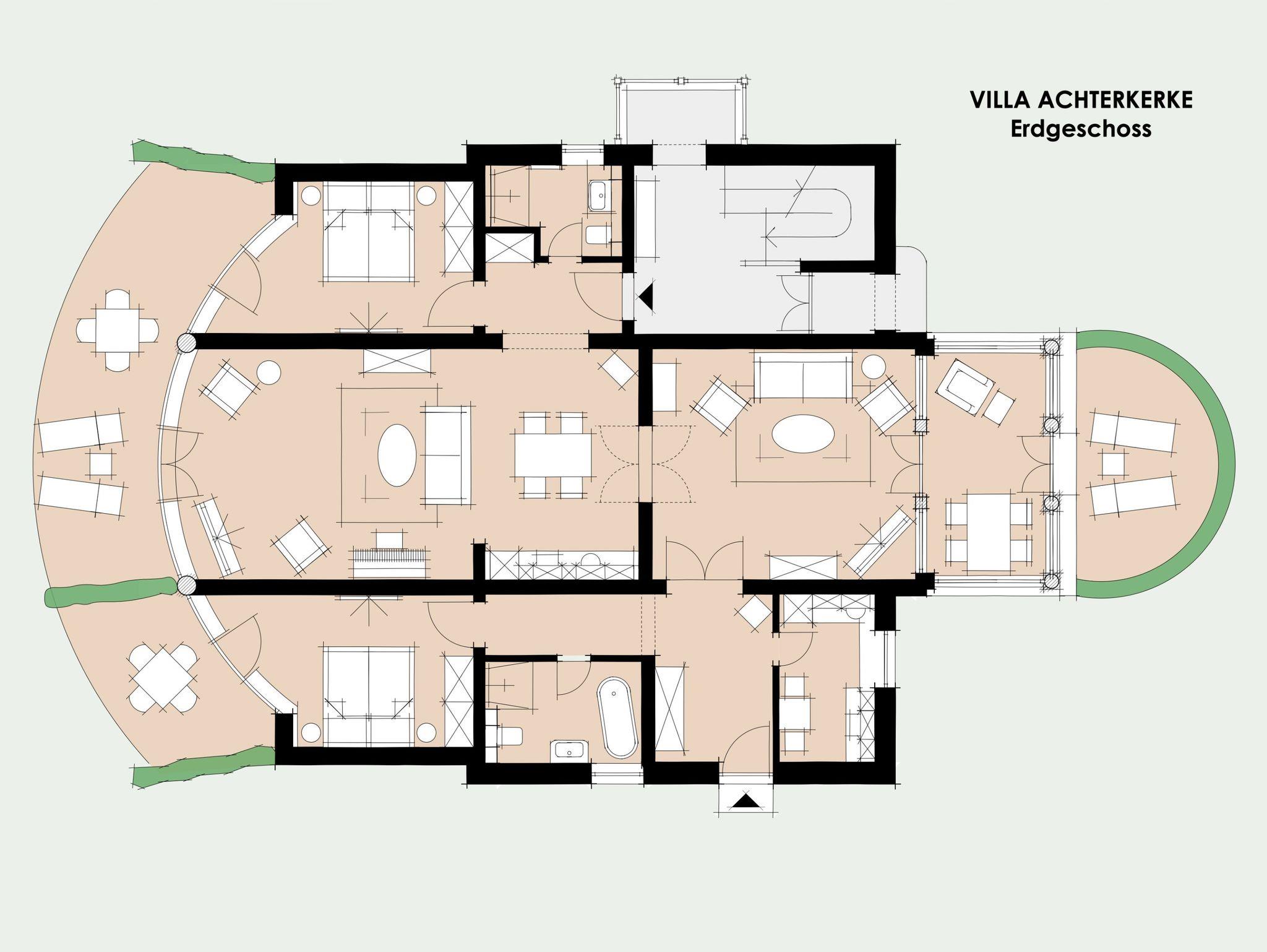 Sie bewohnen die komplette untere Etage der VILLA ACHTERKERKE mit ca. 170 qm Wohnfläche. Auf der Meerseite steht eine große Terrasse mit Gartenmöbeln zur Verfügung. Auf der Süd-West-Seite befindet sich ein wintergartenähnlicher Verandenvorbau mit Säulen und historischem Fliesenboden. Die Wohnung verfügt über einen separaten Nebeneingang mit Diele und Garderobe. Eines der beiden Wohnzimmer kann als drittes Schlafzimmer genutzt werden. Beide Bäder sind mit bodengleichen Duschen ausgestattet. Als besonderes Ausstattungsmerkmal der Erdgeschoss-Wohnung steht ein Klavier zur Verfügung.