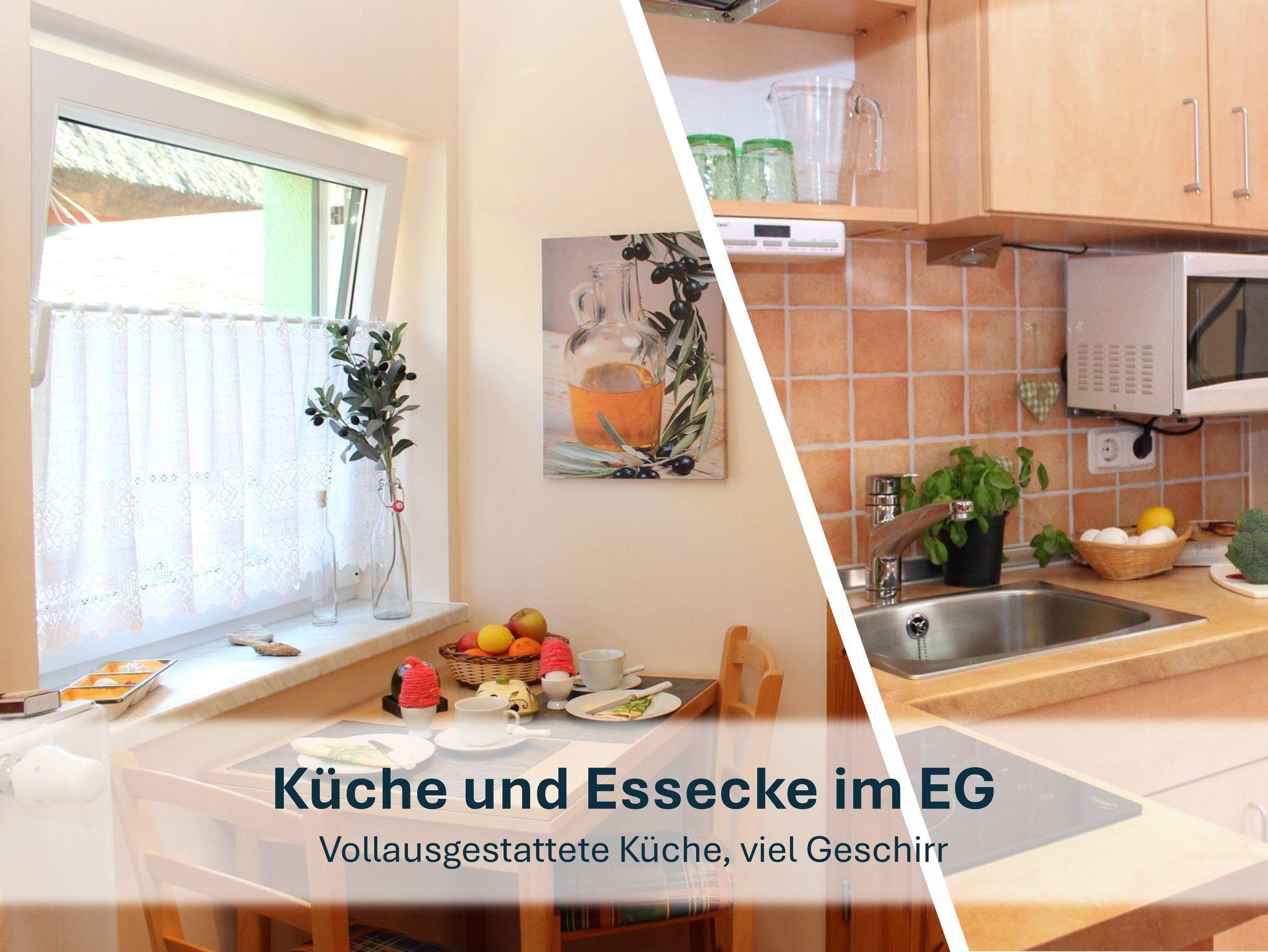 Im Erdgeschoss erwartet Sie eine voll ausgestattete Einbauküche (Backofen, Cerankochfeld, Kühlschrank), eine gemütliche Essecke sowie ein modernes Badezimmer mit Dusche - perfekt für erfrischende Momente nach einem Strandtag.
