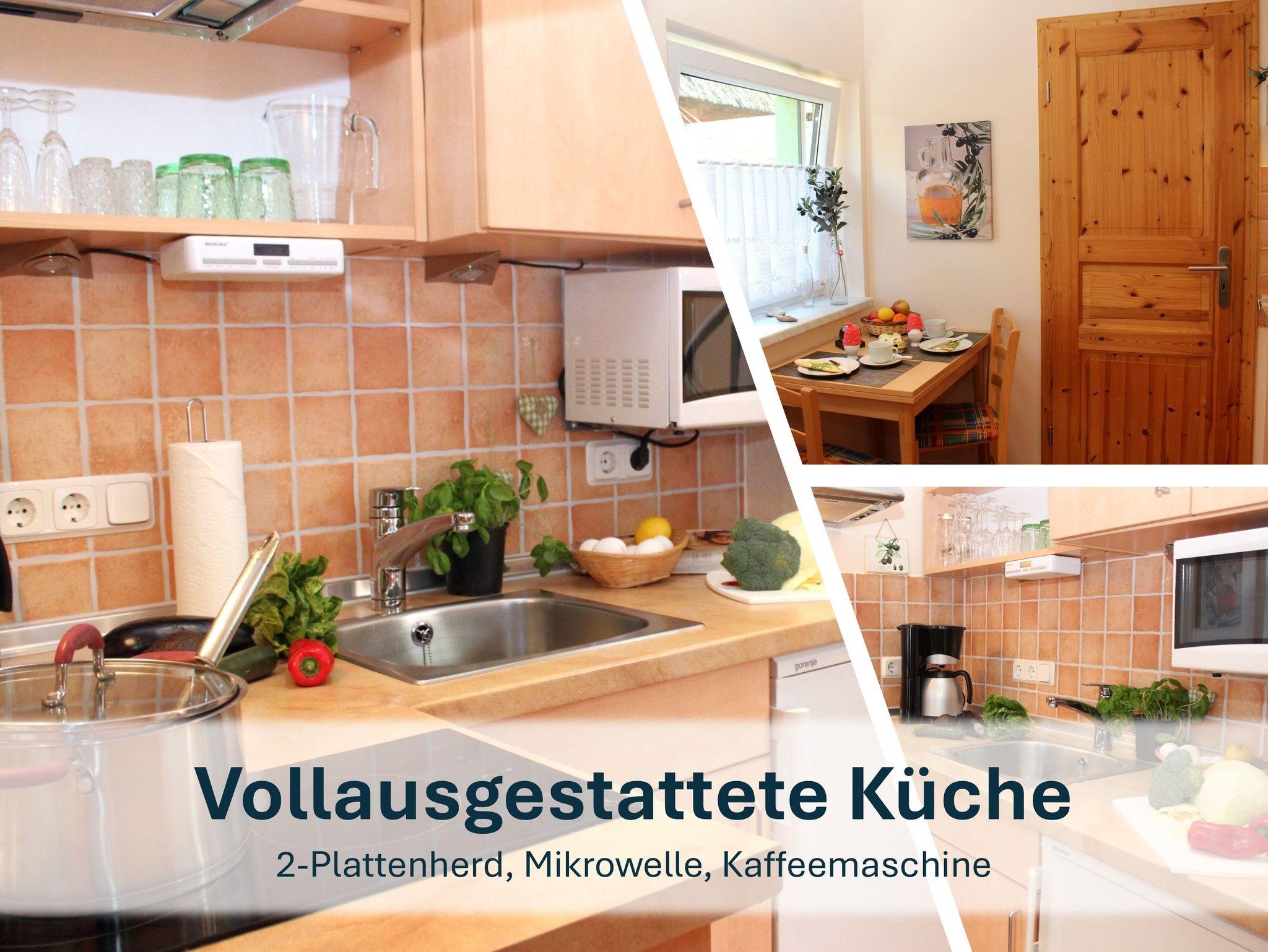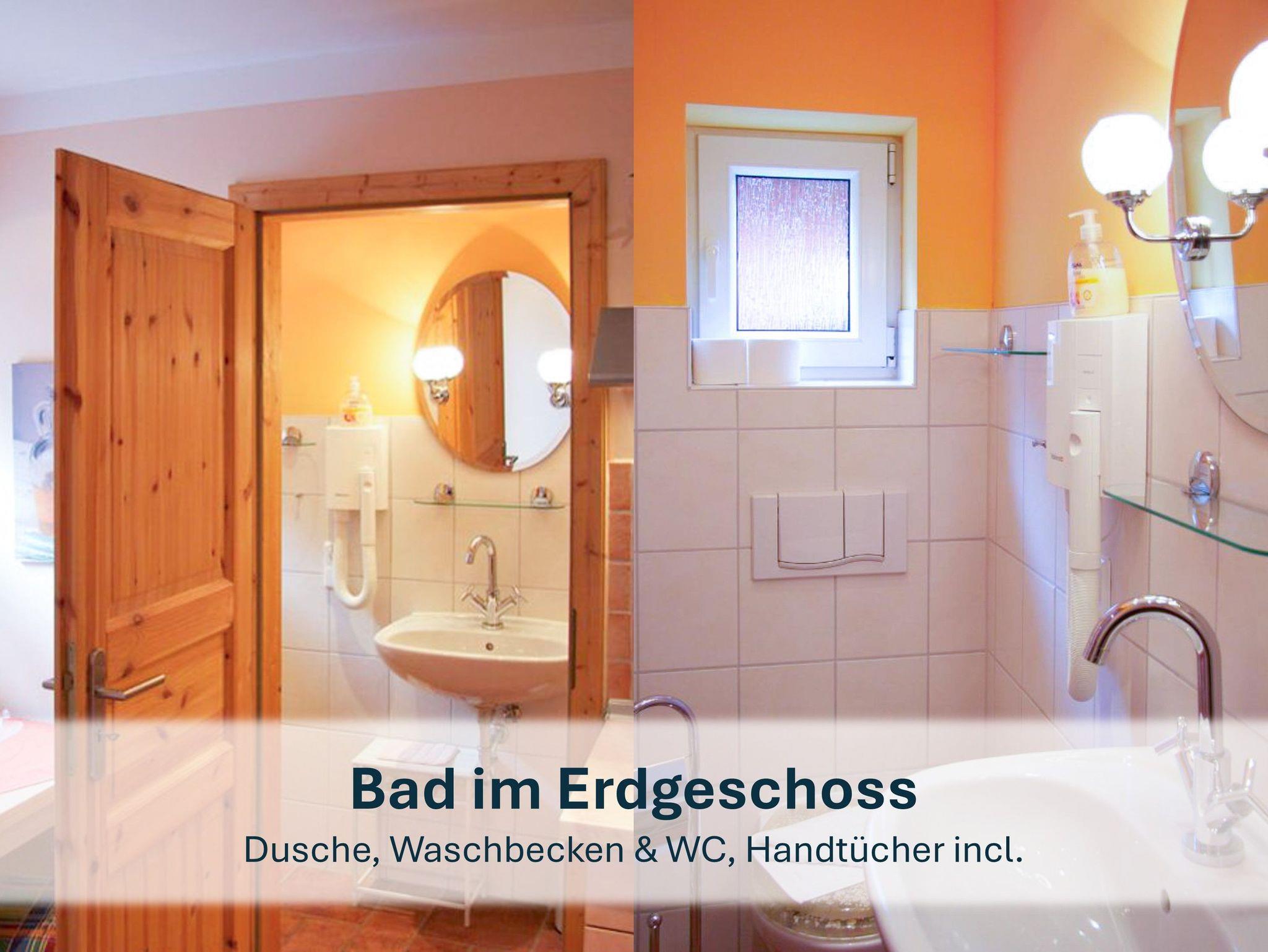 Im Erdgeschoss: moderne Küche und Badezimmer mit Dusche.