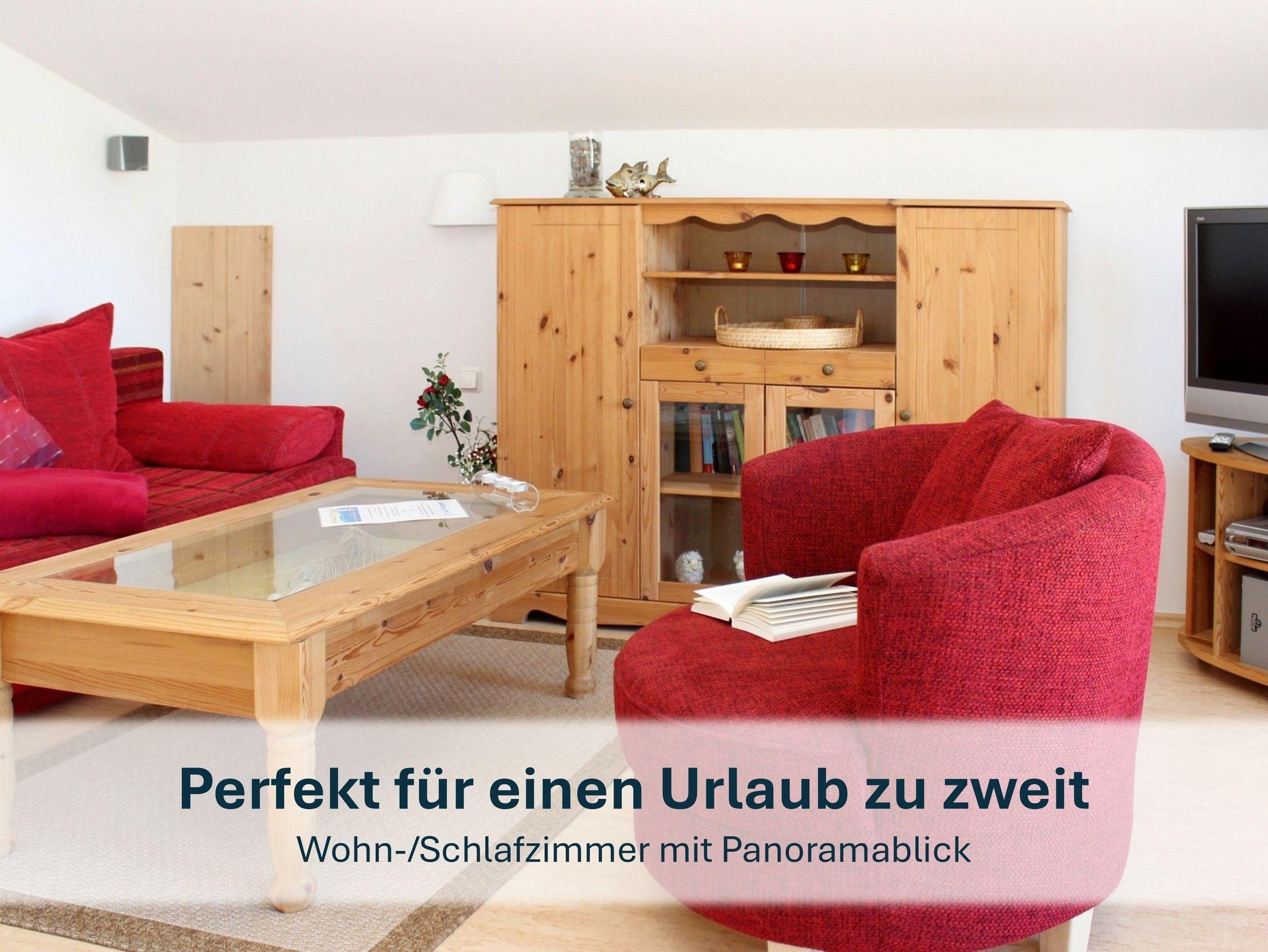 Im Obergeschoss: ein heller Wohn-/Schlafbereich mit gemütlichem Doppelbett, Couch und traumhaftem Ausblick.