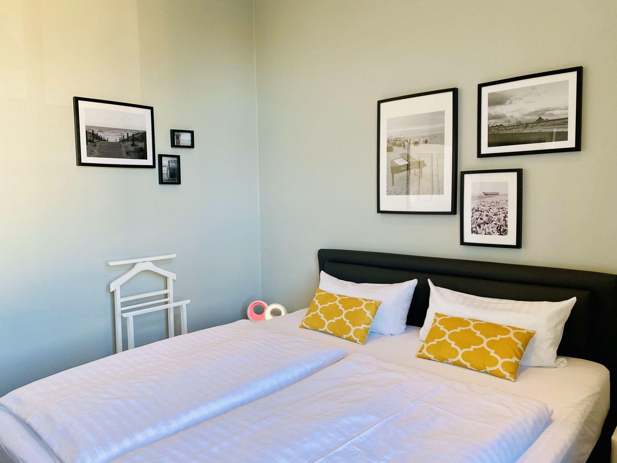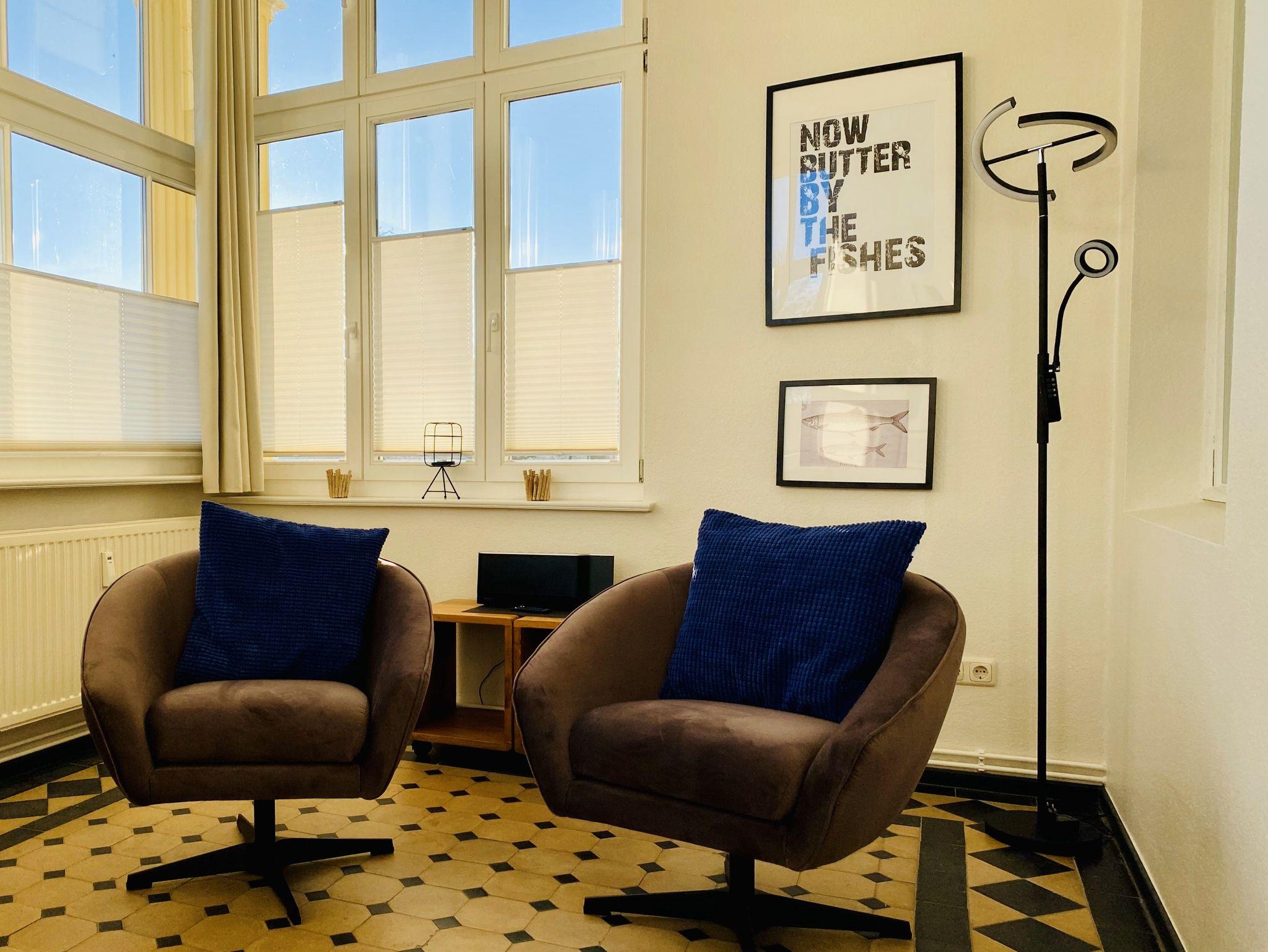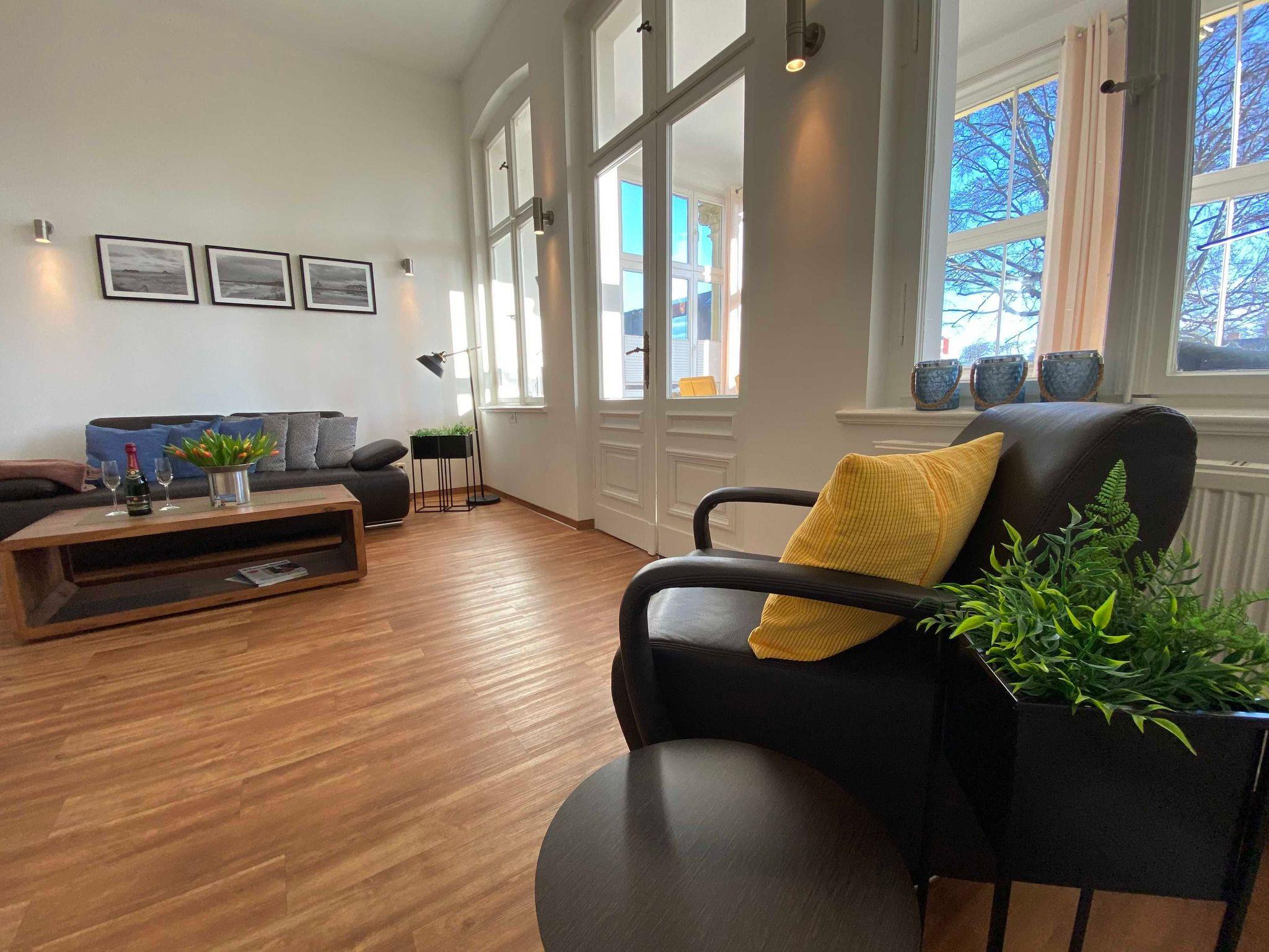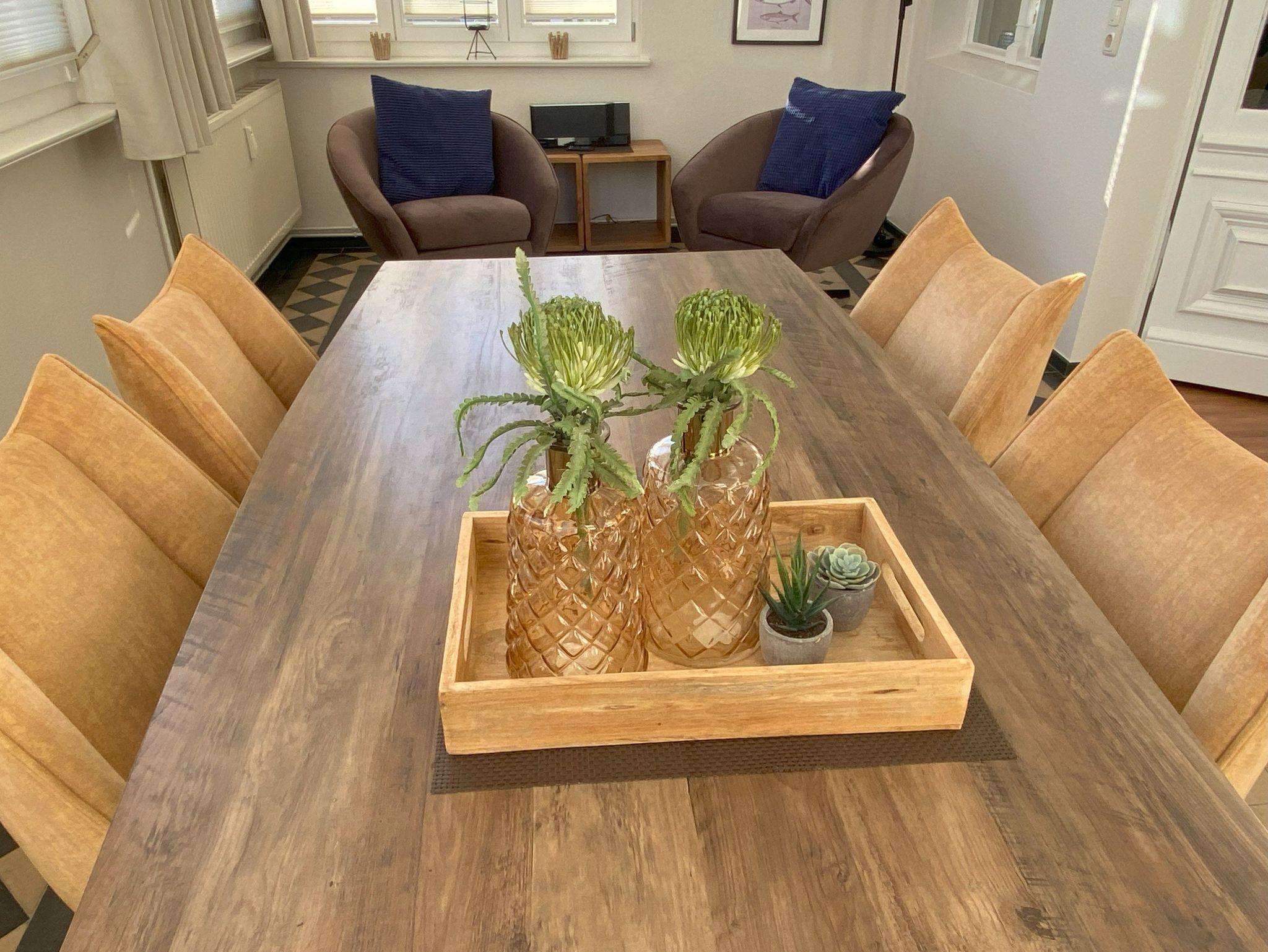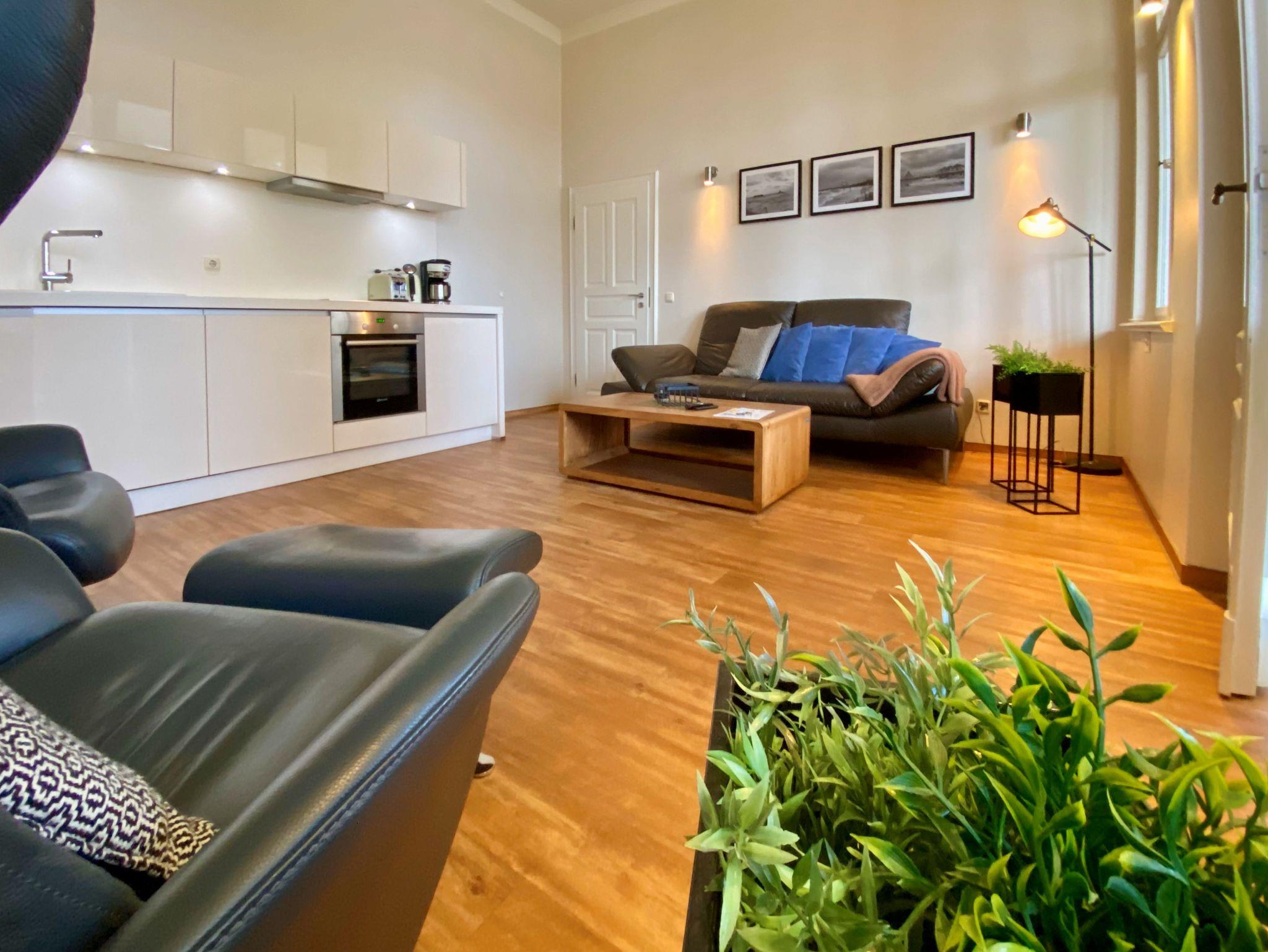 Auch der Anbau der Villa Anna wurde liebevoll saniert. Hier entstanden zwei schöne Ferienwohnungen, im Erdgeschoss die Kleine Anna, die ebenso modern und stilsicher eingerichtet wurde. Auf dem Grundstück gibt es pro Ferienwohnung einen Stellplatz und eine Aufladestation für E-Autos inklusive.