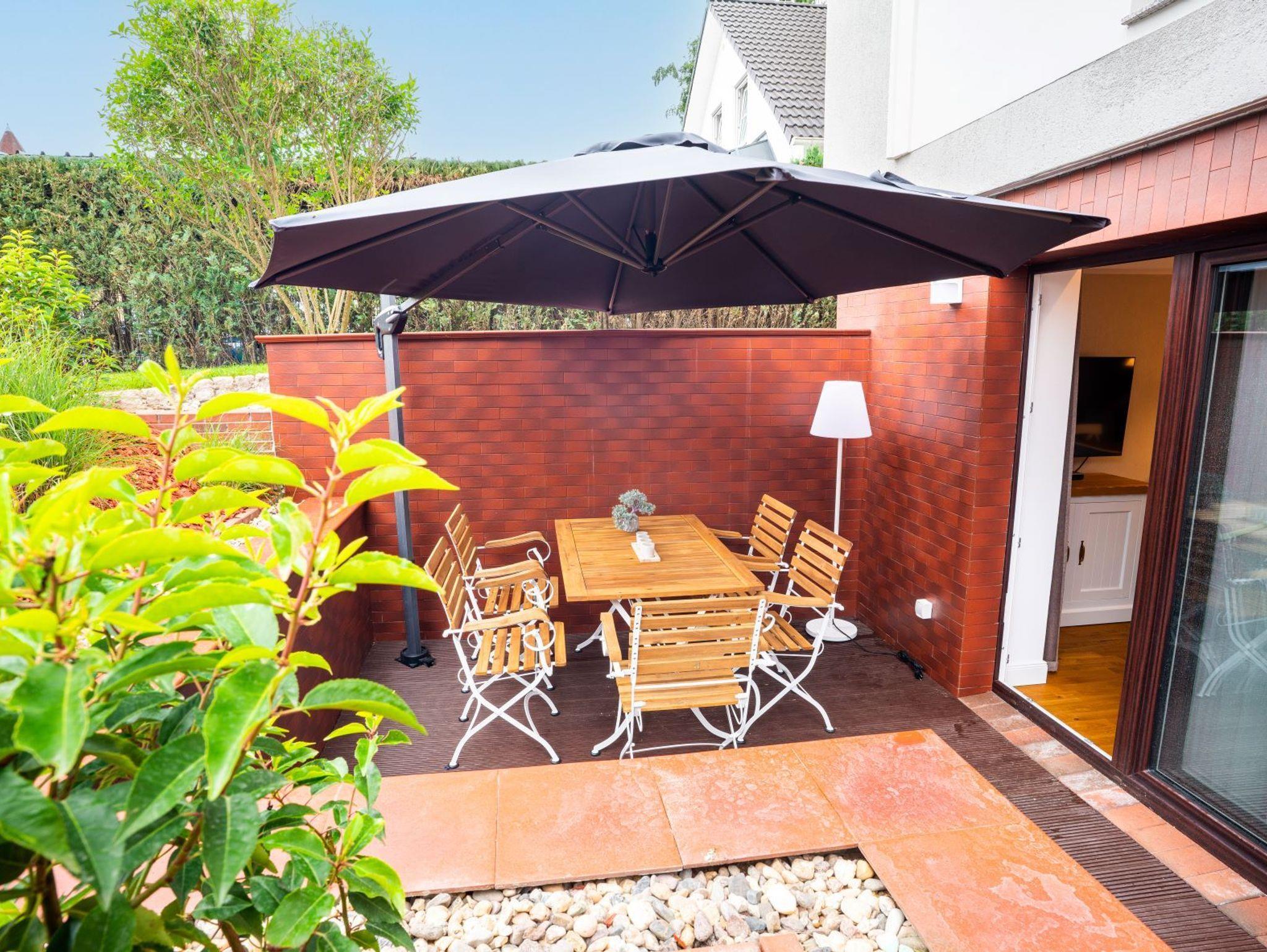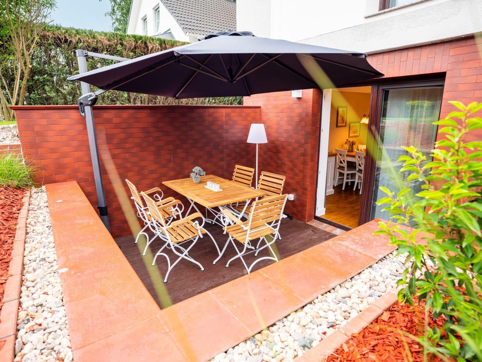 Über einen separaten Eingang gelangen Sie über den Flur in das Wohnzimmer mit gemütlicher Sitzgelegenheit, Flat-TV sowie einer integrierten Küchenzeile (Backofen, Ceranfeld, Mikrowelle, Kühlschrank mit Gefrierfach, Geschirrspülmaschine, Kochfeld, Wasserkocher, Toaster, Kaffeemaschine). Die sich an den Wohnbereich anschließende Sonnenterrasse lädt zum Entspannen beim Blick ins Grüne ein.