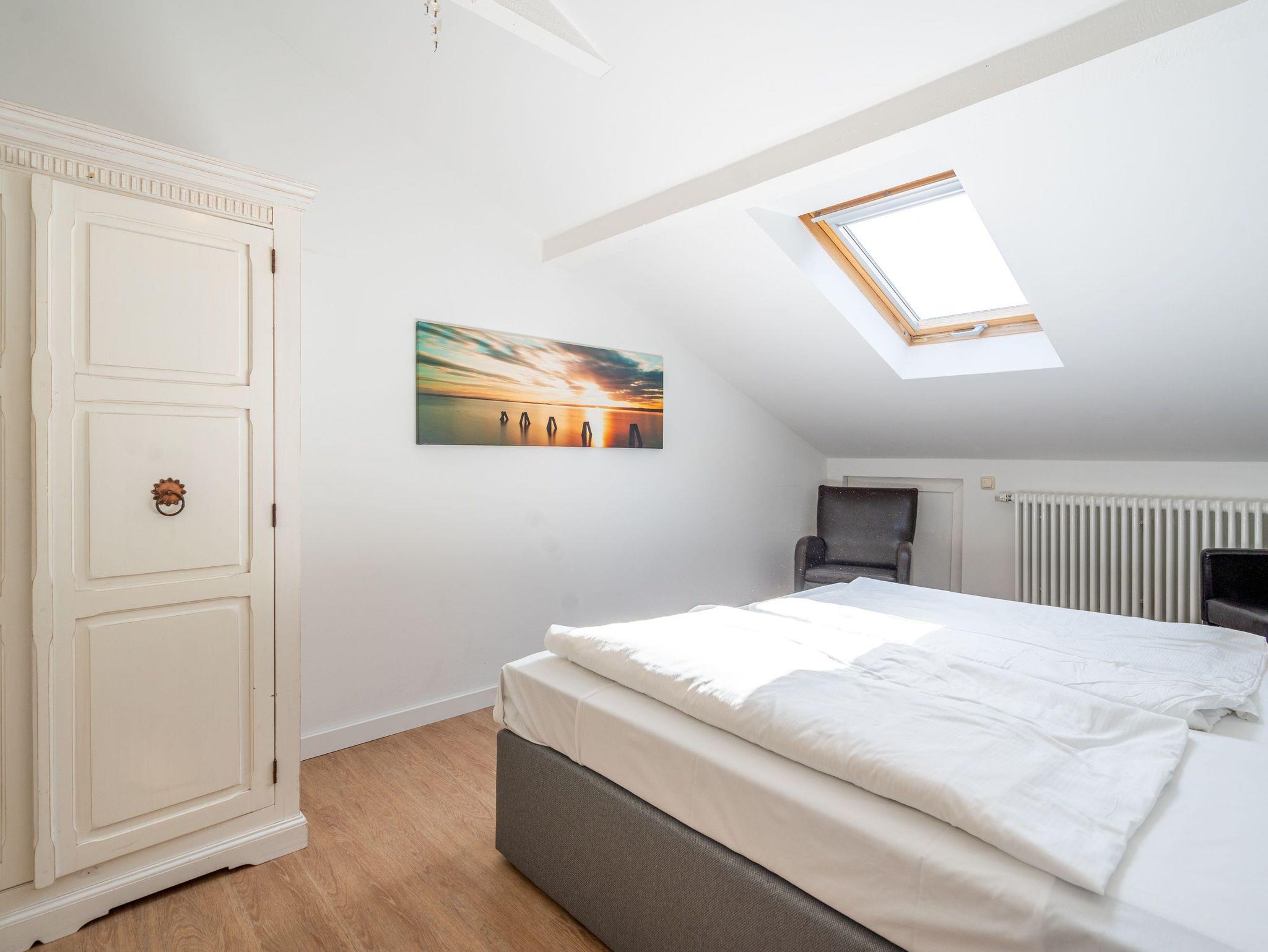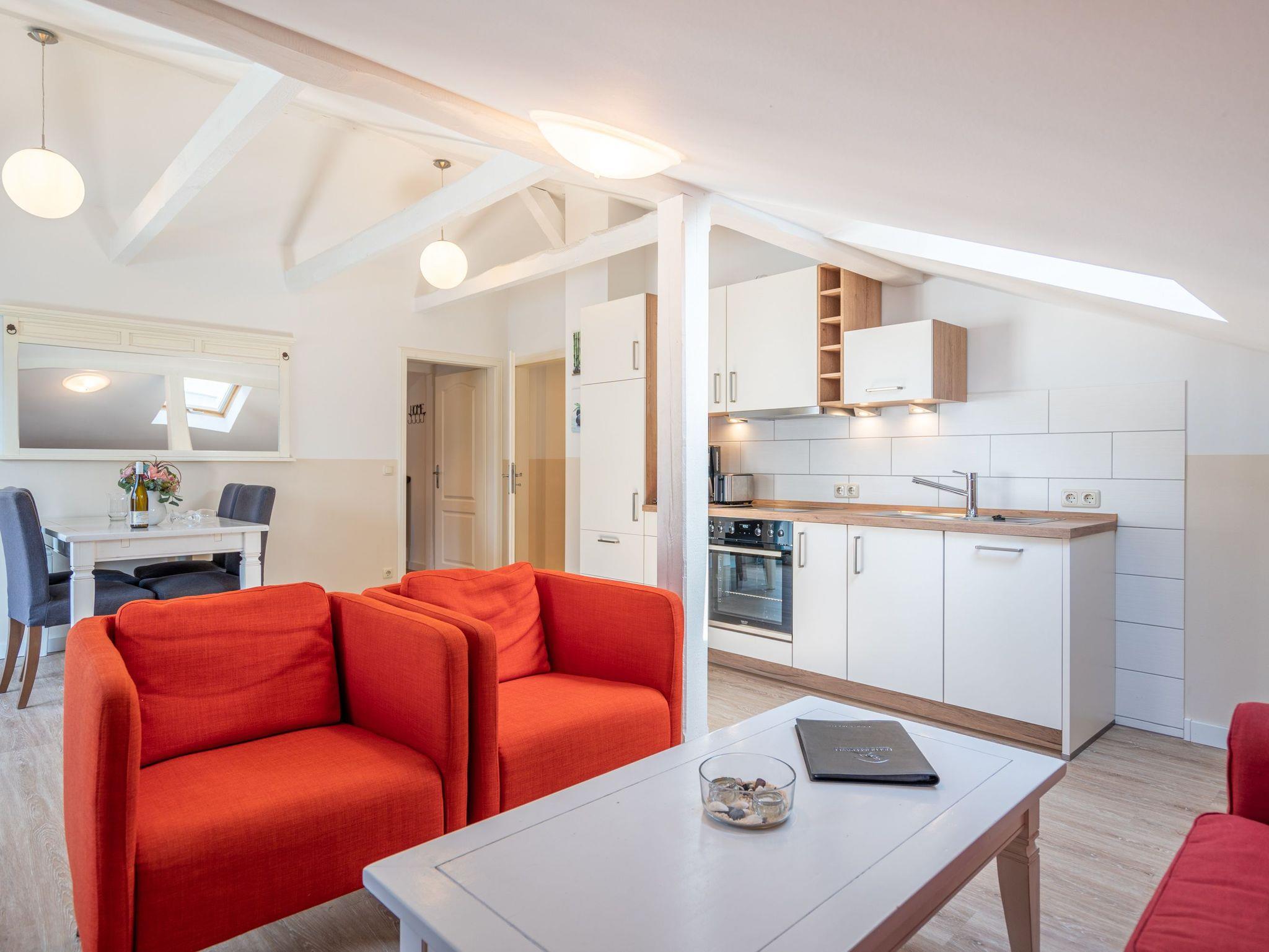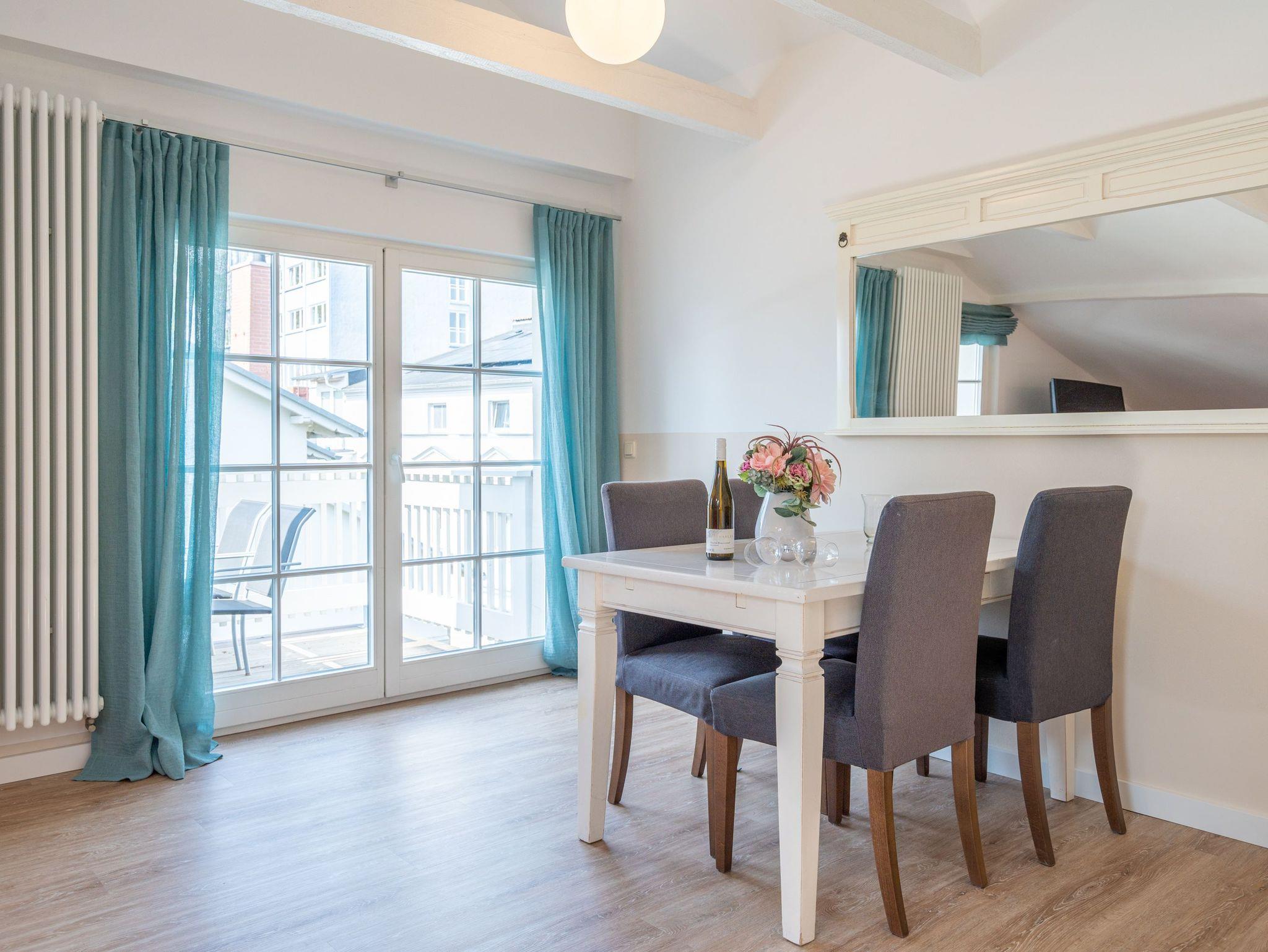 Mit 78 m² bietet diese Dachgeschosswohnung reichlich Platz für einen entspannten Urlaub mit Familie oder Freunden. Zwei Schlafzimmer mit Doppelbetten garantieren erholsame Nächte. Im Wohnbereich mit Sitzgruppe, TV, Küchenzeile und Essplatz lässt es sich gemütlich verweilen. Der 6 m² große Westbalkon lädt dazu ein, den Abend bei Sonnenuntergang ausklingen zu lassen. Bad mit Dusche und WC sowie ein Pkw-Stellplatz am Haus runden das Angebot ab.