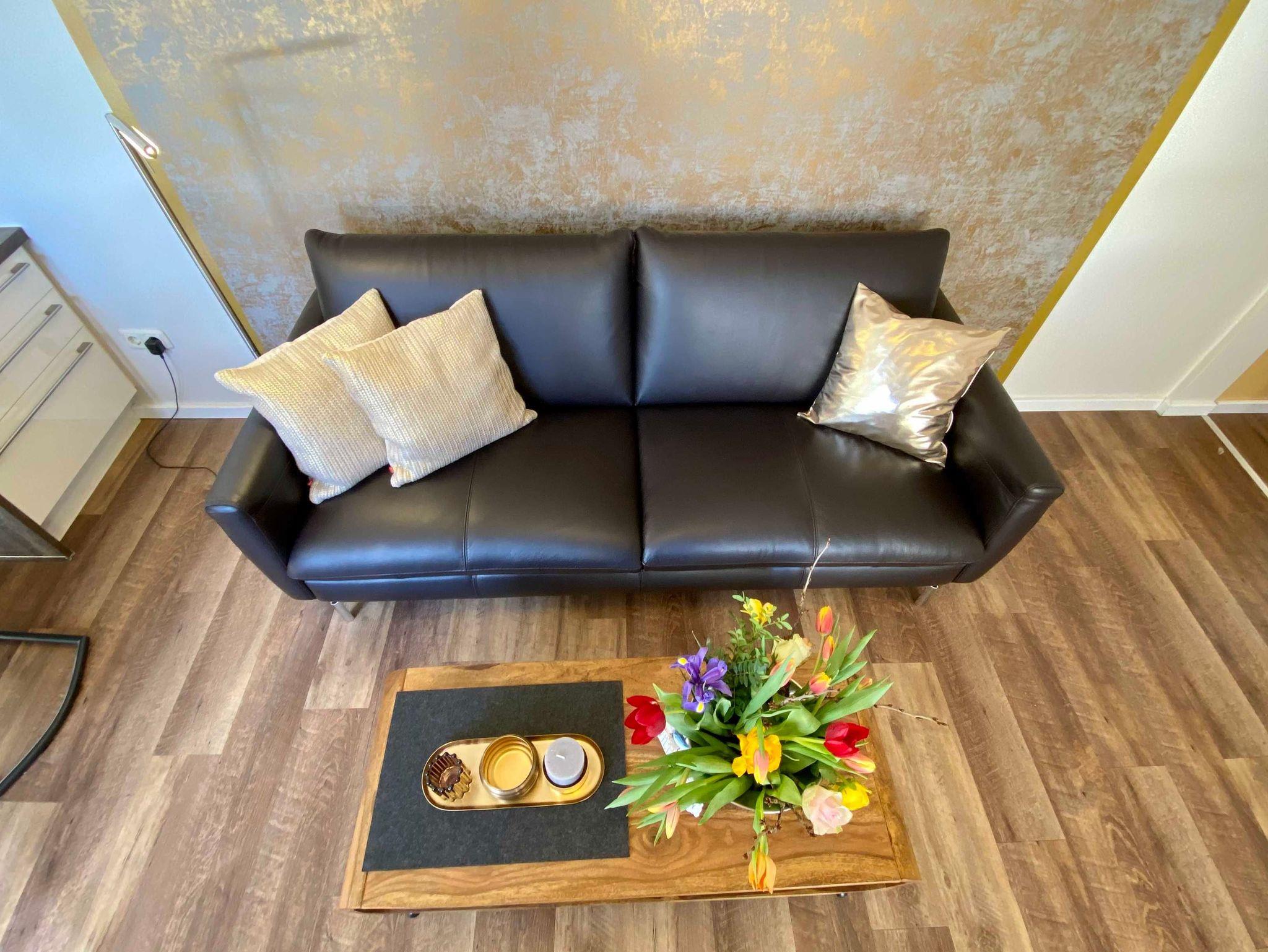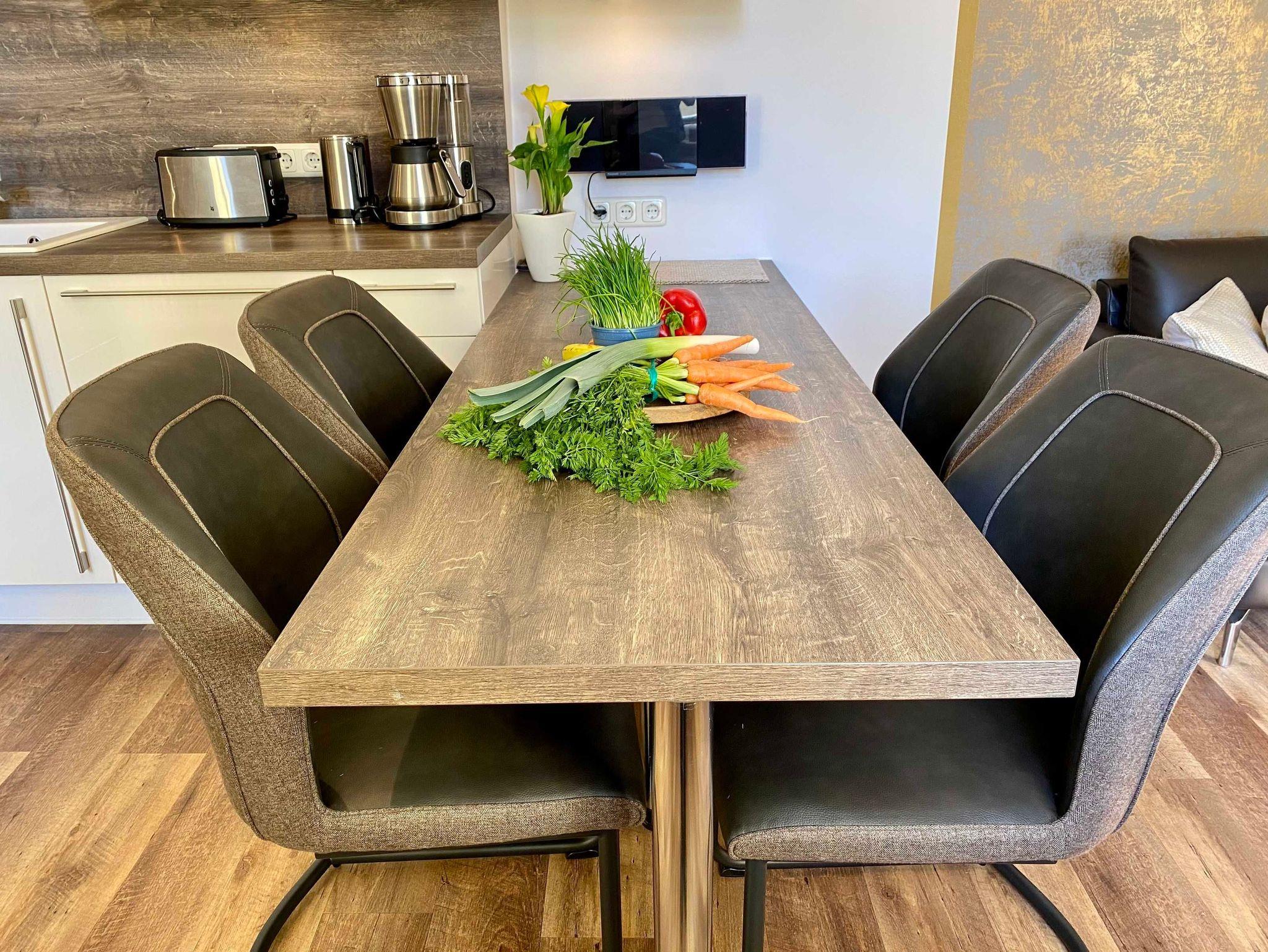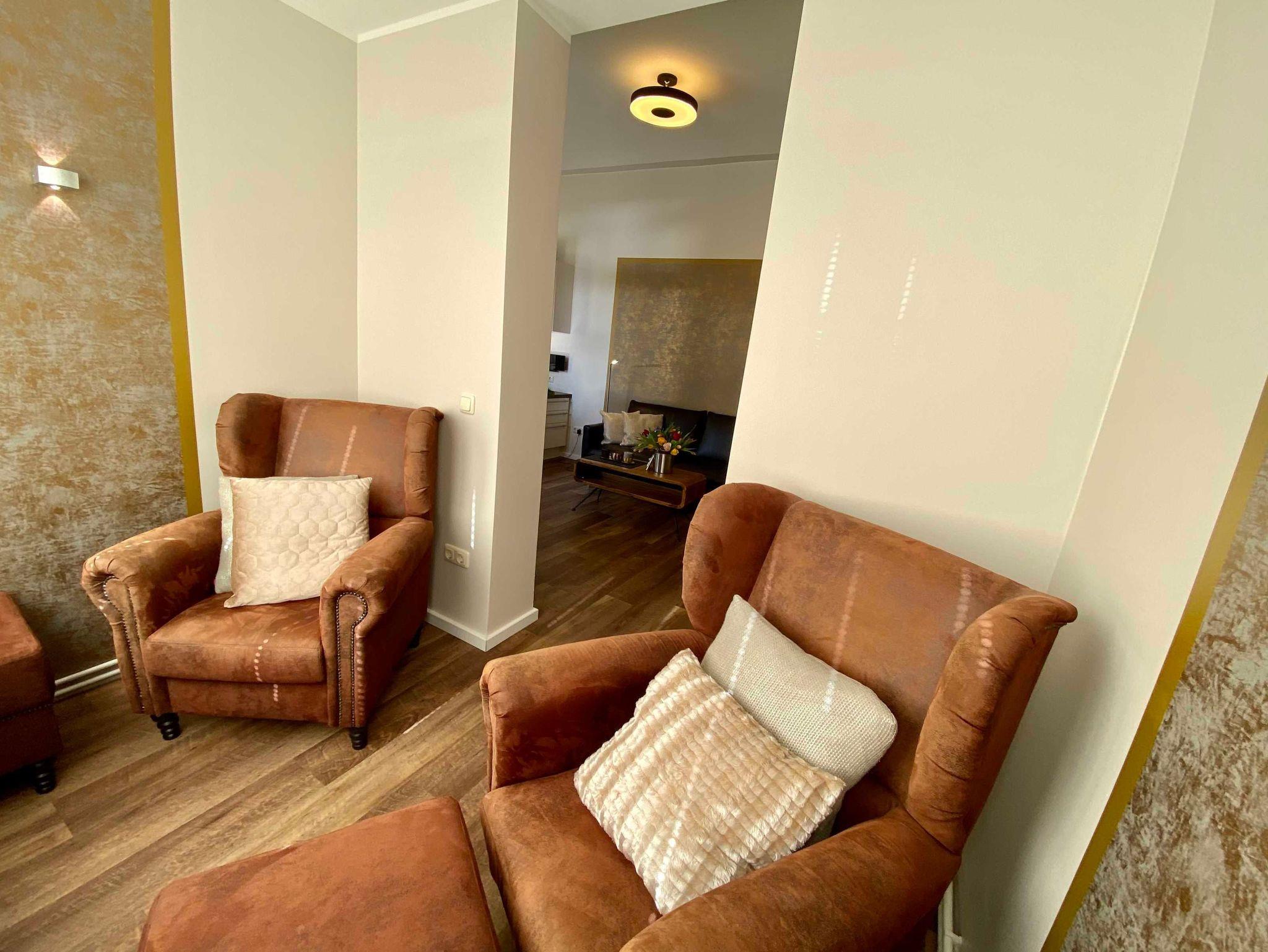 Auch der Anbau der Villa Anna wurde liebevoll saniert. Hier entstanden zwei schöne Ferienwohnungen, im Erdgeschoss die Kleine Anna, die ebenso modern und stilsicher eingerichtet wurde. Auf dem Grundstück gibt es pro Ferienwohnung einen Stellplatz und eine Aufladestation für E-Autos inklusive.