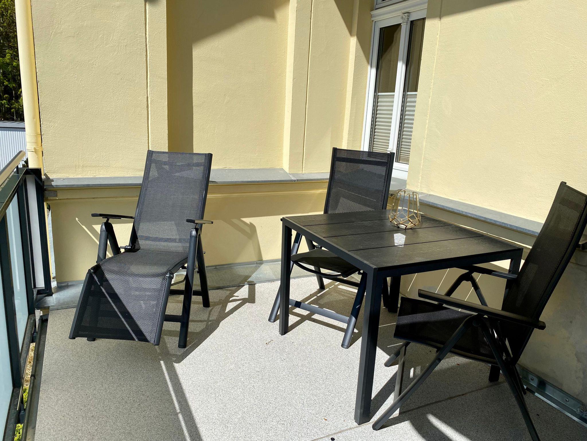 Die moderne Ferienwohnung Kaiserperle mit Balkon ist über eine relativ steile Treppe erreichbar. Im Eingangsbereich erwartet den Gast eine Garderobe, dir rechte Tür führt in das kleine Schlafzimmer, die linke in den modernen Wohnbereich. Der lichtdurchflutete Raum bietet Platz für eine gemütliche Fernsehcouch, einen Esstresen und die offene Küchenzeile (Geschirrspüler, Ceranfeld mit Backofen). Von hier aus gelangt man auf den Balkon und links in das zweite größere Schlafzimmer mit Doppelbett und TV und rechts in das Bad mit höchst modernen Details. Die Kaiserperle überzeugt durch höchsten Komfort in klaren Strukturen und liebevoll ausgewählte Accessoires.