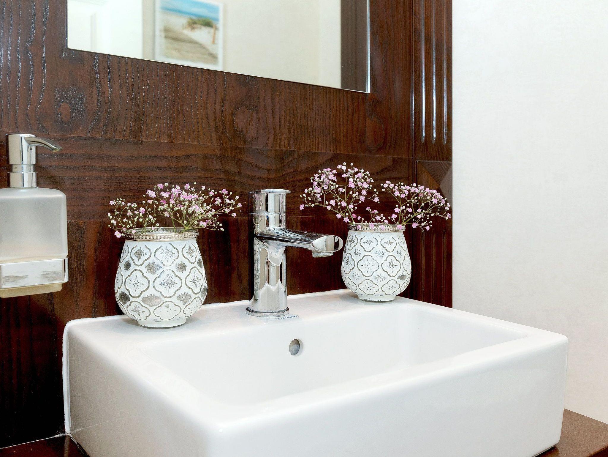 Komfortabel gestaltet erwartet Sie das Badezimmer en Suite mit einer Dusche, WC, Haartrockner, und einem Doppelwaschtisch sowie einem Handtuchheizkörper. Ein Gäste-WC komplettiert den erstklassigen Urlaubskomfort und ist vom Flur des Appartements begehbar.