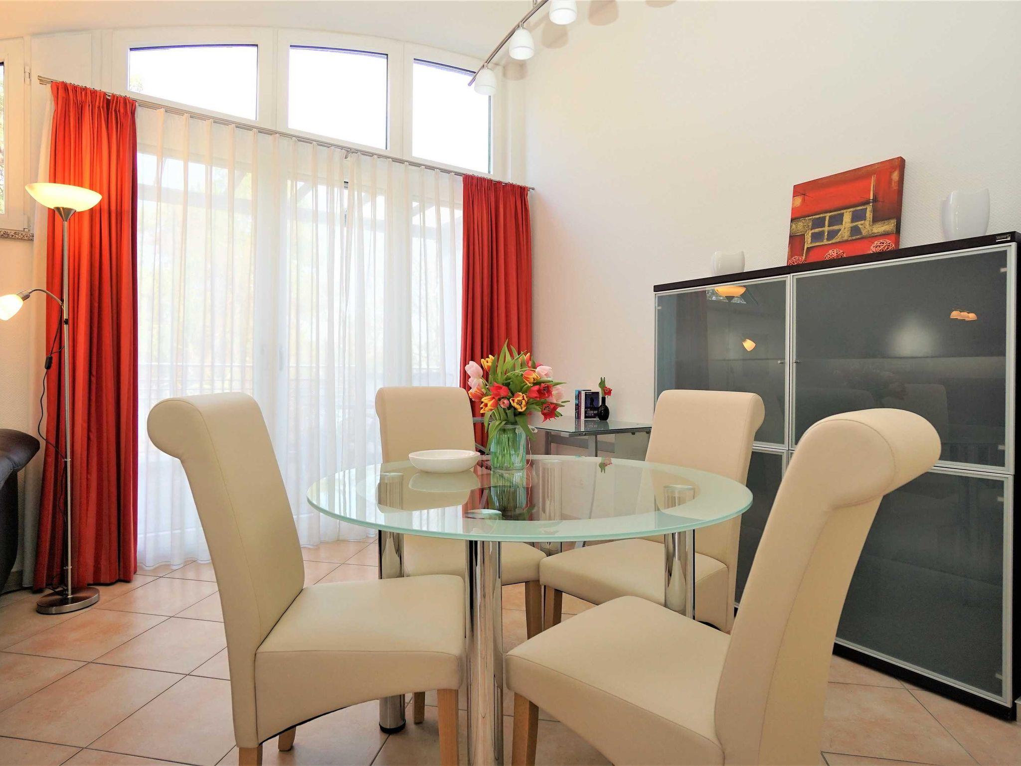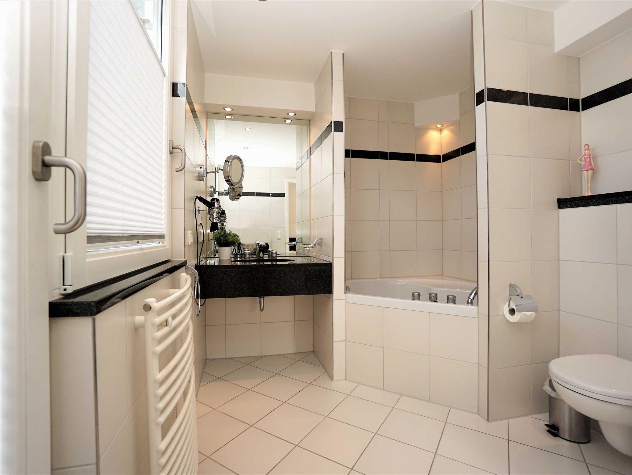 Die Ferienwohnung wird höchsten Ansprüchen gerecht. Die räumliche Aufteilung sowie getrennte Bäder ermöglichen auch eine Nutzung bis zu 4 Personen. Zusätzlich zu dieser Ferienwohnung stehen Ihnen ein PKW-Stellplatz zur Verfügung sowie im Keller ein gemeinschaftlich genutzter Abstellraum und Waschraum mit Münz-Waschmaschine und Münz-Trockner. In der Villa Darja, auf dem gleichen Grundstück gelegen, können Sie die Wellness-Räume mit Sauna (Münzbetrieb) benutzen. Ein kostenfreies WLAN-Netzwerk steht Ihnen zur Verfügung.