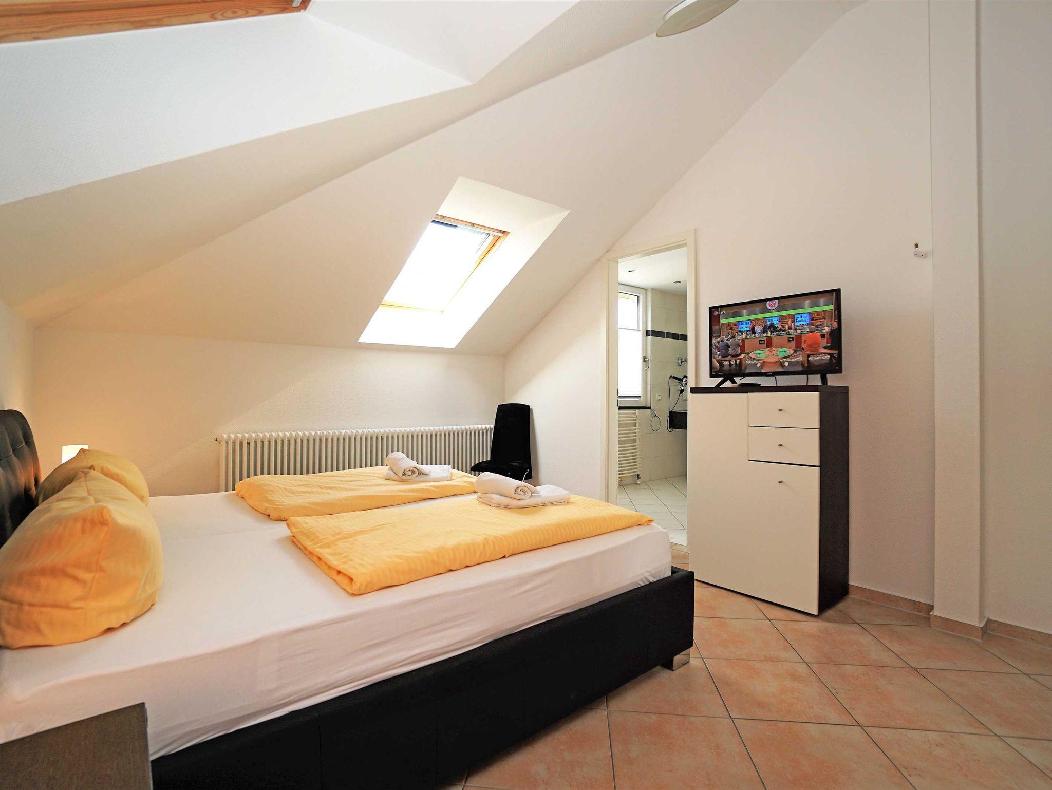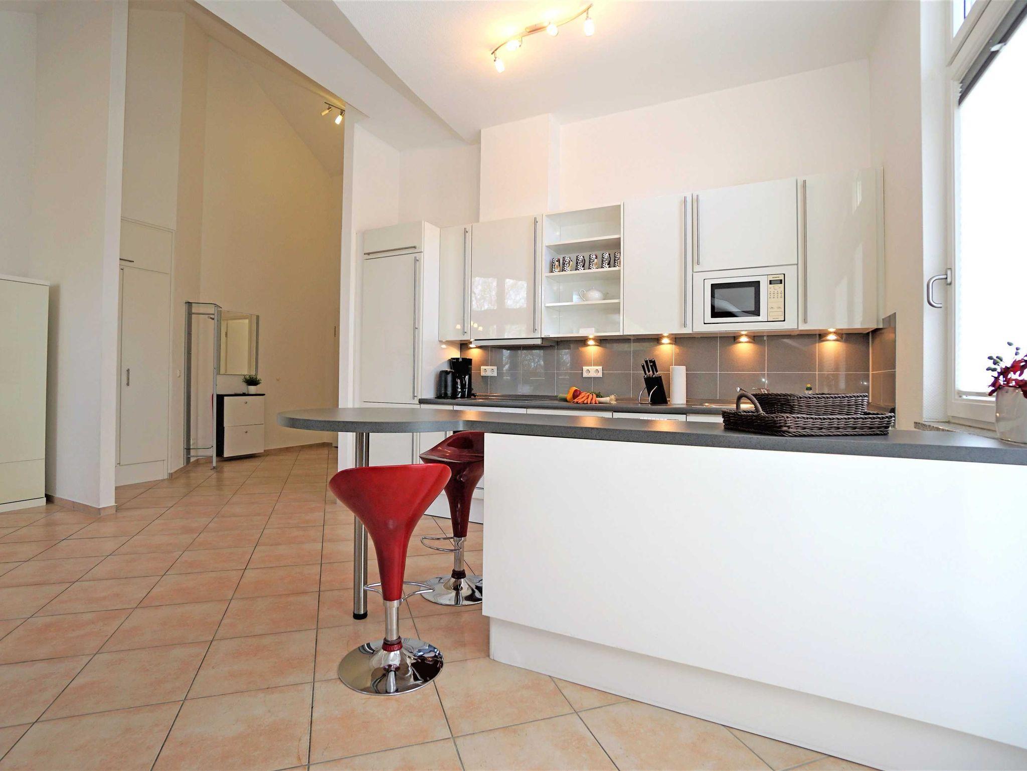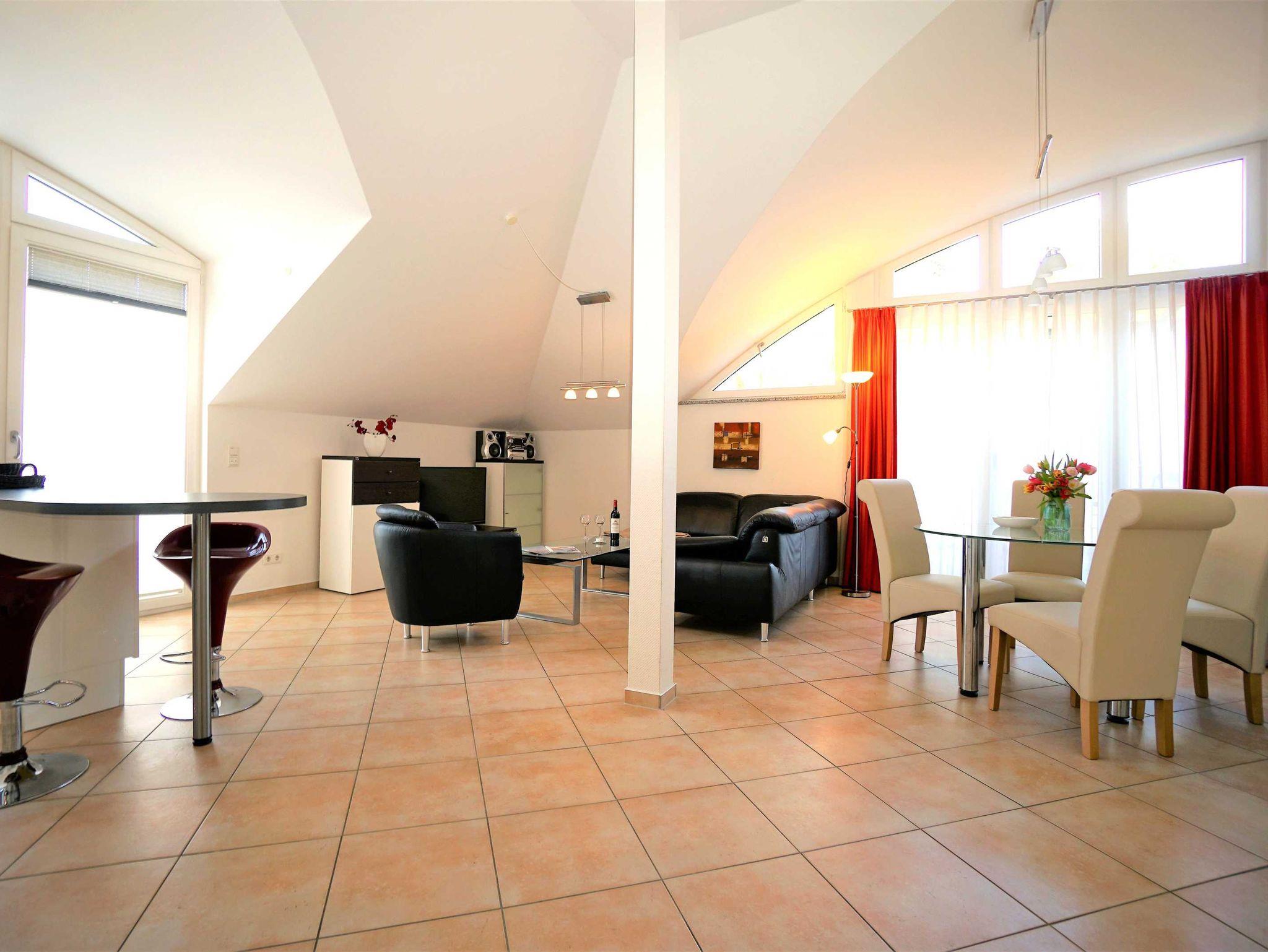 Sie verfügt über einen großen Wohn-/ Schlafraum, eine zum Wohnraum offene amerikanische Küche, ein Schlafzimmer, ein eigenes separates Duschbad und ein Badezimmer mit Badewanne. Das Bad erreichen Sie direkt vom Schlafzimmer. Dieses ist mit Doppelbett, Kleiderschrank, 2 Polsterstühlen, Radio und Fernseher ausgestattet. In der Küche finden Sie die vollständige hochwertige Markenausstattung für ihren Aufenthalt. Daran schließt sich im Wohn-/Schlafraum ein großer Esstisch an. Wohn-/Schlafraum laden durch ihre exklusive Ausstattung mit Sitzgruppe, Fernseher, HiFi-Anlage, CD-Player und bequemem Doppel-Wandklappbett zur Entspannung und zur Erholung ein.