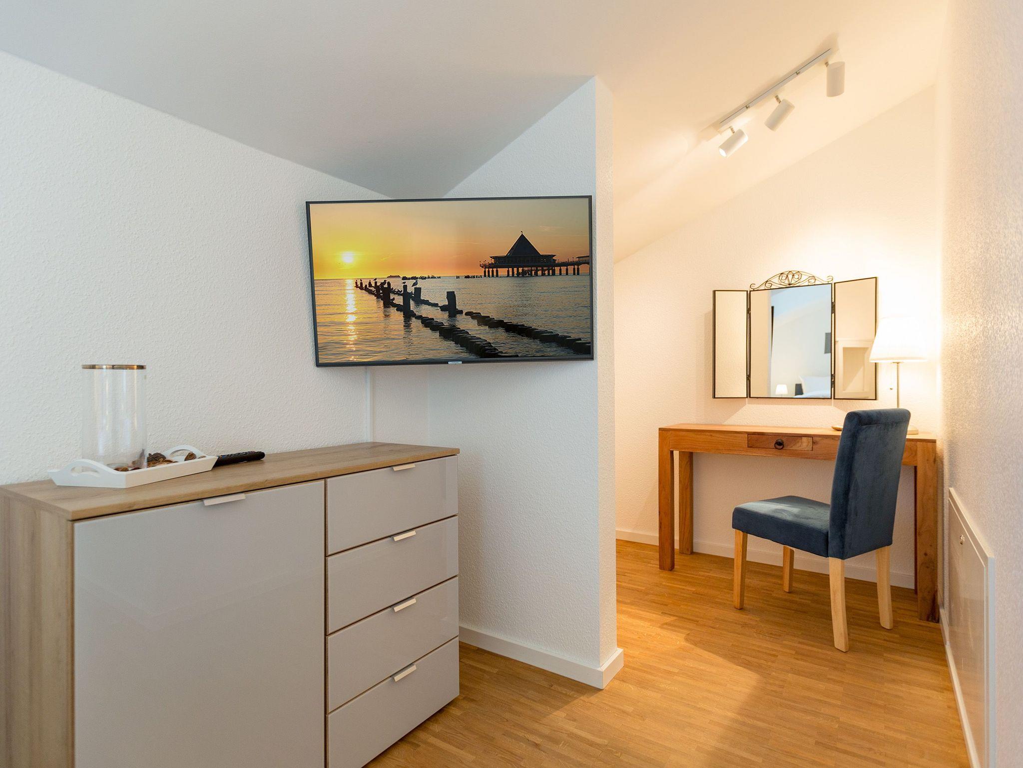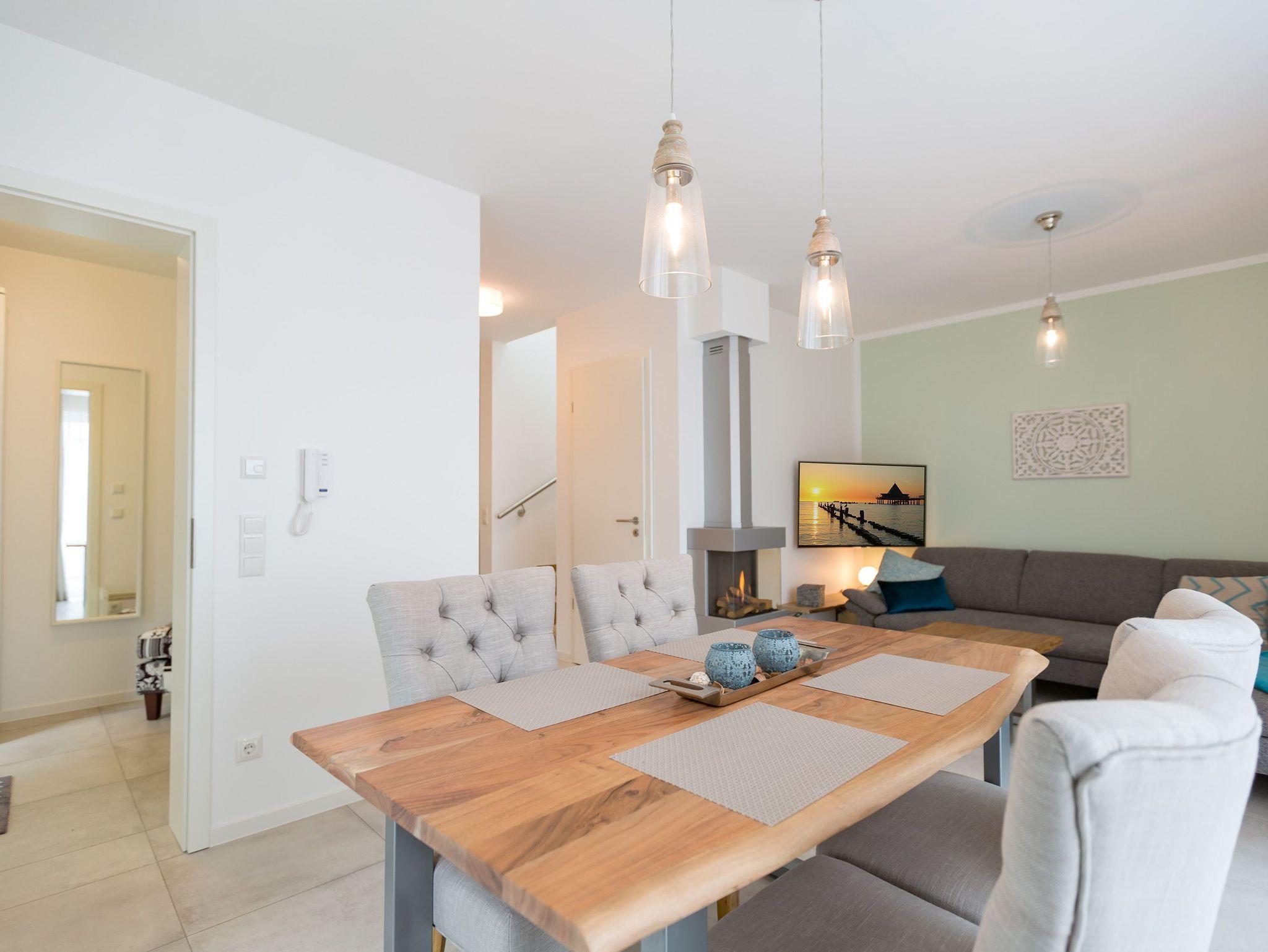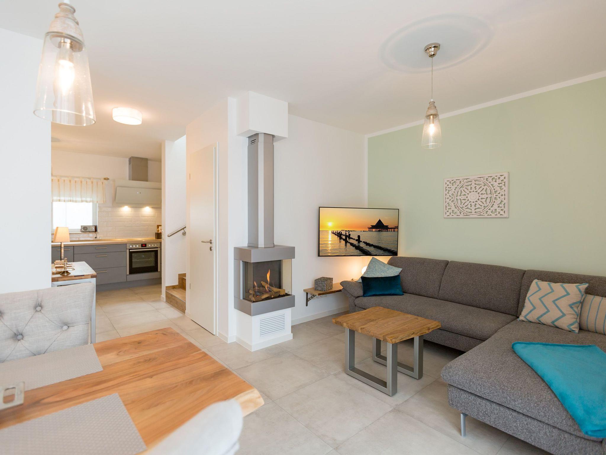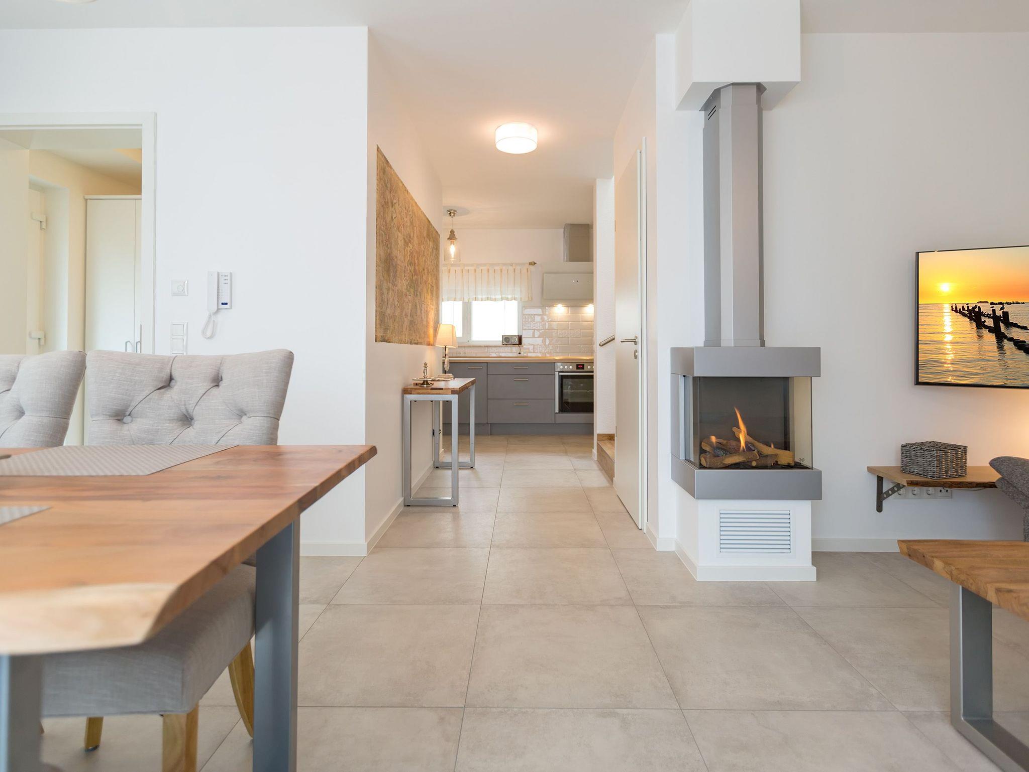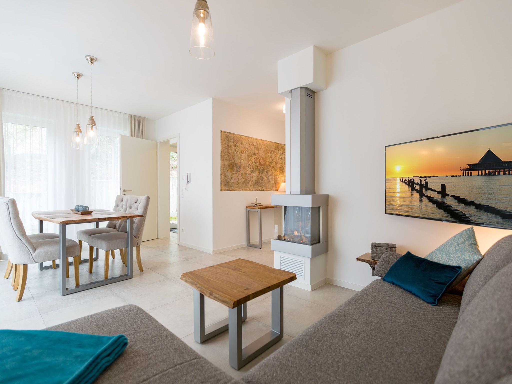 Über zwei Etagen erstreckt sich im Appartement 1 ein 83 Quadratmeter großer Urlaubstraum mit ganz besonderem Flair. Offen, großzügig und elegant ist das Drei-Zimmer-Appartement eine echte Wohlfühlzone. Bis zu vier Freunde oder Familienmitglieder können hier gemeinsam eine stilvolle Auszeit mitten im Herzen des mondänen Kaiserbades genießen. Auch ein Kleinkind bis zwei Jahre kann hier zusätzlich im Kinderreisebett untergebracht werden. Wie ein kleines Loft gehen im Erdgeschoss das Wohnzimmer in das Esszimmer und in die voll ausgestattete Küche über. Lichtdurchflutet und gemütlich ist das Interieur. Die große Sofalandschaft eignet sich ideal zum Filme anschauen auf dem Flat-TV oder für gesellige Abende vor dem Gaskamin. Per Knopfdruck können Sie mit ihm eine kuschelige Atmosphäre zaubern. Vom Wohnzimmer gelangen Sie auf die Südterrasse (ca. 12qm). Am wunderschönen Industrial-Design-Holztisch mit den komfortablen Stühlen lässt es sich lecker essen. Die Küche ist mit allem ausgestattet. Mikrowelle, Gefrierschrank, Spülmaschine, Backofen ? hierbei handelt es sich durchweg um hochwertige Markengeräte. Auch Geschirr ist in den Schränken zu finden. Im Erdgeschoss befindet sich zudem ein stylisches Badezimmer mit Dusche und WC. Über eine Treppe geht?s in die Traum- und Relax-Area. Im 1. Obergeschoss befinden sich zwei gemütliche Schlafzimmer mit Boxspringdoppelbetten (1,60 m x 2,00 m und 1,80 m x 2,00 m), Schränken und je einem weiteren Flat-TV. Eines der beiden Schlafzimmer hat sogar eine separate Ankleide ? ein kleines Boudoir mit Schminktisch. Auch im Obergeschoss gibt es ein geräumiges Tageslichtbad. Neben Dusche, WC und Waschbecken verwöhnt es die Entspannungshungrigen mit einer kleinen Finnischen Sauna. Das Ferienobjekt verfügt über eine Waschmaschine. Bei Anreise sind die Betten bezogen und Handtücher liegen bereit. Das WLAN-Netz ist kostenfrei nutzbar. Für das Appartement ist ein Stellplatz im Carport reserviert. Von hier aus erreicht man den Zugang zum Haus über eine Außentreppe.
