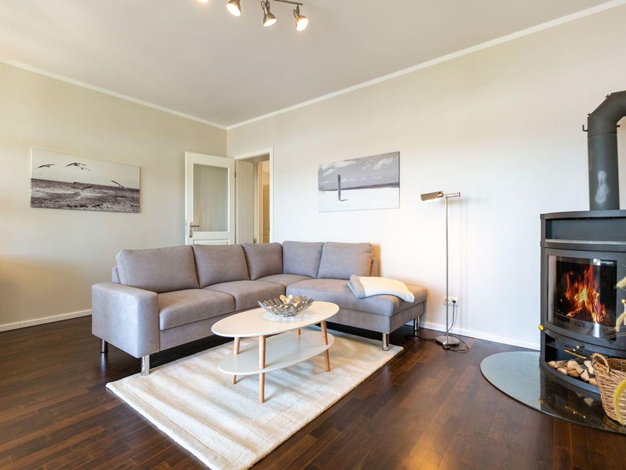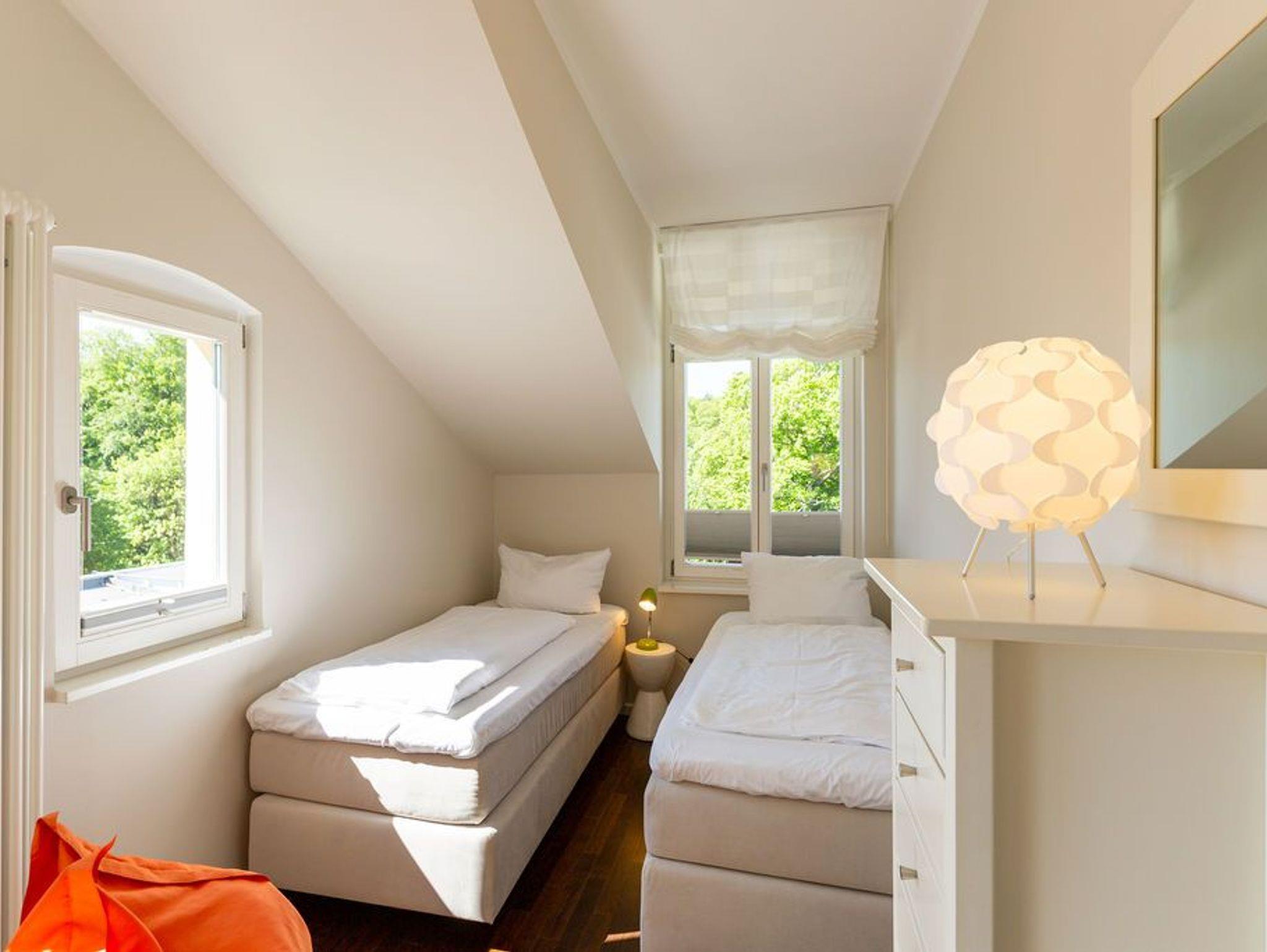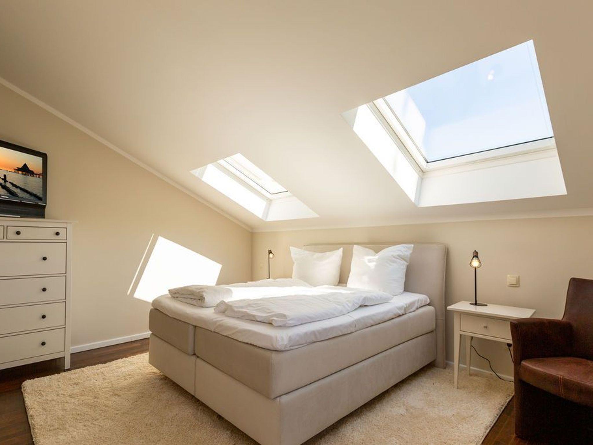 Großzügig, hochwertig und sehr detailverliebt gestaltet, erwartet Sie eine zauberhafte Wohlfühl-Wohnwelt für 4 Personen und ein Kleinkind im Reisebett. Willkommen in Charlottes Höh Nr. 8! Hier finden Sie auf opulenten 105 qm viel Raum zum Verwirklichen Ihrer Urlaubsträume. Und den fantastischen Meerblick gibt´s quasi dazu. Denn den genießen Sie in der großzügigen, verglasten Loggia am besten bei einem Glas Wein auf der Couch oder beim Frühstück am Esstisch. Im Wohnbereich machen Sie es sich auf der bequemen Couchecke gemütlich. Im heimeligen Schlafzimmer mit Boxspringdoppelbett unter der Dachschräge findet bequem auch ein zusätzliches Kinderreisebett Platz. Das zweite Schlafzimmer mit getrennten Betten ist für Kinder und Erwachsene geeignet. Die separate Küche mit Zugang zum sonnigen Südbalkon ist mit allem Komfort ausgestattet. An kalten Tagen wird es durch den knisternden Kaminofen oder in der wohnungseigenen Sauna so richtig warm und kuschelig. Ergänzt wird die Wohnung durch ein modernes Bad mit Dusche, WC und Sauna. Auf Wunsch stellen wir für unsere kleinen Gäste ein Kinderreisebett (ohne zusätzliche Matratze [&] Bettzeug) und einen Kinderhochstuhl ( gegen einen Aufpreis) zur Verfügung. Für Ihren Komfort sind die Betten bei der Anreise bezogen und Handtücher liegen bereit (Erstausstattung).