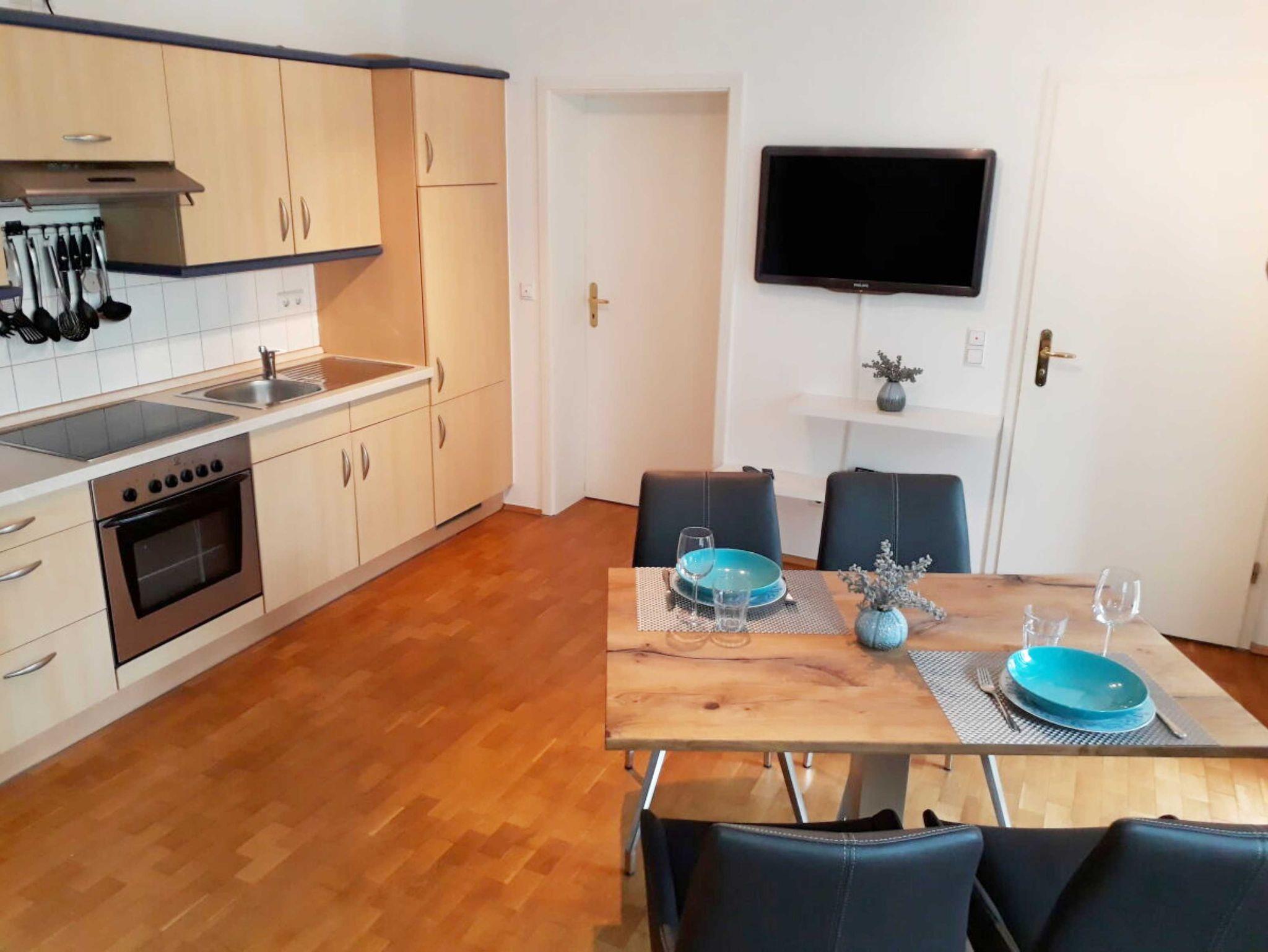 Die Wohnung verfügt über ein Wohnzimmer mit Sofa (Aufbettungsmöglichkeit für zwei Personen, ca 1,40 m breit) Essplatz für bis zu 4 Personen und einer Küchenzeile ausgestattet mit Backofen, Ceranherd, Mikrowelle und allen notwendigen Kochutensilien; ein Schlafzimmer rmit Doppelbett und zweitem TV-Gerät sowie Bad mit ebenerdiger Dusche und WC.