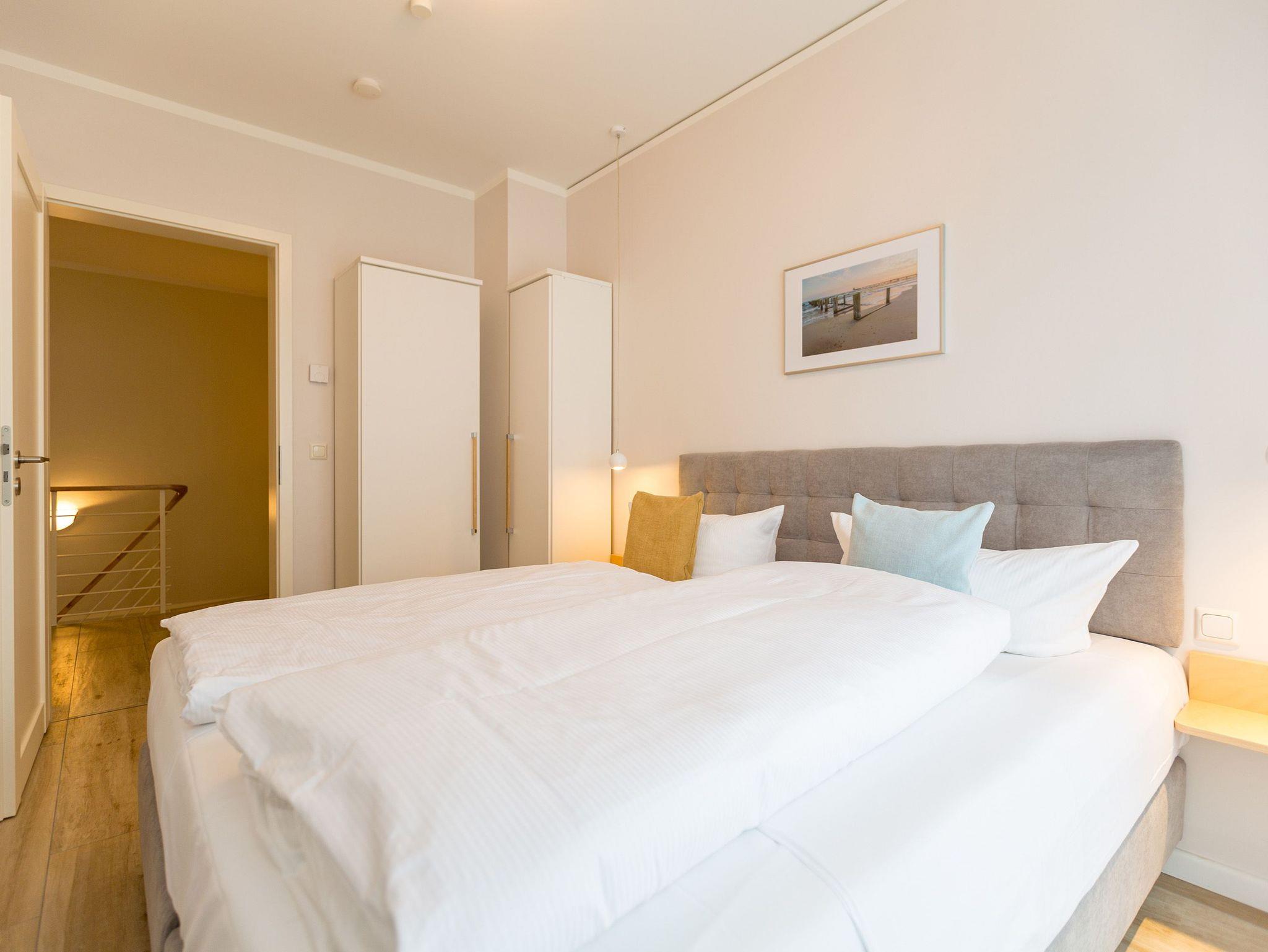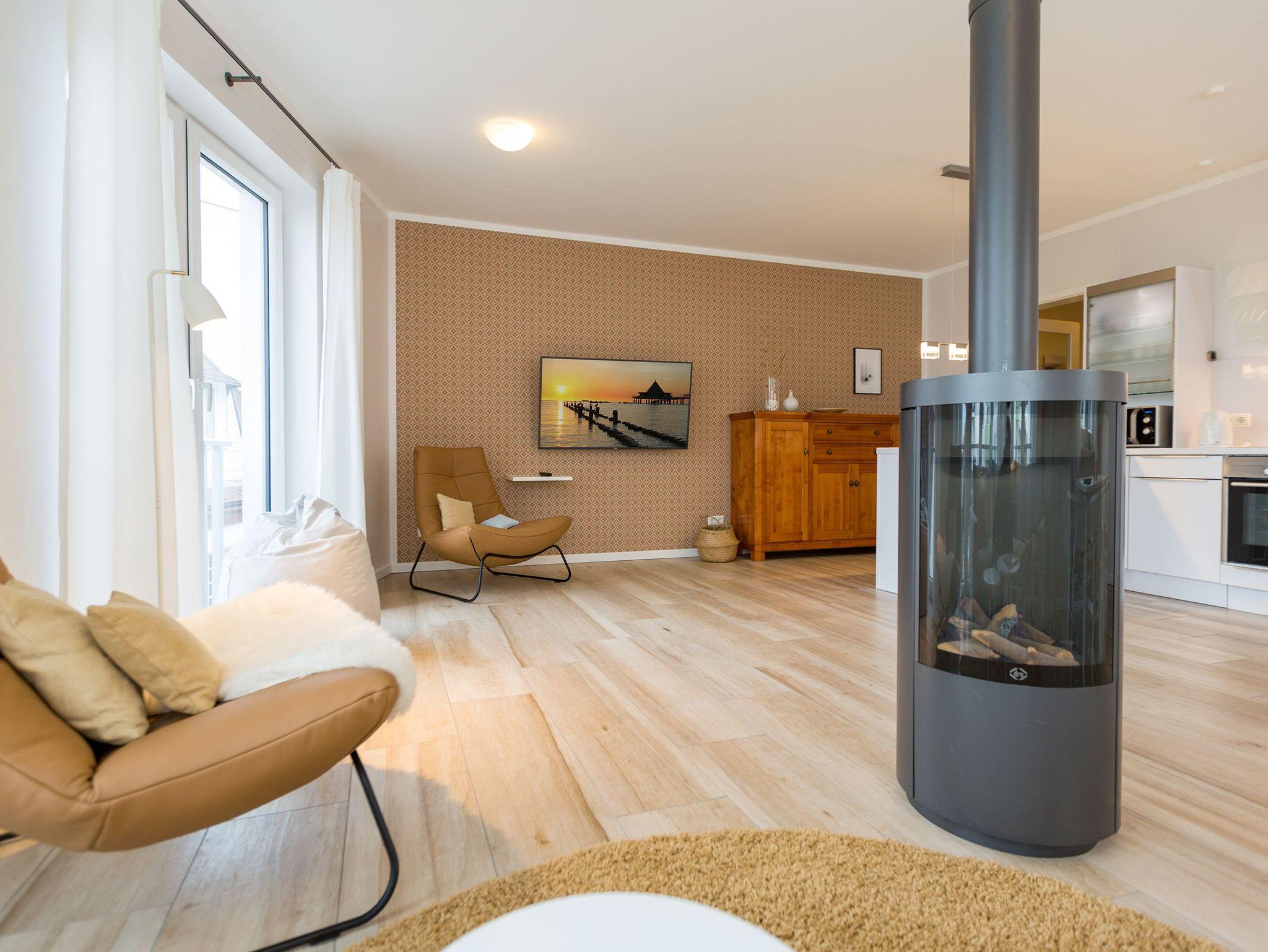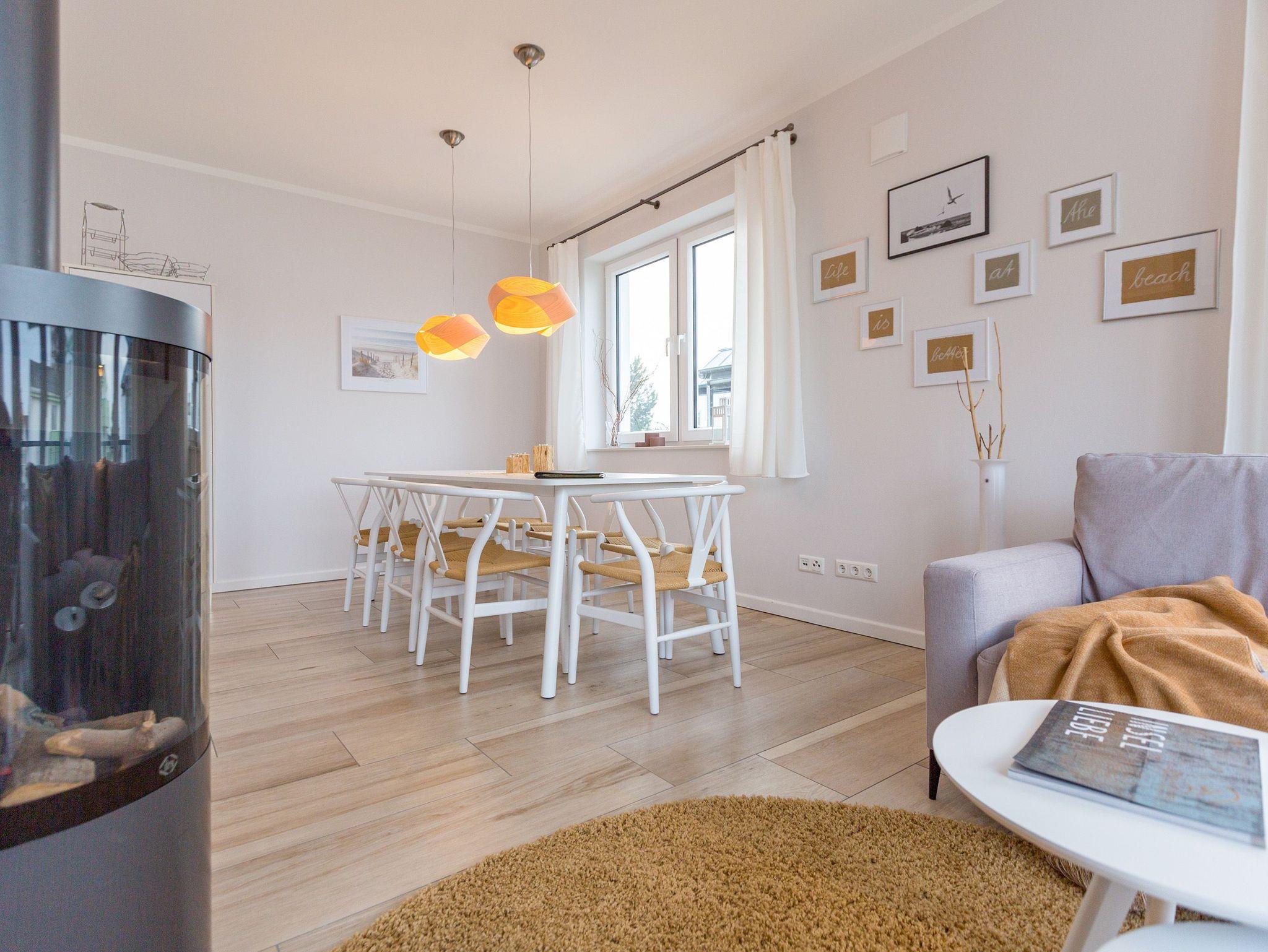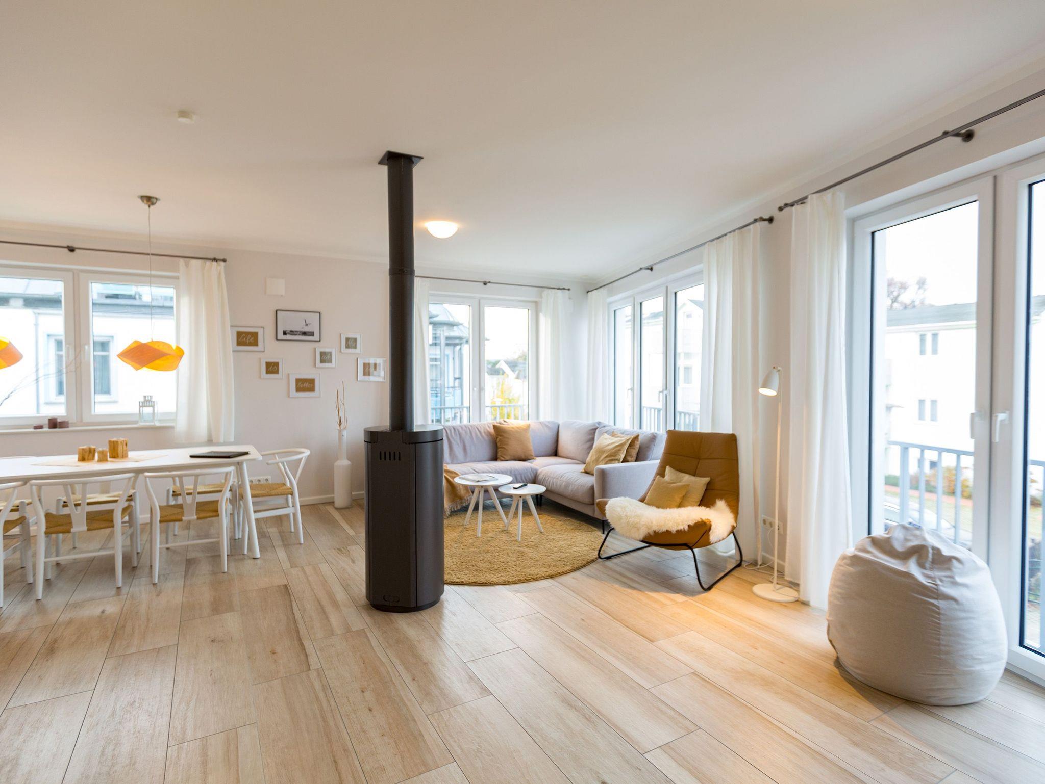 Schließen Sie die Augen und träumen Sie sich in dieses Feriendomizil an der Ostsee, dass auf großzügigen 147qm Erholung für die ganze Familie oder die besten Freunde verspricht. Auf insgesamt zwei Etagen mit 4 Schlafzimmern und 2 Bädern bietet dieses Appartement ausreichend Platz für bis zu 8 Personen und 1 Kleinkind (im Babyreisebett). Ein im Strandhaus-Stil gehaltenes Interieur, kombiniert mit hellen Naturtönen und Materialien aus Korb und Holz, komplettieren das Urlaubsgefühl. Im großzügigen Eingangsbereich im Erdgeschoss befindet sich neben einer Garderobe ein gemütlicher Loungesessel mit Leseecke, der ein Gefühl des Nachhausekommens versprüht. Das angrenzende Schlafzimmer mit eigenem Terrassenzugang und komfortablem Boxspringbett (1,80m x 2,00m) ist der perfekte Rückzugsort für Eltern oder Großeltern, die sich auf dieser Etage nach Ruhe sehnen. Ebenfalls im Erdgeschoss befindet sich eines der beiden Badezimmer mit Finnischer Sauna, die nach einem langen Strandspaziergang zu einem heißen Aufguss einlädt. Eine Dusche, ein Waschtisch sowie ein WC runden den Bereich des unteren Badezimmers ab. Außergewöhnlich könnte man das Wohnzimmer beschreiben, dass sich im Obergeschoss befindet. Der offen gestaltete Wohn-Ess-Bereich avanciert zum zentralen Treffpunkt des Appartements. Nicht zuletzt wegen des Kamins, dessen wohlige Wärme Sie direkt vom Sofa und auch vom Esstisch aus genießen können. Die integrierte moderne Küche ist voll ausgestattet und verfügt über hochwertige Küchengeräte (Mikrowelle, Backofen, Ceranfeld, Spülmaschine, Kühlschrank mit Gefrierfach). Entspannen Sie anschließend auf einem der beiden Stressless-Sessel und der bequemen Sofalandschaft vor dem Flat-TV, bevor Sie die Nacht in einem der drei Schlafzimmer im Obergeschoss verbringen, die alle über Boxspringbetten (1,80m x 2,00m), ausreichend Schrank- und Ablagefläche sowie einen Flat-TV verfügen. Eine kleine Wellness-Oase ist das Wannenbad im Obergeschoss, dass außerdem über eine Dusche, ein WC und einen Waschtisch verfügt. Bei Ihrer Anreise liegen für Sie Handtücher bereit. Auch die Betten sind bereits bezogen. Ein dem Appartement zugehöriger Stellplatz in einer Garage und ein Stellplatz am Haus für einen Kleinwagen (hier muss immer rückwärts eingeparkt werden) sowie ein paar wenige Fahrradabstellmöglichkeiten in der Garage zählen ebenso zu diesem Feriendomizil wie kostenfreies WLAN.
