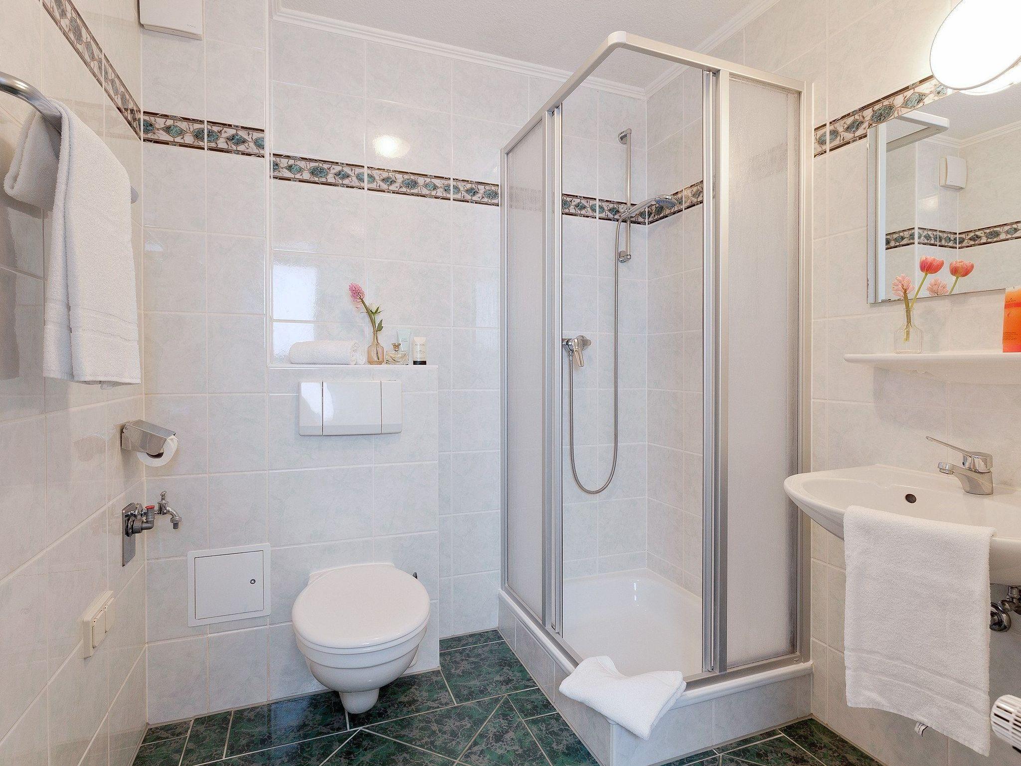 Das Badezimmer verfügt über WC, Dusche und einem Haarfön.