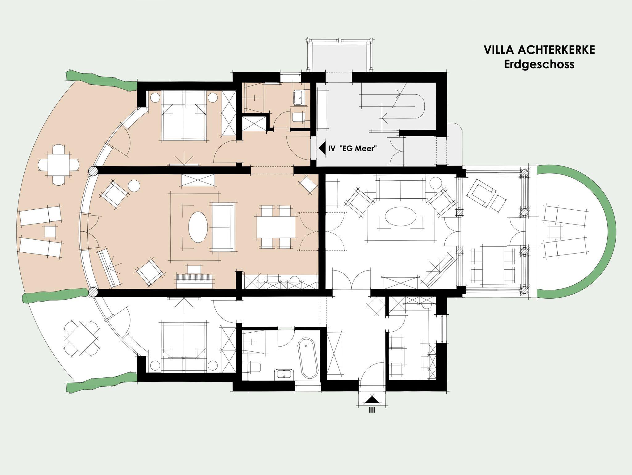 Die Villa umfasst vier Ferienwohnungen, wobei jeweils zwei zu einer großzügigen Einheit etagenweise verbunden werden können. Das Haus ist also flexibel für bis zu 12 Personen (Preise auf Anfrage) buchbar: als Ganzes - als Etage für max. 6 Personen - oder 4 Einheiten a max. 3 Personen !