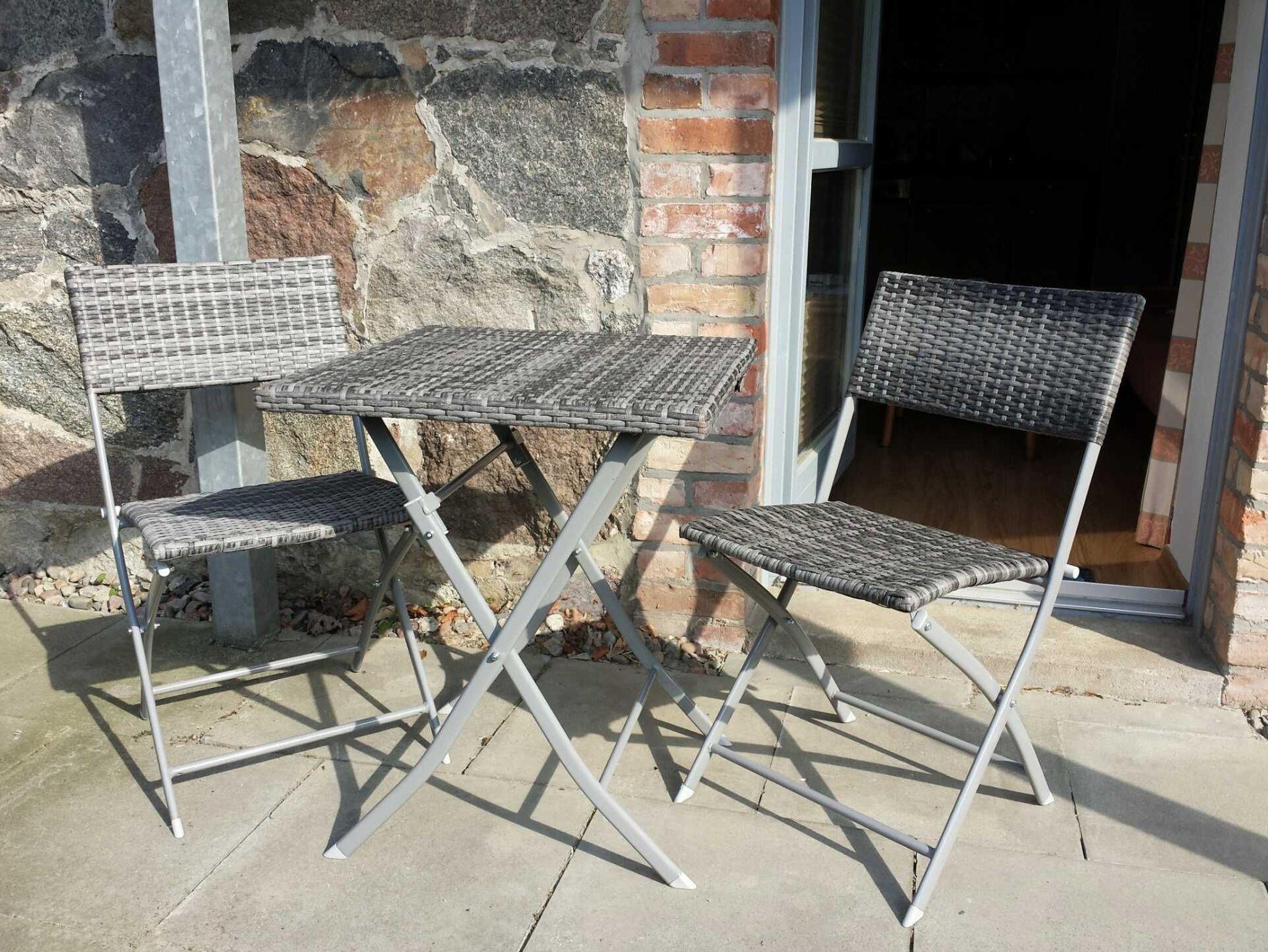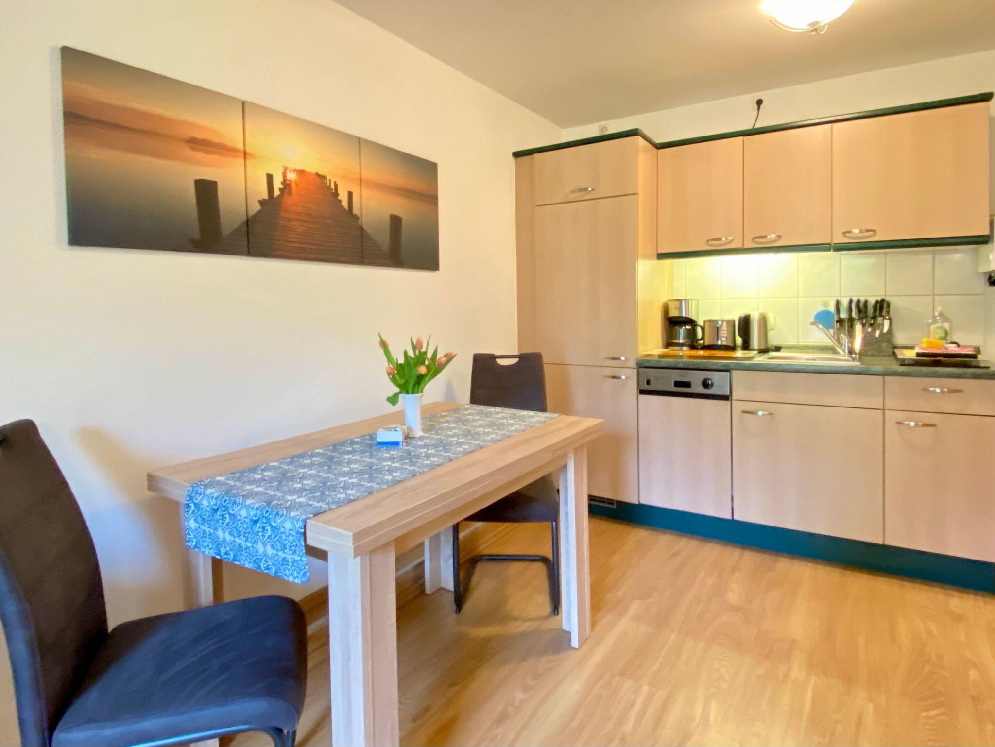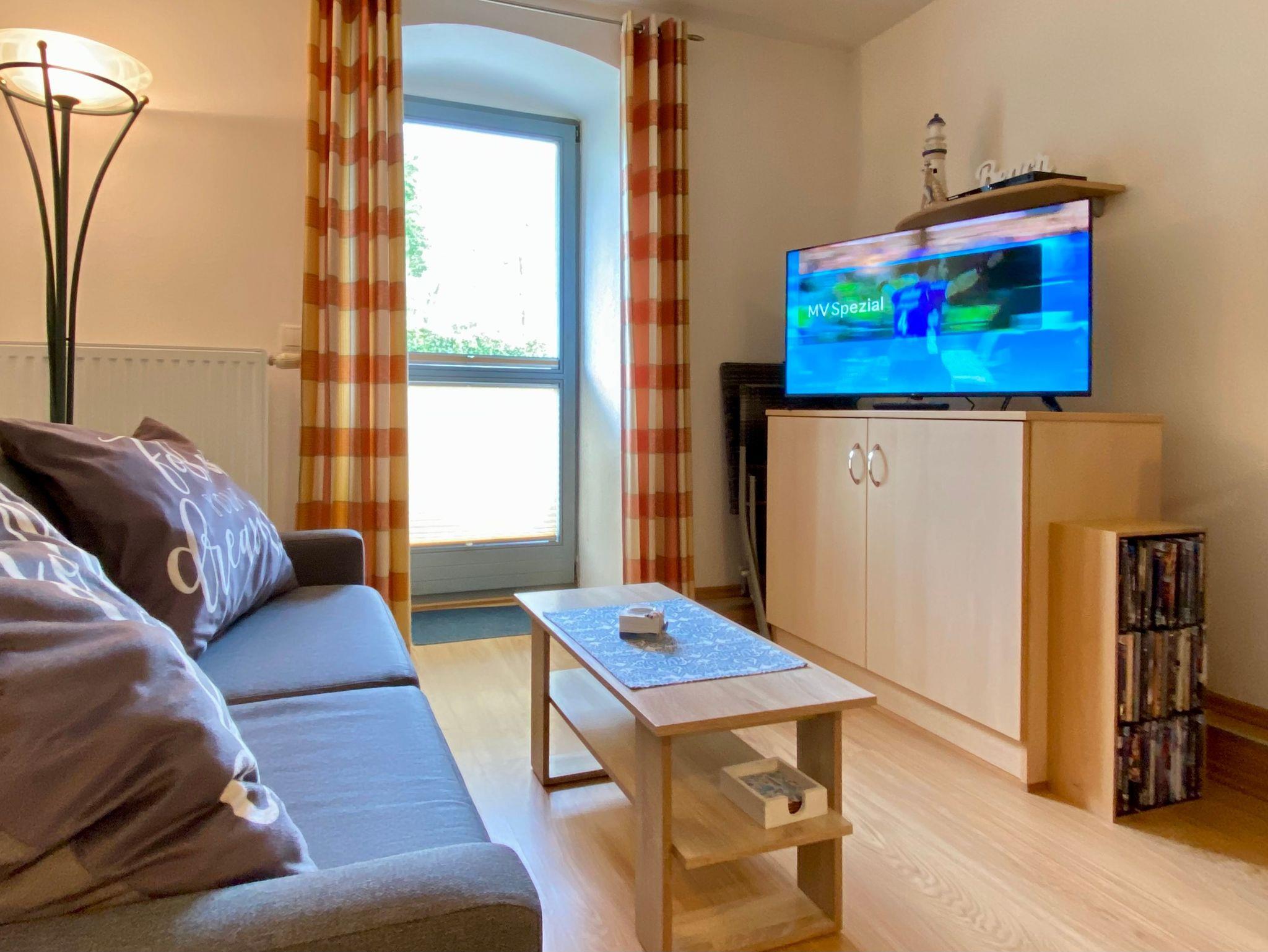 Die kleine 2-Raumferienwohnung verfügt über eine überdachte Terrasse mit Möbeln, ein Bad mit Dusche, ein Schlafzimmer mit Doppelbett in Komforthöhe und CD-Player, einen kombinierten Wohn-Essraum mit kleiner Küchenzeile (Geschirrspüler, 2-Plattenherd, Mikrowelle). Im Wohnzimmer befindet sich ein TV und ein DVD-Player mit DVDs für den Regentag im Urlaub. Stellplatz für den PKW und Fahrradschuppen sind vorhanden. Internet inklusive