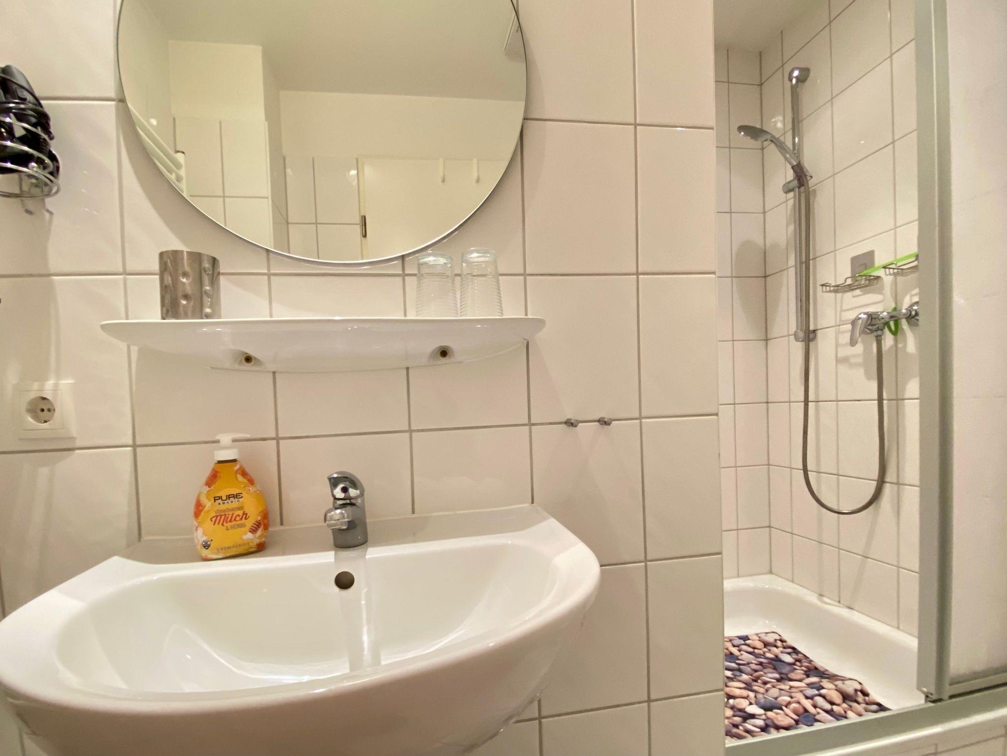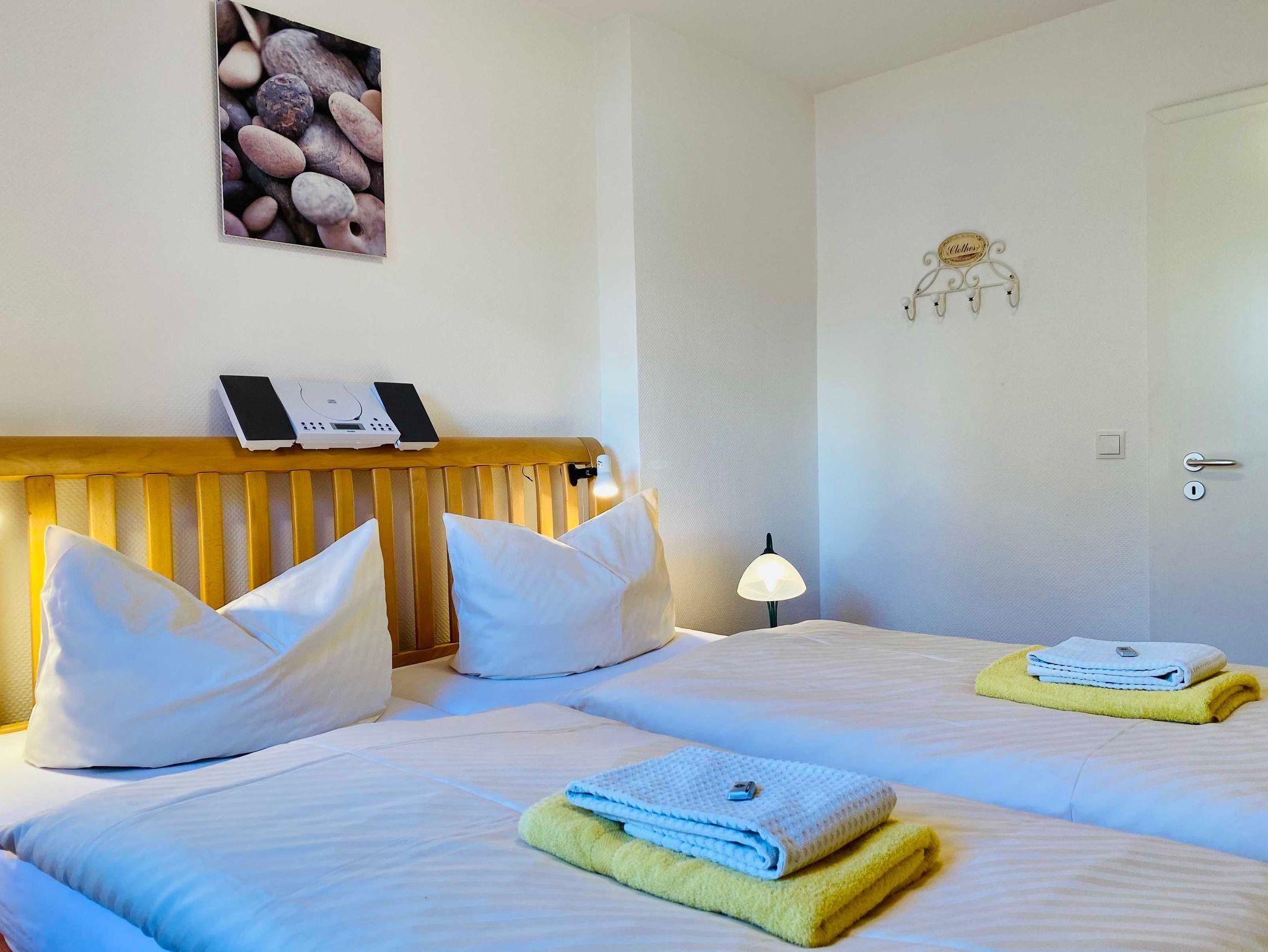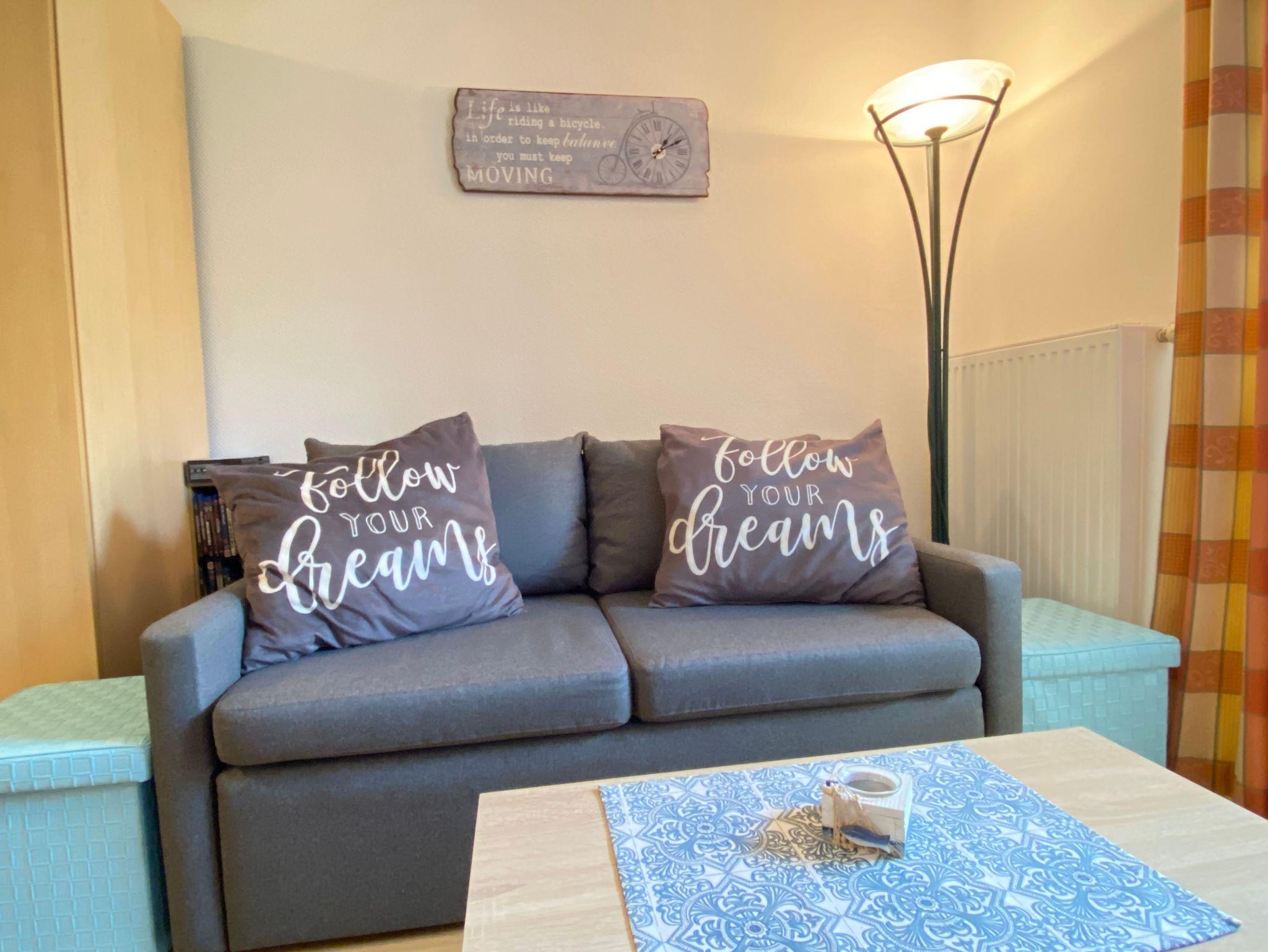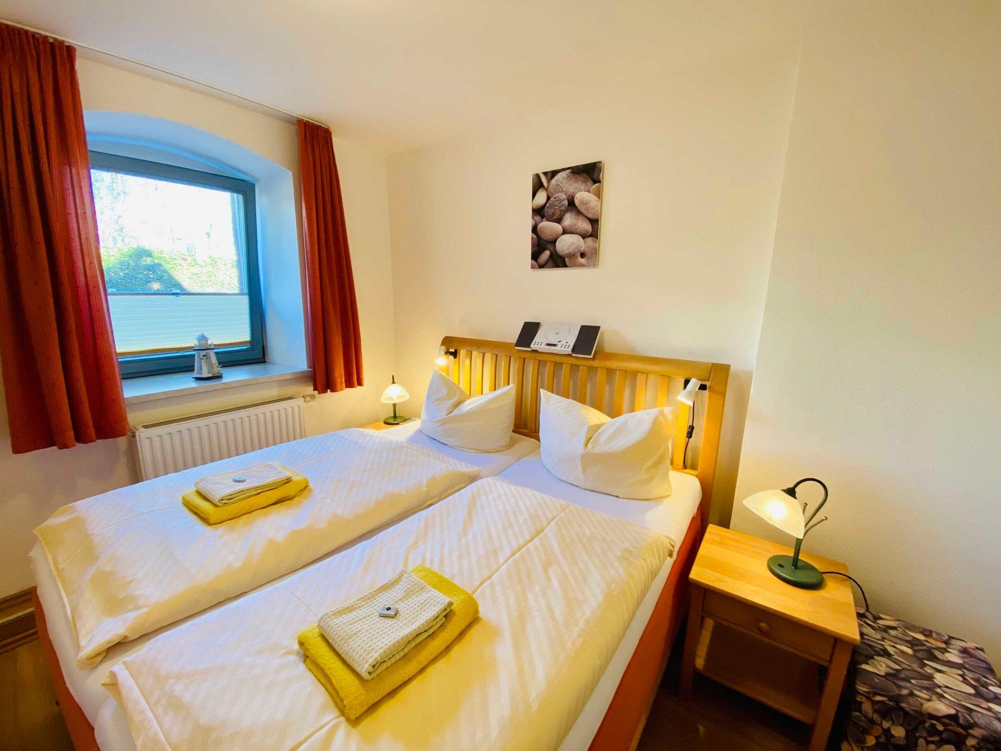 Die kleine 2-Raumferienwohnung verfügt über eine überdachte Terrasse mit Möbeln, ein Bad mit Dusche, ein Schlafzimmer mit Doppelbett in Komforthöhe und CD-Player, einen kombinierten Wohn-Essraum mit kleiner Küchenzeile (Geschirrspüler, 2-Plattenherd, Mikrowelle). Im Wohnzimmer befindet sich ein TV und ein DVD-Player mit DVDs für den Regentag im Urlaub. Stellplatz für den PKW und Fahrradschuppen sind vorhanden. Internet inklusive