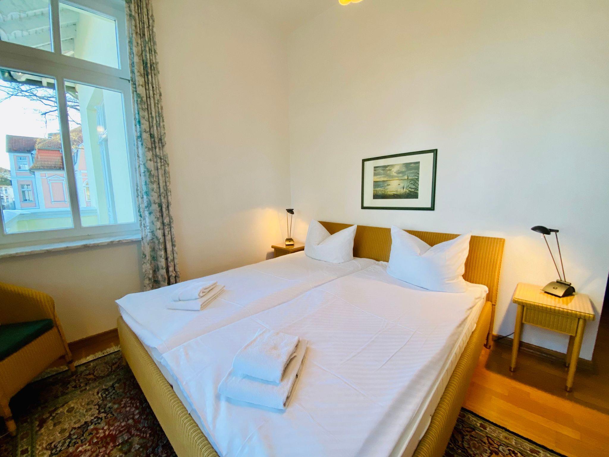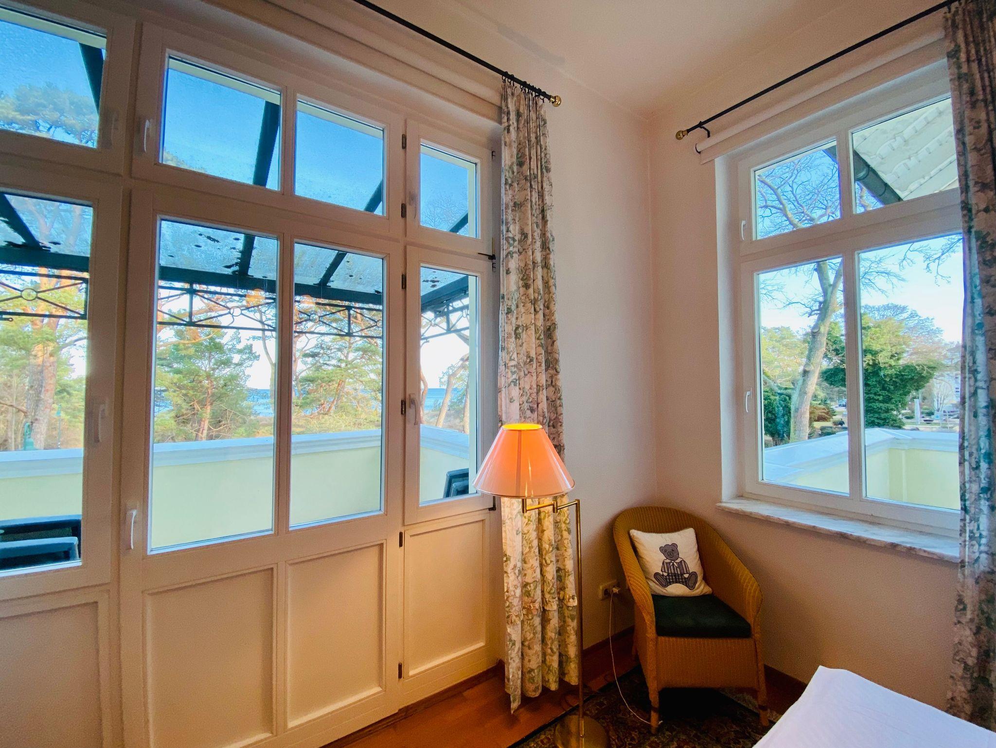 Die tolle Zweiraumwohnung 9C mit Meerblick befindet sich im zweiten Obergeschoss der Villa und ist über das Treppenhaus zu erreichen. Das gemütliche Wohnzimmer mit Sitzecke und Essbereich lädt zum verweilen ein. Vom Wohnzimmer aus gelangen Sie zu 2 der 3 Balkonen Richtung Ostsee und zur separaten Komplettküche. Die Wohnung hat ein geräumiges Schlafzimmer mit Doppelbett und Balkon. Zur Wohnung gehört ein Badezimmer mit Badewanne. Ein Stellplatz steht am Haus kostenfrei zu Verfügung.
