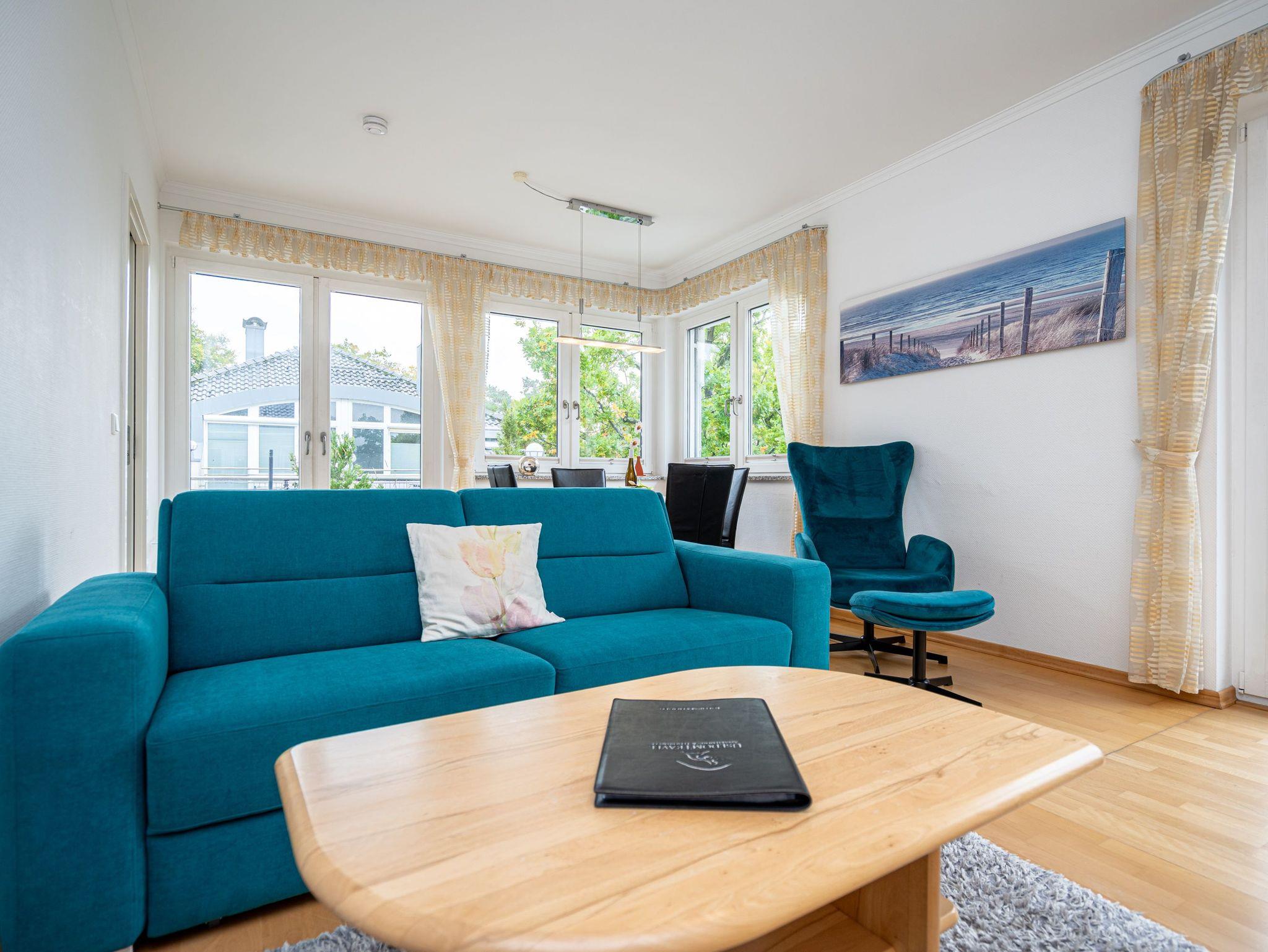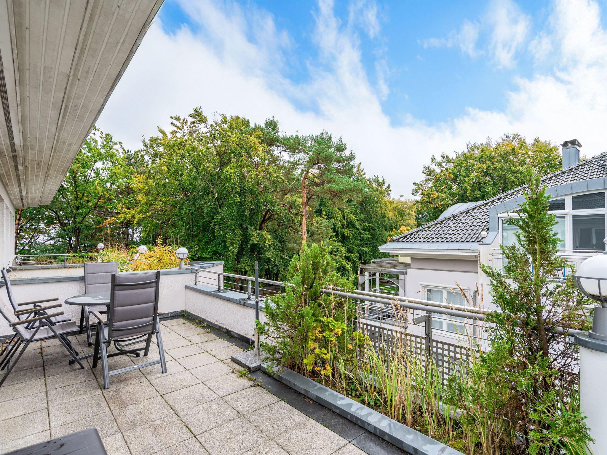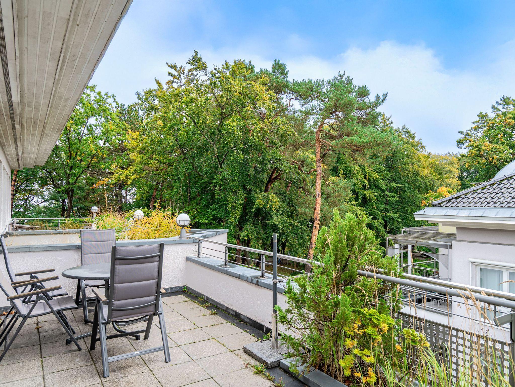 Dem Meeresrauschen ganz nah - in diesem wunderschönen 2-Zimmer-Appartement im 3. Obergeschoss können Sie den Rhythmus der Ostsee gleich auf zwei Balkonen genießen. Das 64 Quadratmeter große Wohlfühl-Domizil schenkt bis zu vier Ostseeliebhabern eine Traumauszeit mit Ausblick. Denn die windschiefen Kiefern gewähren vom Südost-Balkon aus Sicht auf glitzernde Wellen und blaue Weite. Doch auch der zweite Balkon hat in Südwest-Ausrichtung seine sonnig schönen Seiten. Ist es zu heiß, spannen Sie einfach den Sonnenschirm auf und genießen das laue Lüftchen aus dessen Schatten heraus. Beide Balkone können Sie vom geräumigen Wohn-Esszimmer aus betreten. Hier finden Sie viel Platz für entspannte Stunden. Das große Sofa lässt sich ausziehen, so dass zwei Personen darauf bequem übernachten können. Der Flat-TV ist mit einem DVD-Player verbunden. Am großzügigen Esstisch mit vier Stühlen werden gemeinsame Essen zu unterhaltsamen Mußestunden. Die separate Küche ist mit allem Nötigen ausgerüstet. Moderne Markengeräte erleichtern jeden Arbeitsschritt. Im Schlafzimmer schenkt Ihnen ein komfortables Boxspringdoppelbett (1,80 m x 2,00 m) erholsames Schlafvergnügen. Ein geräumiger Einbauschrank offenbart reichlich Ablageflächen. Auch im Schlafzimmer befindet sich ein Flat-TV. Das Appartement verfügt über zwei Bäder. Eines hat eine Badewanne. Das zweite ist mit einer Dusche versehen. Handtücher liegen für Sie bereit. Für die schnelle Wäsche zwischendurch befindet sich im Untergeschoss des Hauses eine Münzwaschmaschine und ein Münztrockner. Das WLAN ist kostenfrei. Bei Anreise sind die Betten bezogen. Für Ihr Auto gibt es im Doppelparker Nummer 1 einen Stellplatz (max. Pkw-Höhe 1,50 m, Pkw-Länge max. 5,00 m / Gewicht max. 2t).