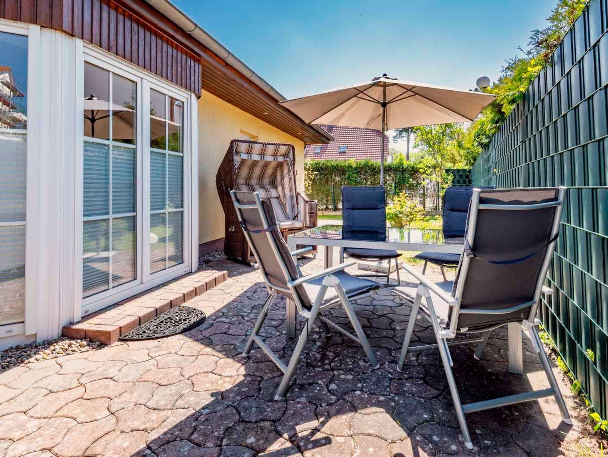 • Terrasse: Gestaltet mit einem Tisch, vier Stühlen, einem zweier Strandkorb und Grill, neben einem Sonnenschirm.