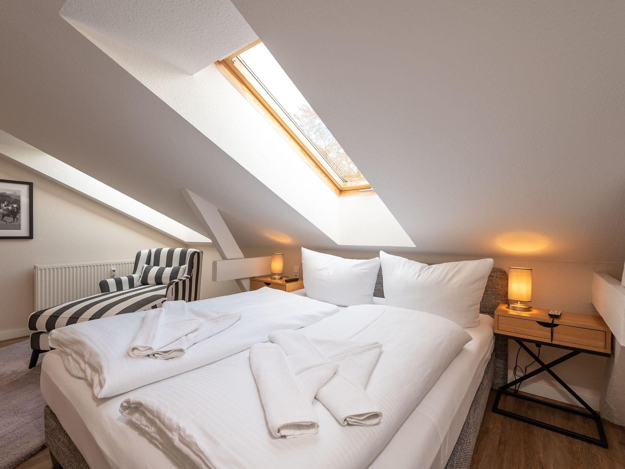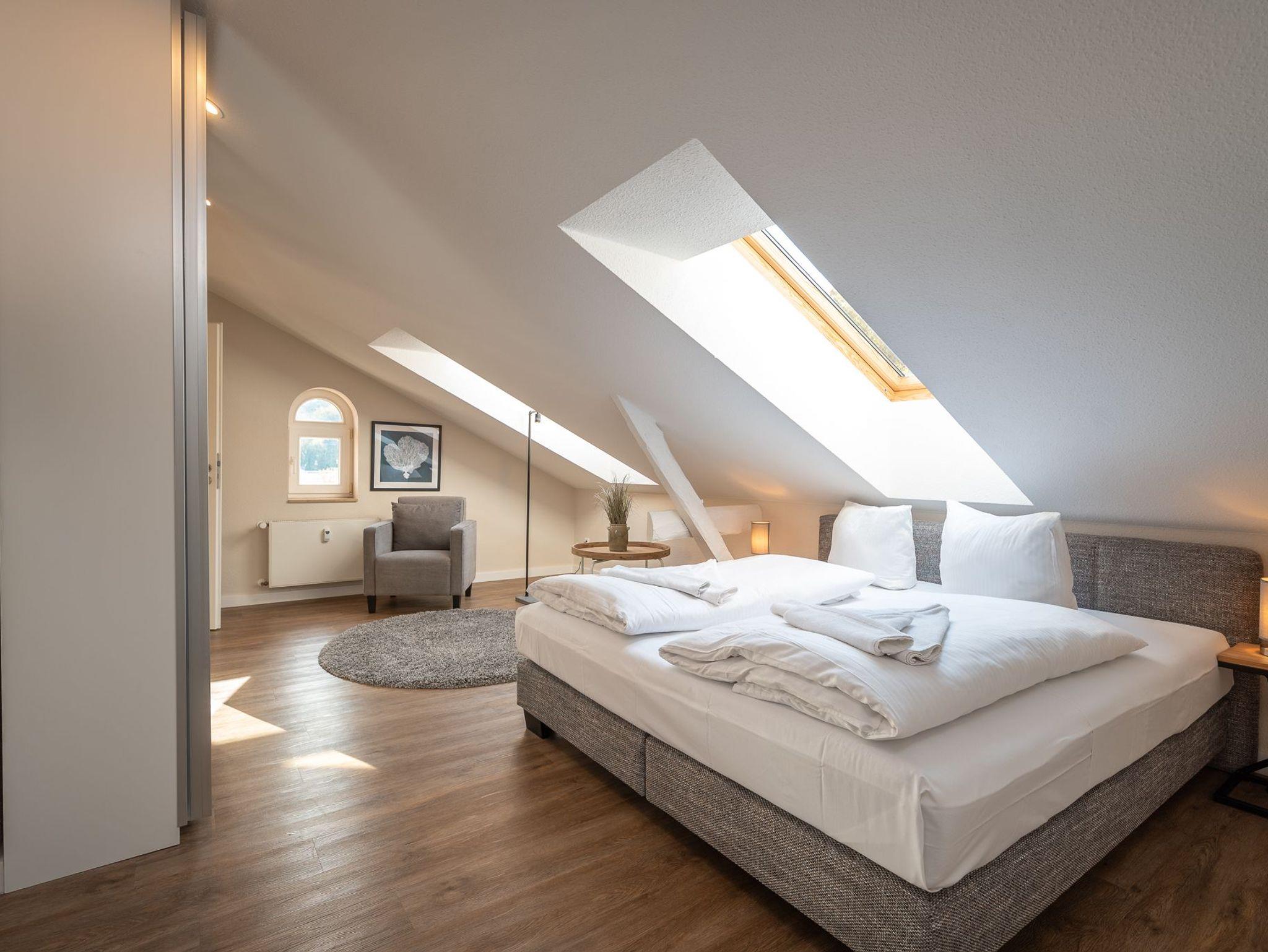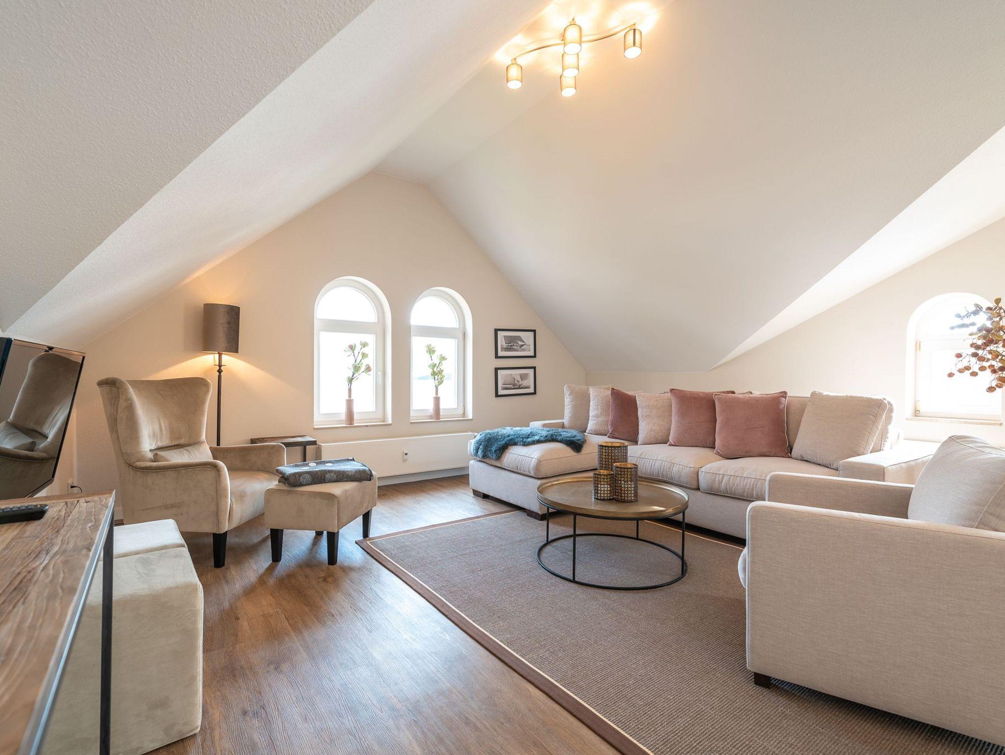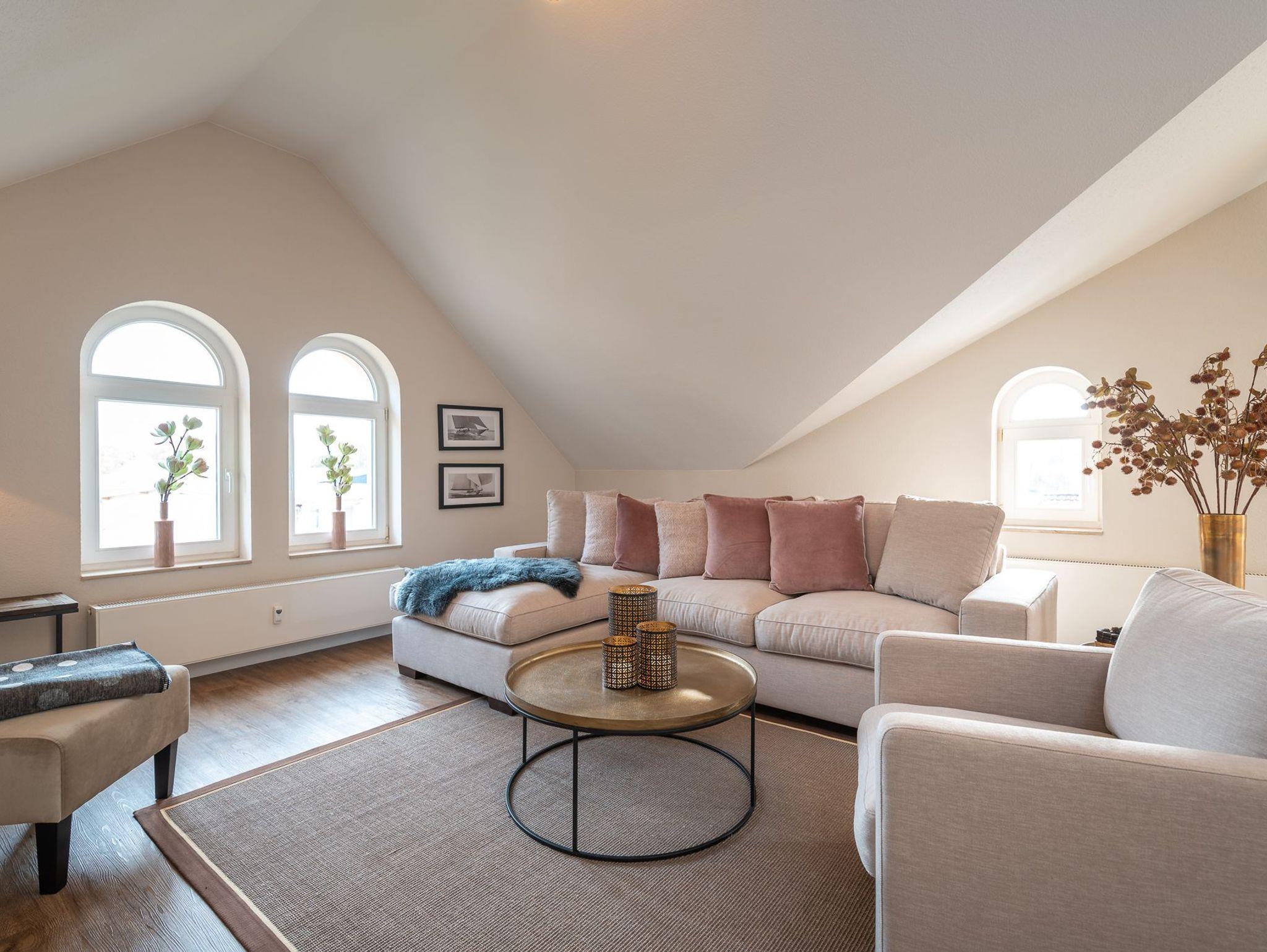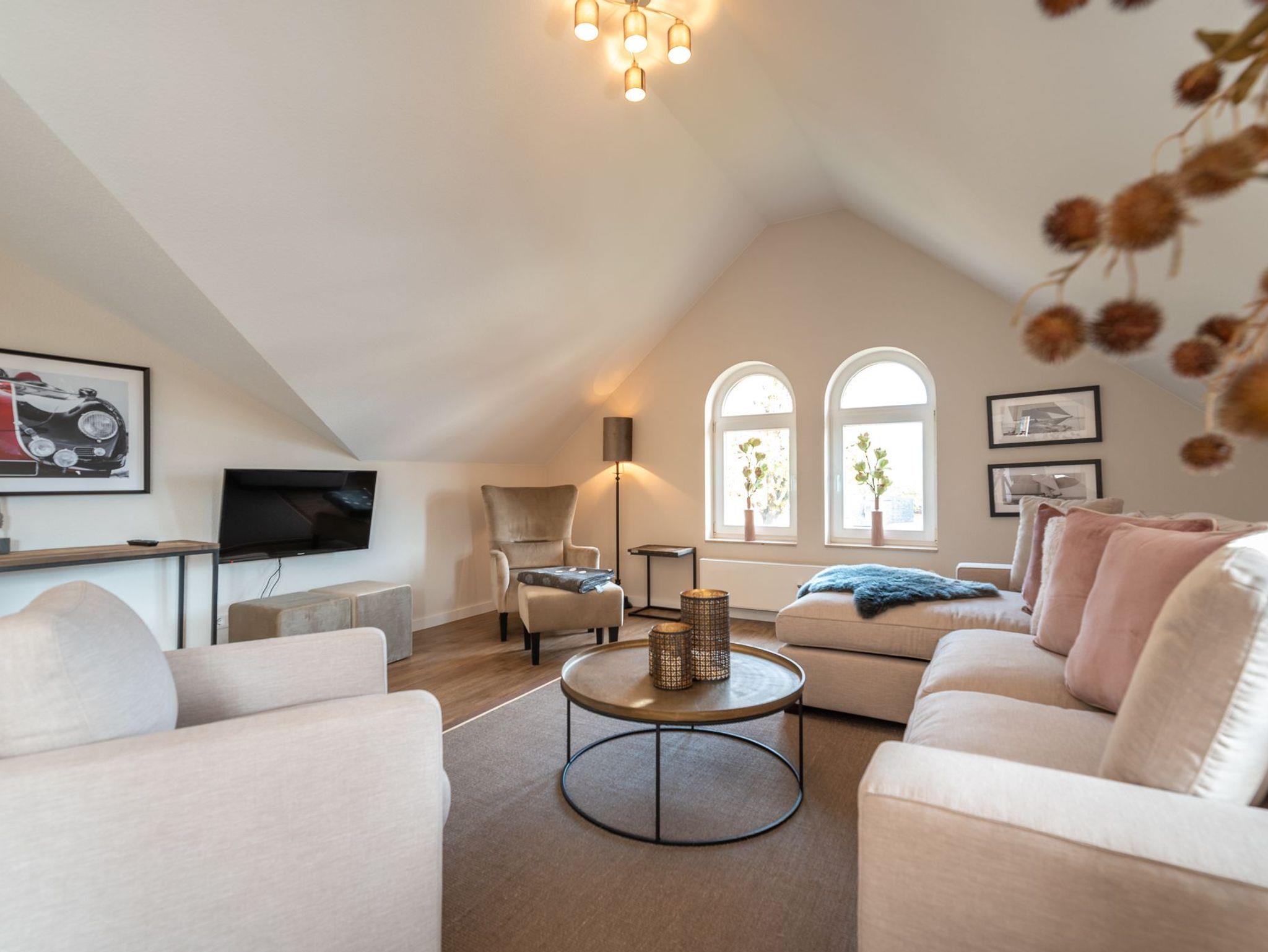 Diese außergewöhnlich geschnittene Dachgeschosswohnung befindet sich in einer außergewöhnlichen Villa im Herzen von Seebad Heringsdorf. Das 1898 erbaute Haus wurde 2017 aufwendig saniert und der Charme aus kaiserlichen Zeiten gekonnt mit dem exklusiven Wohnkomfort der heutigen Zeit kombiniert. Das 106qm große Appartement empfängt Sie mit einem hellen Wohn-Essbereich. Farben wie Sand und Beige, dazu eine hochwertige Möblierung sorgen für ein exklusives Wohngefühl. Der großzügige Wohnbereich verfügt über einen Flat-TV und eine gemütliche Sitzgruppe, die zum Schlafsofa umfunktioniert werden kann und Platz für zwei Aufbettungen bietet. Weitere 4 Personen finden in den beiden Schlafzimmern mit Boxspringbetten und Flat-TV ausreichend Raum für einen erholsamen Schlaf. Außerdem verfügen die Fenster über einen Sonnenschutz und Verdunklungsrollos. Zwei Duschbäder mit WC, Waschtisch und Dusche sind jeweils mit den Schlafzimmern verbunden und bieten somit Privatsphäre für Reisen mit der Familien oder Freunden. Ein kleiner Balkon ist vom Wohnzimmer aus zu erreichen. Genießen Sie den Blick über die Dächer des Seebades vom Echtholztisch aus, der Platz für bis zu 6 Personen bietet. Keine Wünsche lässt die voll ausgestattete Küche mit Herd, Backofen, Kühlschrank, Spülmaschine, Senseo-Kaffeemaschine sowie Kleinküchengeräte offen. Ihre Fahrräder finden im Fahrradständer am Haus oder im Gemeinschaftsraum Platz. Kostenfreies W-Lan rundet das Appartement ab. Bei Ihrer Anreise sind die Betten bereits bezogen und Handtücher liegen für Sie bereit.