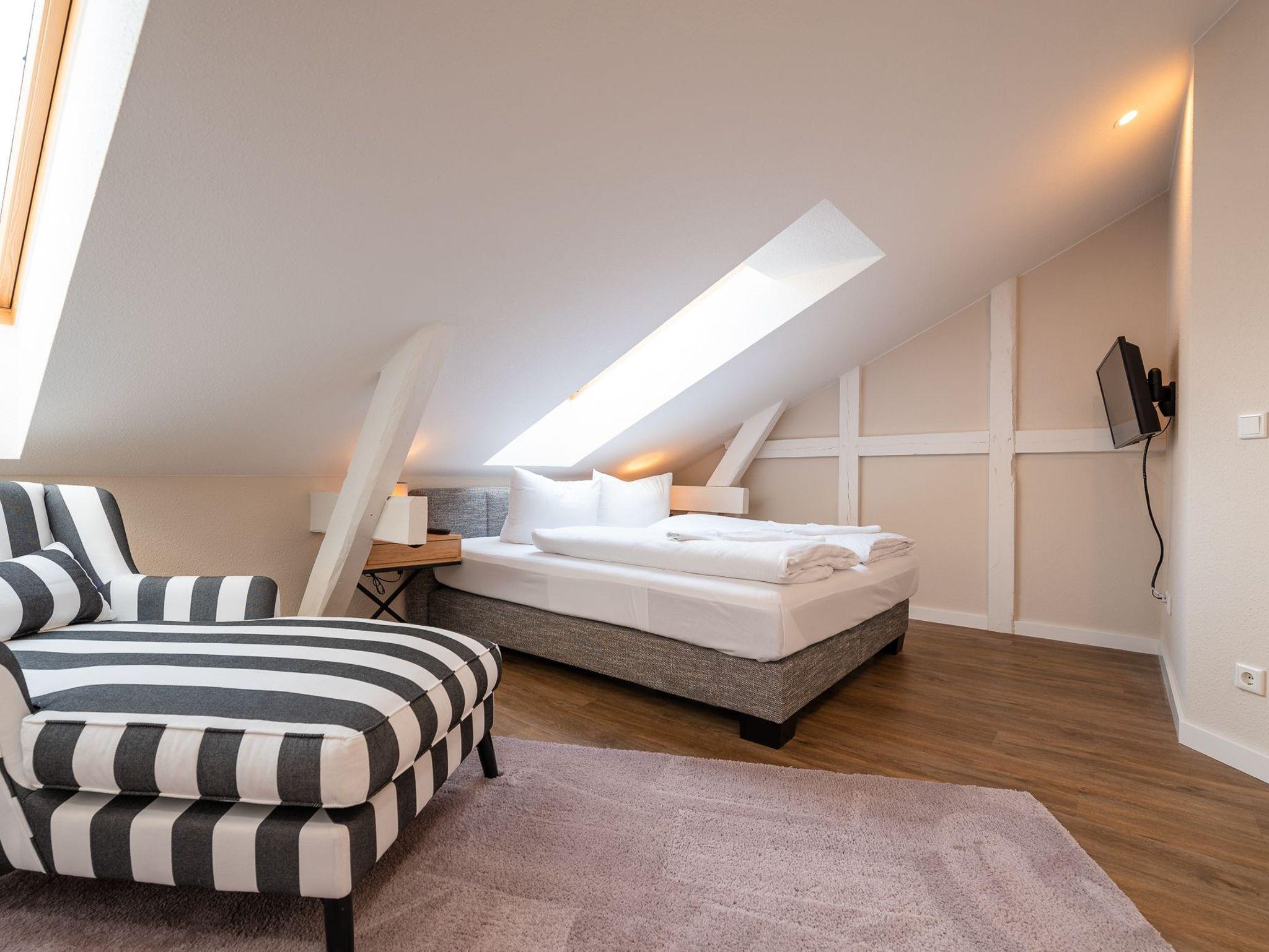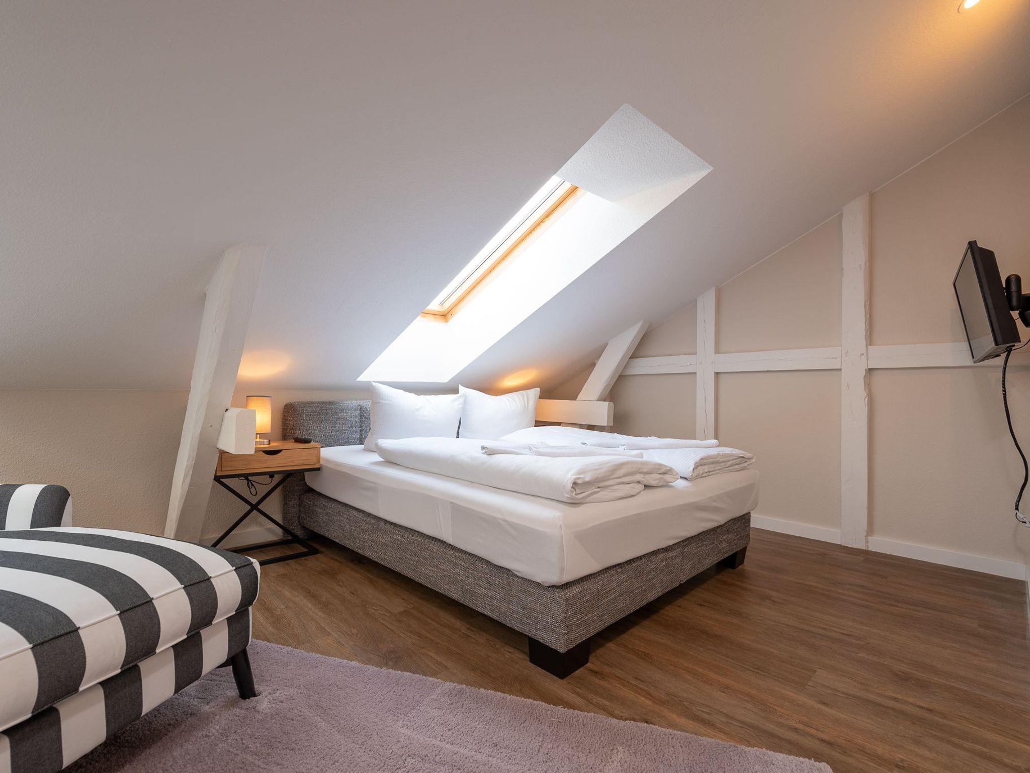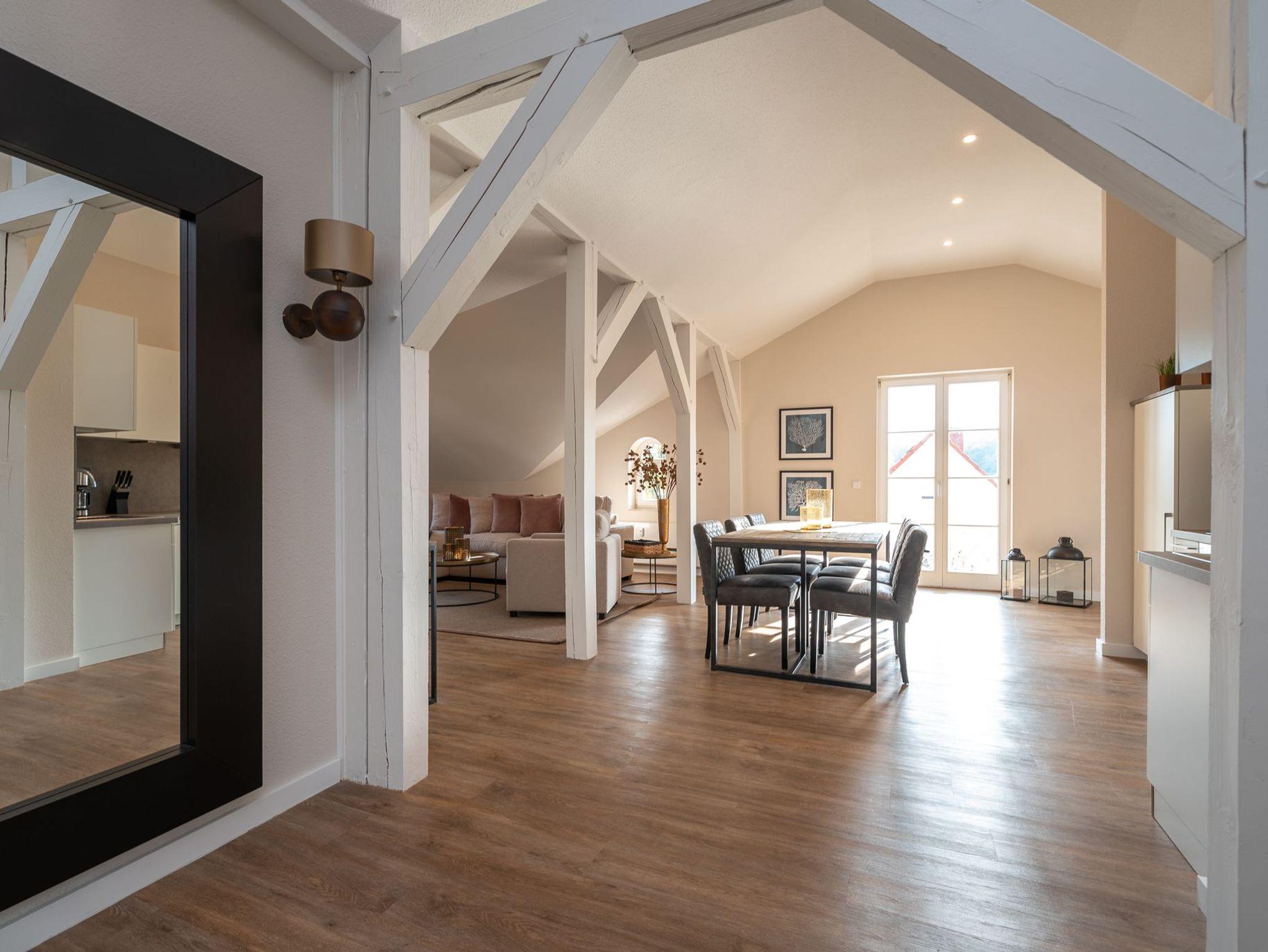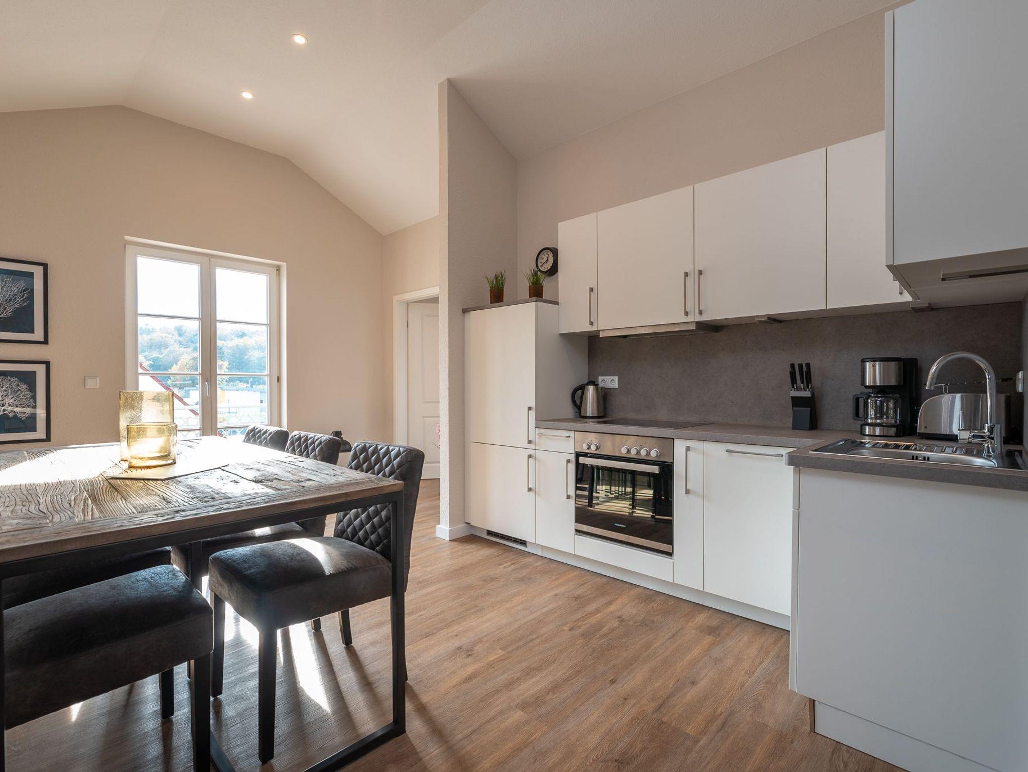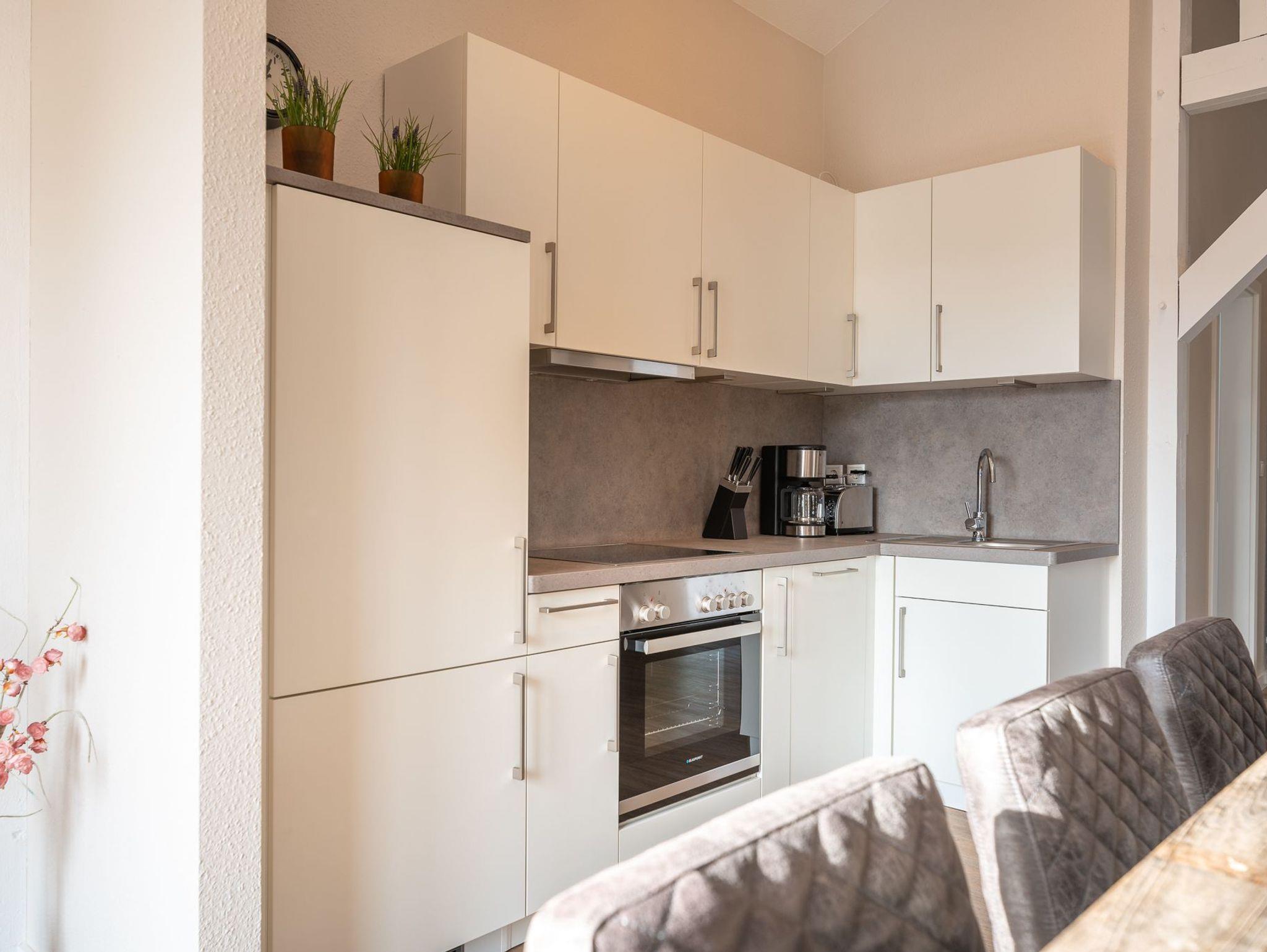 Diese außergewöhnlich geschnittene Dachgeschosswohnung befindet sich in einer außergewöhnlichen Villa im Herzen von Seebad Heringsdorf. Das 1898 erbaute Haus wurde 2017 aufwendig saniert und der Charme aus kaiserlichen Zeiten gekonnt mit dem exklusiven Wohnkomfort der heutigen Zeit kombiniert. Das 106qm große Appartement empfängt Sie mit einem hellen Wohn-Essbereich. Farben wie Sand und Beige, dazu eine hochwertige Möblierung sorgen für ein exklusives Wohngefühl. Der großzügige Wohnbereich verfügt über einen Flat-TV und eine gemütliche Sitzgruppe, die zum Schlafsofa umfunktioniert werden kann und Platz für zwei Aufbettungen bietet. Weitere 4 Personen finden in den beiden Schlafzimmern mit Boxspringbetten und Flat-TV ausreichend Raum für einen erholsamen Schlaf. Außerdem verfügen die Fenster über einen Sonnenschutz und Verdunklungsrollos. Zwei Duschbäder mit WC, Waschtisch und Dusche sind jeweils mit den Schlafzimmern verbunden und bieten somit Privatsphäre für Reisen mit der Familien oder Freunden. Ein kleiner Balkon ist vom Wohnzimmer aus zu erreichen. Genießen Sie den Blick über die Dächer des Seebades vom Echtholztisch aus, der Platz für bis zu 6 Personen bietet. Keine Wünsche lässt die voll ausgestattete Küche mit Herd, Backofen, Kühlschrank, Spülmaschine, Senseo-Kaffeemaschine sowie Kleinküchengeräte offen. Ihre Fahrräder finden im Fahrradständer am Haus oder im Gemeinschaftsraum Platz. Kostenfreies W-Lan rundet das Appartement ab. Bei Ihrer Anreise sind die Betten bereits bezogen und Handtücher liegen für Sie bereit.