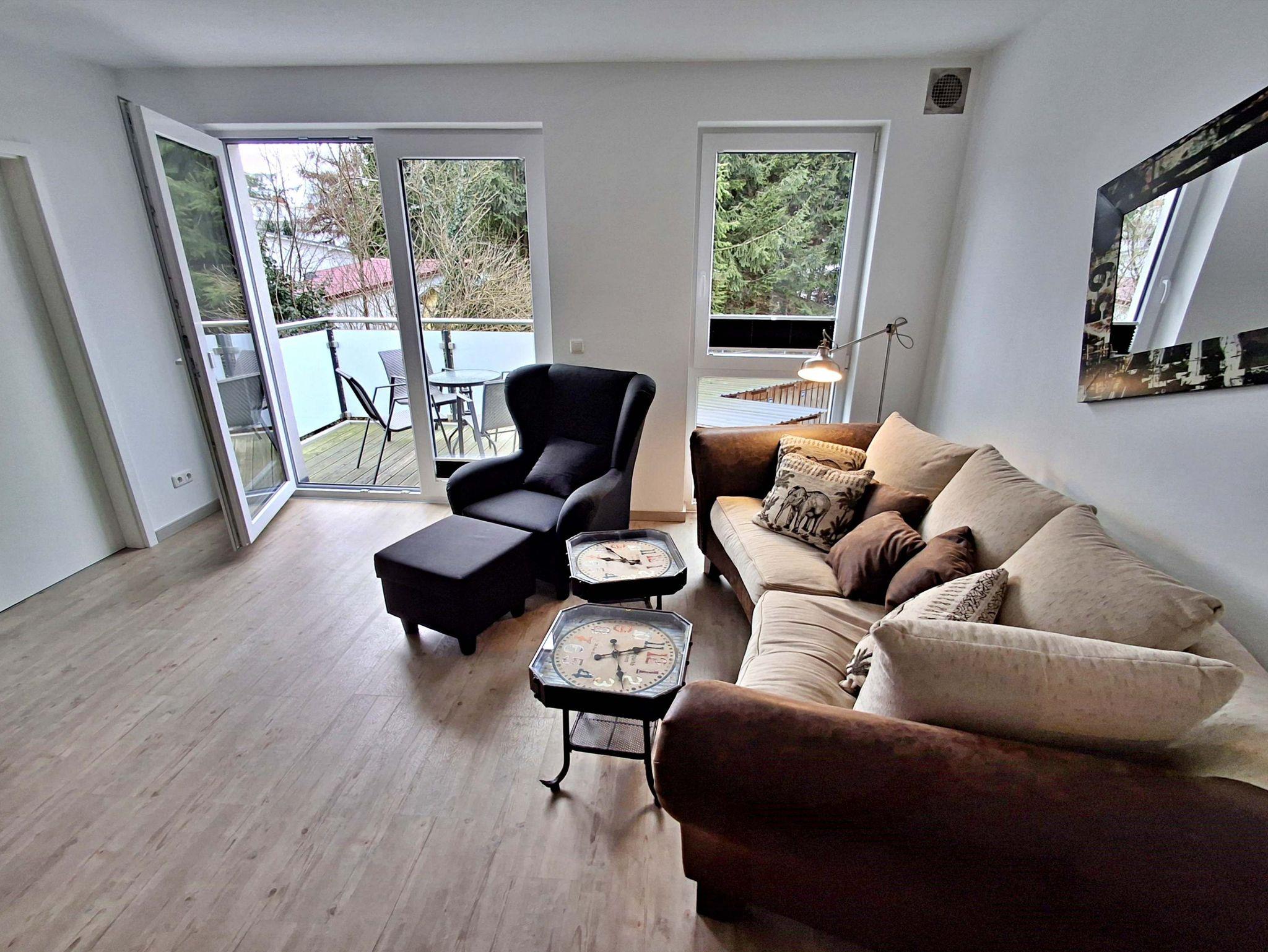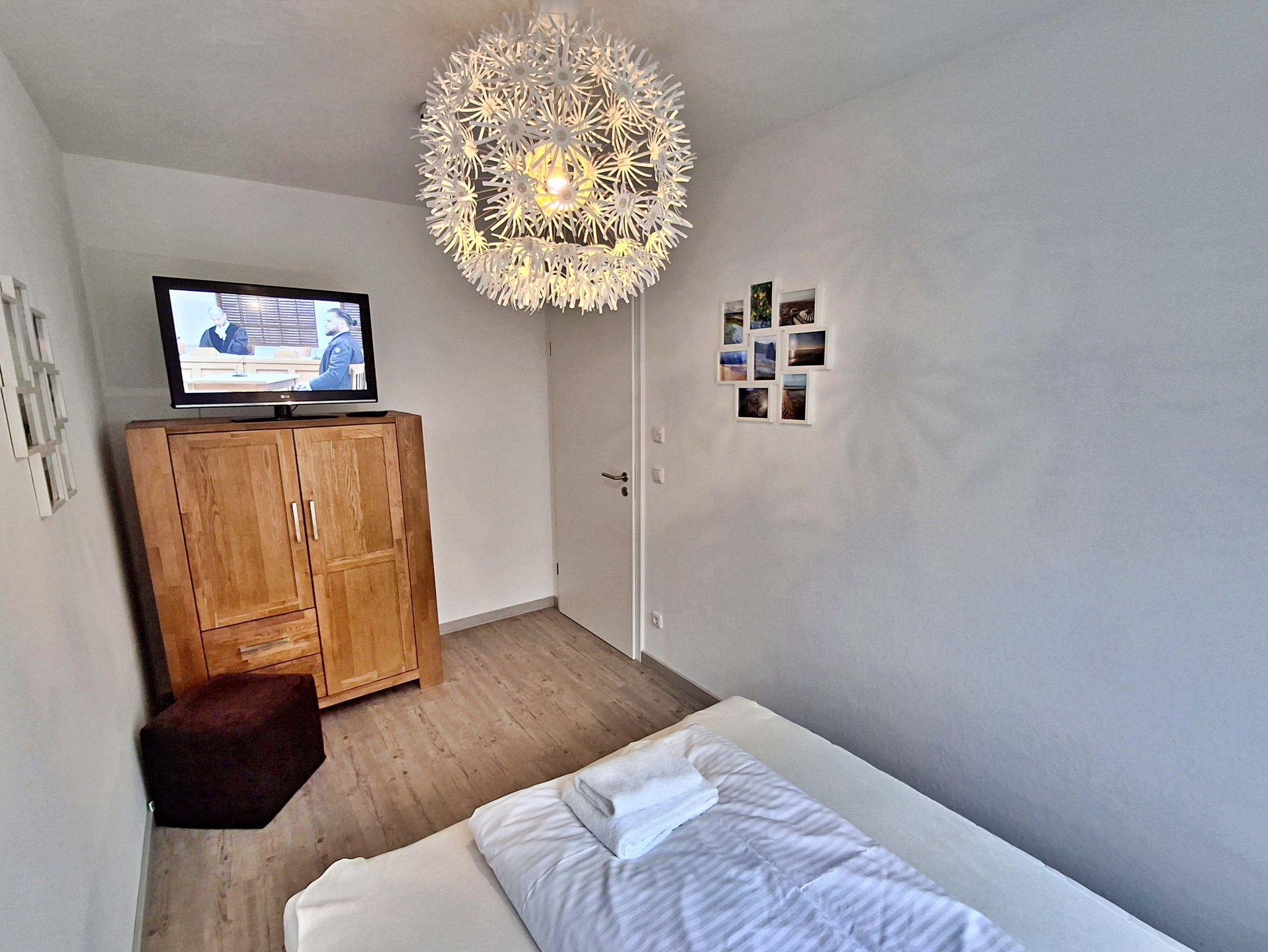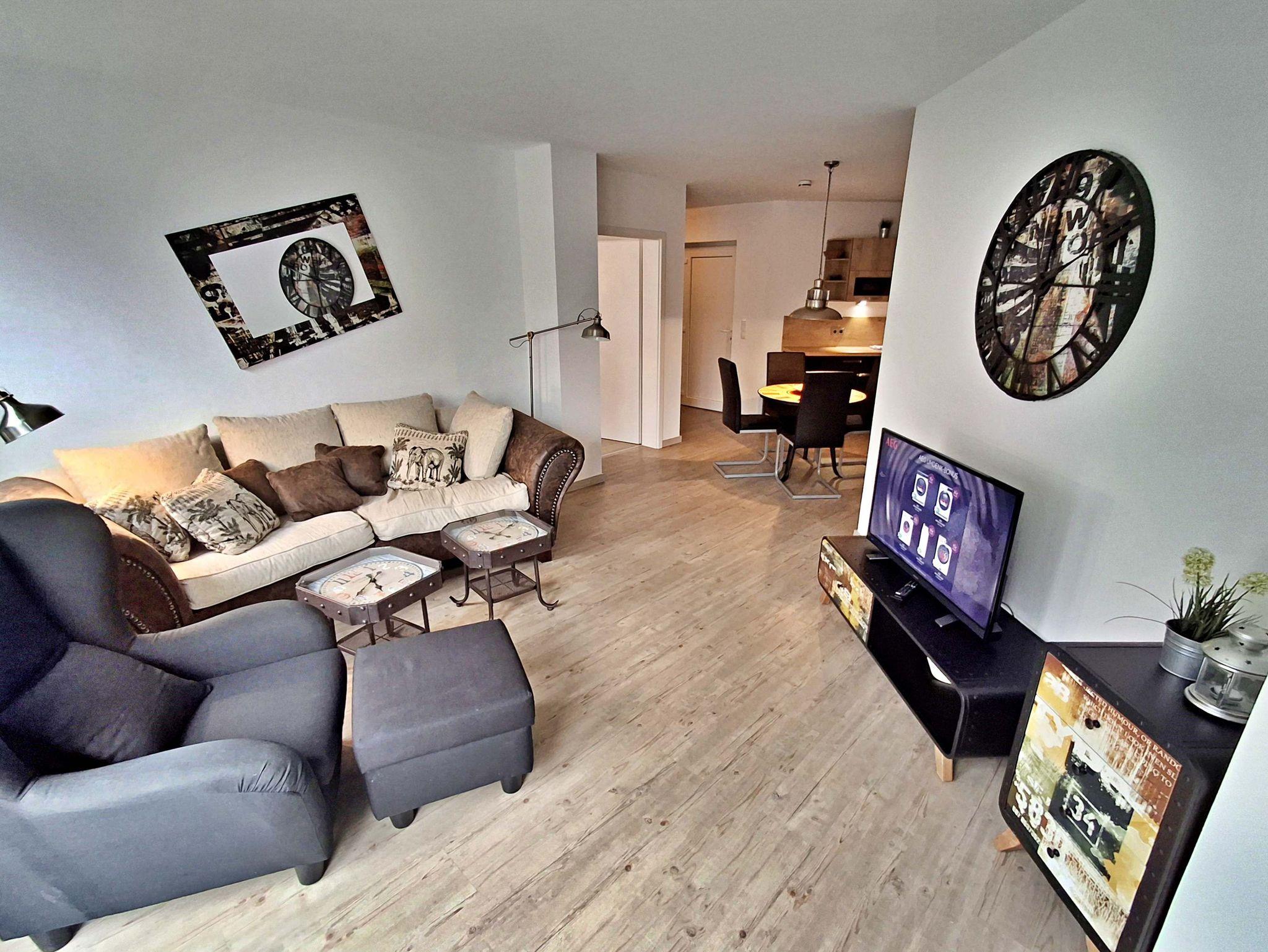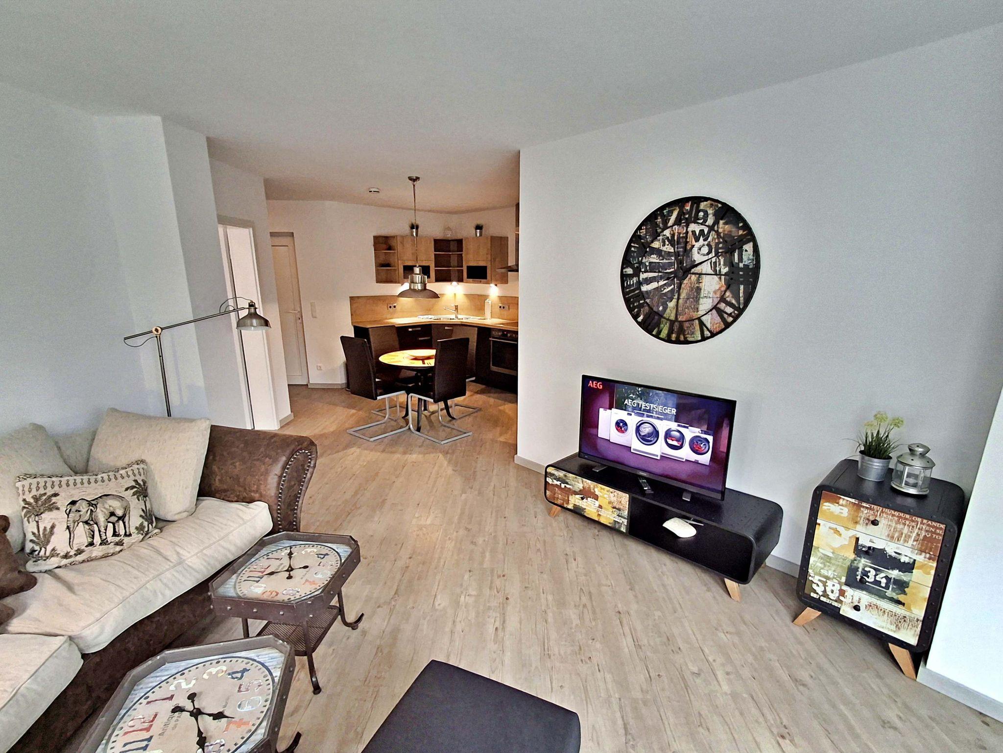 Diese gemütliche Wohnung im 1. Obergeschoss lädt Sie ein sich wohlzufühlen und bietet auf 58 qm genügend Platz für bis zu 4 Personen um einen erholsamen Urlaub zu verbringen. Genießen Sie entspannte Stunden im Wohnzimmer mit einer bequemen Couch und einem Flachbild-TV. Die gut ausgestattete Küchenzeile bietet alles, was Sie für Ihre kulinarischen Abenteuer benötigen - von einem Ceranfeld über einen Backofen bis hin zu einer Kaffeemaschine und einem Geschirrspüler. Der Essplatz für 4 Personen ist perfekt für gesellige Mahlzeiten.