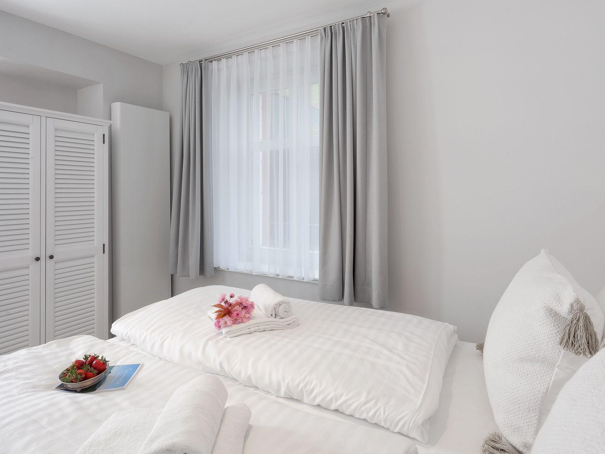Das helle Schlafzimmer verfügt über ein Doppelbett (180 x 200 cm), Kleiderschrank und Radiowecker. Das Tageslichtbadezimmer ist ausgestattet mit Handtuchheizung, Dusche, WC, Waschtisch mit darunterliegender Ablagemöglichkeit, Radio, Haartrockner und Kosmetikspiegel.
