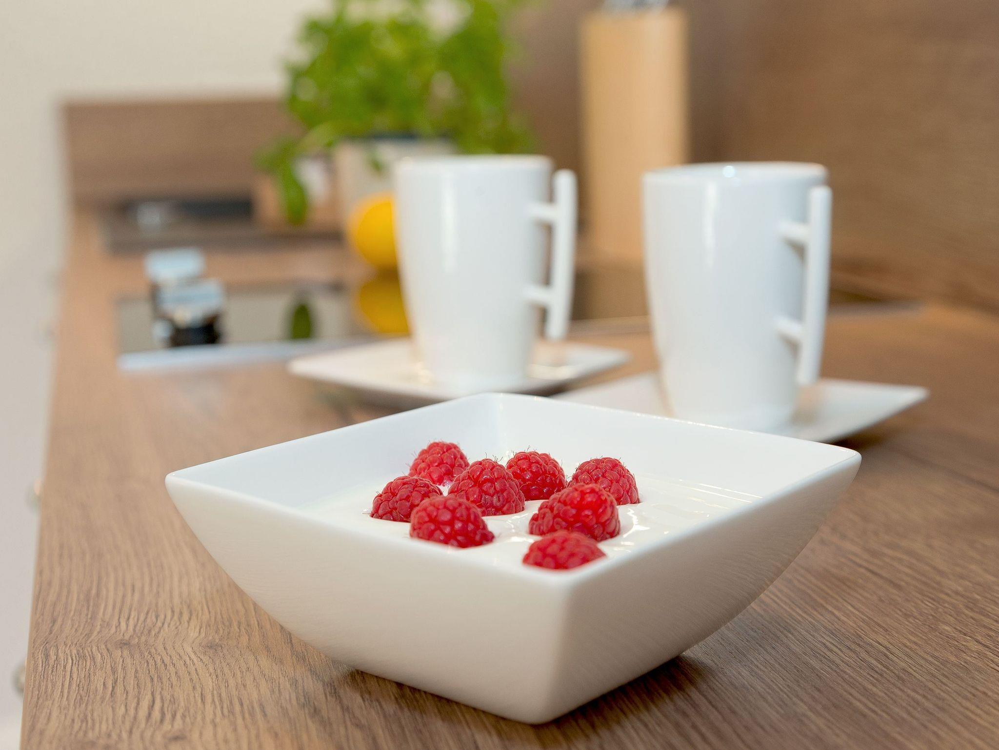 Die Küchenzeile ist mit einem 2 Platten Cerankochfeld, Kühlschrank mit Gefrierfach, Backofen mit integrierter Mikrowelle, Geschirrspülmaschine, Kaffeemaschine, Wasserkocher und Toaster ausgestattet.