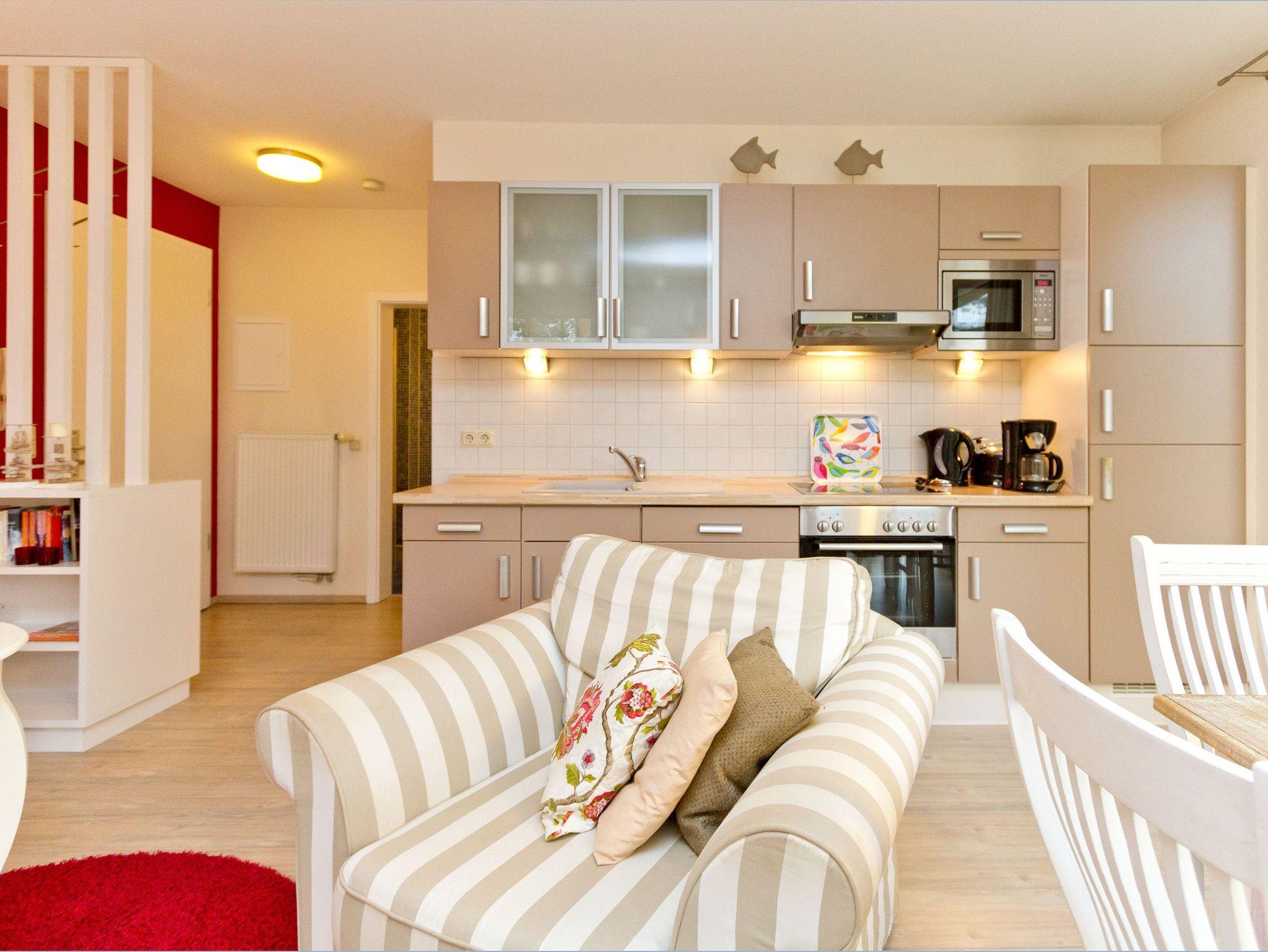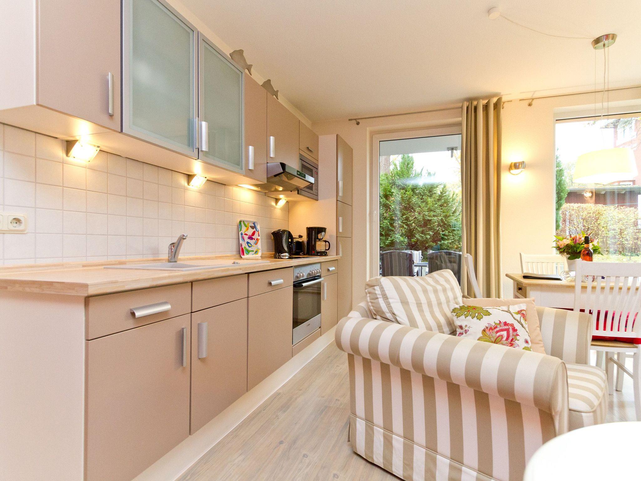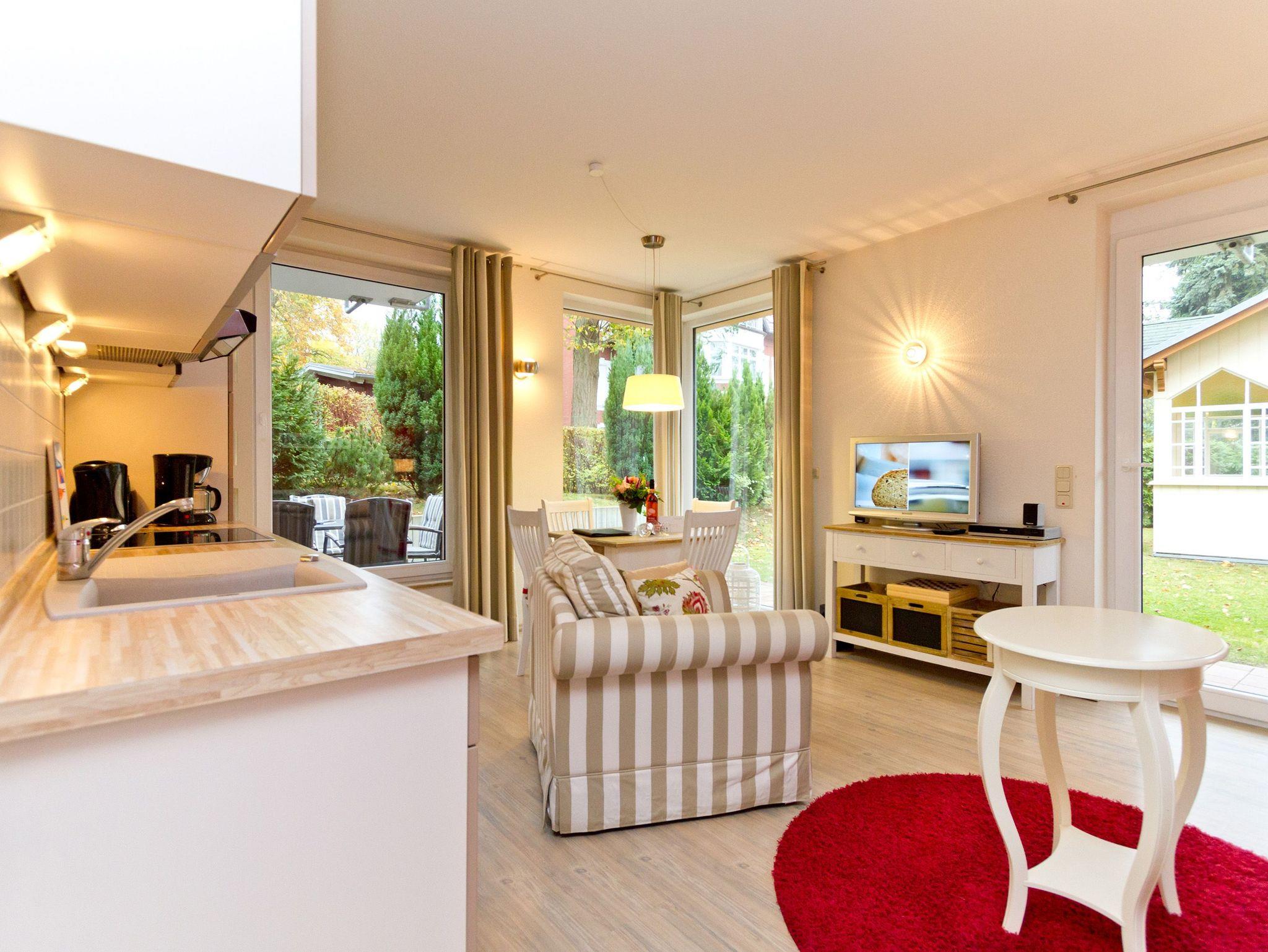 Diese 2-Raum-Ferienwohnung besticht durch eine zeitlos elegante Einrichtung und harmonierende Stoffe und Farben. Das helle Wohnzimmer mit Flachbild-TV und die komplett ausgestattete Küchenzeile eignen sich für einen komfortablen Urlaub. Im stylischen Schlafzimmer mit Doppelbett (1,80m x 2,00m) findet auch ein Babyreisebett Platz. Auf der umlaufenden Terrasse genießen sie die Morgen- und Nachmittagssonne und als besonderes Bonbon steht Ihnen noch ein kleines Teehäuschen vor Ihrer Terrasse zur Verfügung. Auf Wunsch stellen wir für unsere kleinen Gäste ein Kinderreisebett (ohne zusätzliche Matratze [&] Bettzeug) und einen Kinderhochstuhl ( gegen einen Aufpreis) zur Verfügung. Für Ihren Komfort sind die Betten bei der Anreise bezogen und Handtücher liegen bereit. Ein tolles Domizil für zwei Erwachsene und ein Kleinkind.