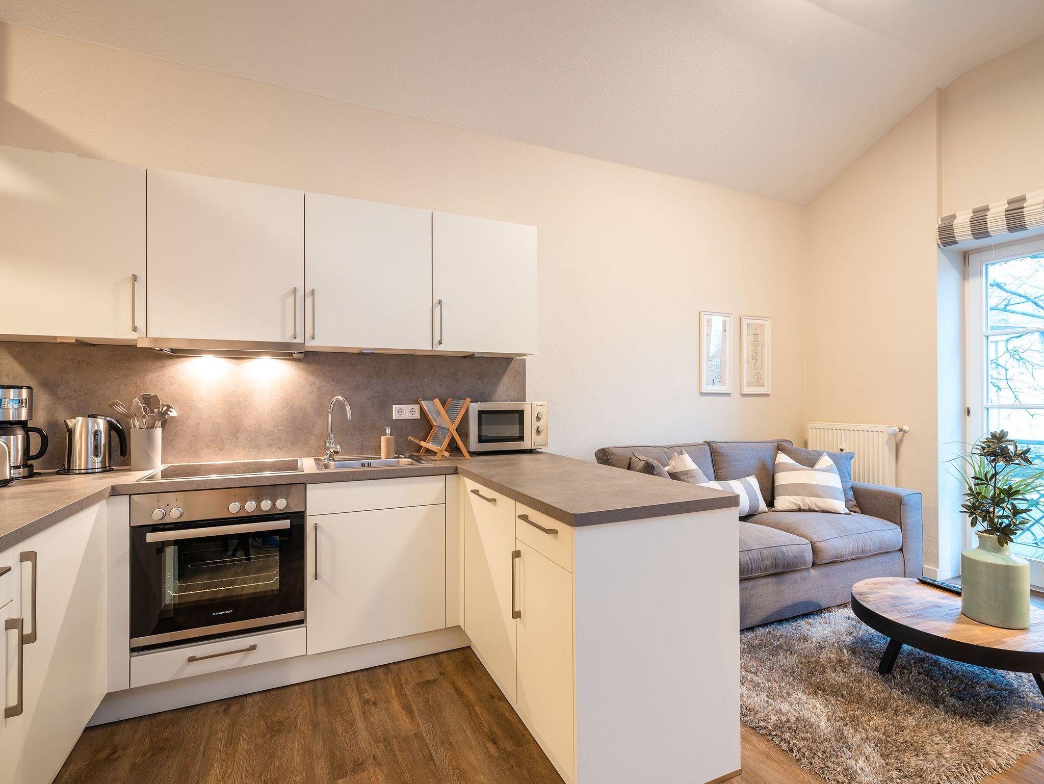 Das 73 qm große Dachgeschoss-Appartement 5 in der denkmalgeschützten Villa Doctores verbindet historischen Charme mit modernem Wohnkomfort. Auf einer sanften Anhöhe unter alten Buchen gelegen, genießen Sie Ruhe und Idylle, während der feinsandige Strand nur etwa drei Gehminuten entfernt liegt. Das Appartement bietet ausreichend Platz für bis zu 4 Personen sowie ein Kleinkind und überzeugt durch eine helle, geschmackvolle Einrichtung. Der Wohnbereich ist mit einer Schlaf-Couch (als Aufbettung für eine 5. Person möglich) ausgestattet, zwei Schlafzimmer verfügen über komfortable Boxspringbetten (1,60 m und 1,80 m) und jeweils ein modernes Duschbad. Die Küchenzeile ist vollständig ausgestattet, der Echtholzesstisch lädt zu gemeinsamen Mahlzeiten ein. Vom kleinen Balkon aus können Sie entspannt die Umgebung genießen. Zu den Extras gehören WLAN und ein reservierter Tiefgaragenstellplatz. Appartement 5 in der Villa Doctores bietet die ideale Kombination aus stilvollem Ambiente, Nähe zum Strand und Zugang zur lebendigen Heringsdorfer Promenade ? ein perfekter Ort für einen entspannten Urlaub.