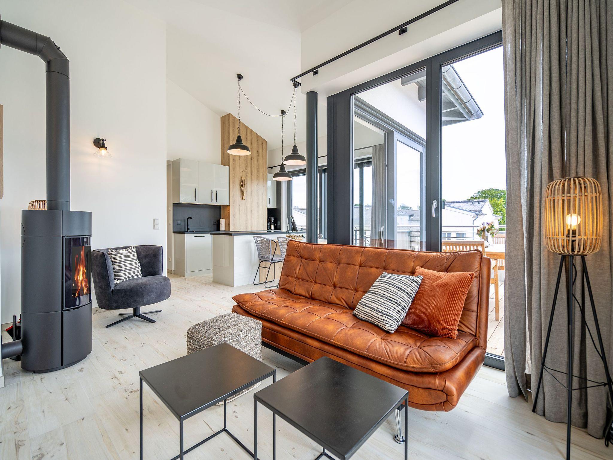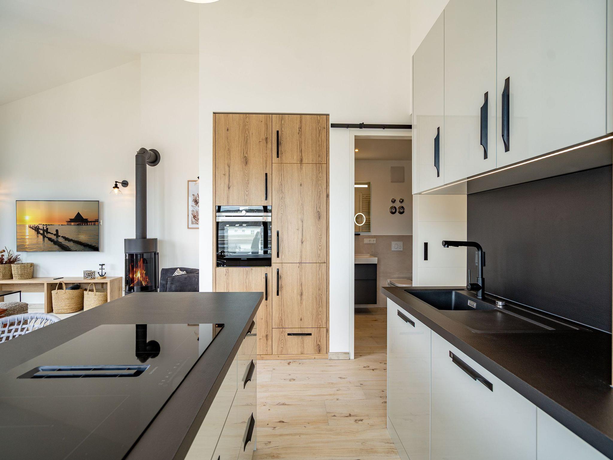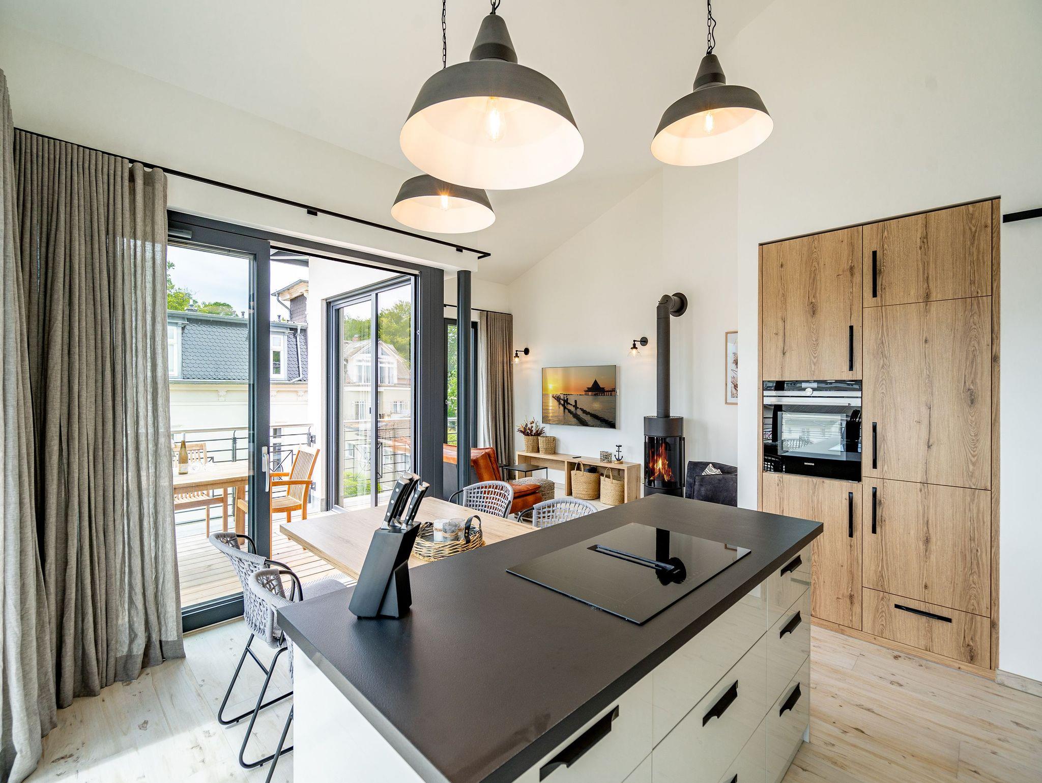 Wenn der Urlaub mit Leichtigkeit beginnt, sind Sie im Appartement 11 im Quartier am Strand angekommen. Helle, aufeinander abgestimmte Farben und ein dezentes Interieur begrüßen Sie in diesem 3-Raum-Penthouse im Obergeschoss. Die insgesamt 94 Quadratmeter bieten ausreichend Platz für bis zu 4 Personen. Bodentiefe Fenster sorgen für ausreichend Usedomer Sonne in Ihrem Urlaubsdomizil. Die Lage des Objektes ist nicht nur strandnah, durch die wohnungsumlaufende Terrasse können Sie sich, bei richtigen Windverhältnissen, das Rauschen der Ostsee jederzeit in Ihr Appartement holen. Für noch mehr Leichtigkeit im Urlaub stehen zwei Schlafzimmer, die jeweils mit bequemen Doppelbetten (1,80m x 2,00m) und ausreichend Schrankraum für Ihre Urlaubsgarderobe ausgestattet sind, bereit. Ein Schlafbereich verfügt außerdem über einen Flat-TV und ein eigenes Badezimmer mit Fenster, Regendusche, Waschtisch und WC. Hier wartet ein kleiner Tisch mit zwei Stühlen auf der Terrasse mit seitlichem Meerblick ebenfalls darauf von Ihnen genutzt zu werden. Das Sonnenbaden wird Ihnen auf der Liege der zweiten Schlafzimmerterrasse leicht gemacht. Ein Highlight bildet das innenliegende Masterbad mit Regendusche, Waschtisch, WC und eigener Finnischer Sauna. Ob als Familie oder gemeinsam mit Freunden - hier können Sie auch an kühleren Tagen mit Ihren Mitreisenden den Tag entspannt ausklingen lassen. Der großzügige Wohn-Essbereich ist offen gehalten und bietet sehr viel Raum für die Zubereitung Ihrer Speisen oder gemeinsame Abende vor dem Flat-TV. Eine Kochinsel trennt den Wohnbereich vom Essplatz, der ihnen bis zu vier Personen die Möglichkeit gibt gemeinsam zu speisen. Ein großer Holztisch mit 4 Stühlen auf der angrenzenden Terrasse bietet außerdem die Möglichkeit outdoor Ihre Mahlzeiten einzunehmen. Hochwertige Siemens-Geräte wie Backofen, Kochfeld und Geschirrspüler sowie ein Kühlschrank mit Gefrierschrank und eine Nespresso-Kapselmaschine machen das Kochen auch im Urlaub für Hobby- und Profiköche leicht. Ein weiteres Highlight ist der ins Wohnzimmer integrierte Holzkamin. Dem Knistern lauschen Sie am besten vom Sessel oder der stylischen Couch aus, die den Blickfang im Wohnzimmer bildet. Damit Ihnen das Abschalten im Urlaub richtig gelingt, wurde in diesem Penthouse selbstverständlich an einen Waschtrockner gedacht, der Ihnen kostenfrei im Appartement zur Verfügung steht. Zwei PKW-Stellplätze in der hauseigenen Tiefgarage sowie kostenfreies W-Lan zählen ebenfalls zu den Annehmlichkeiten dieser Wohnung. Für Ihre Fahrräder können Sie einen wohnungseigenen Abstellraum nutzen. Bei Ihrer Anreise dürfen Sie sich außerdem auf bezogene Betten und im Appartement liegende Handtücher freuen.