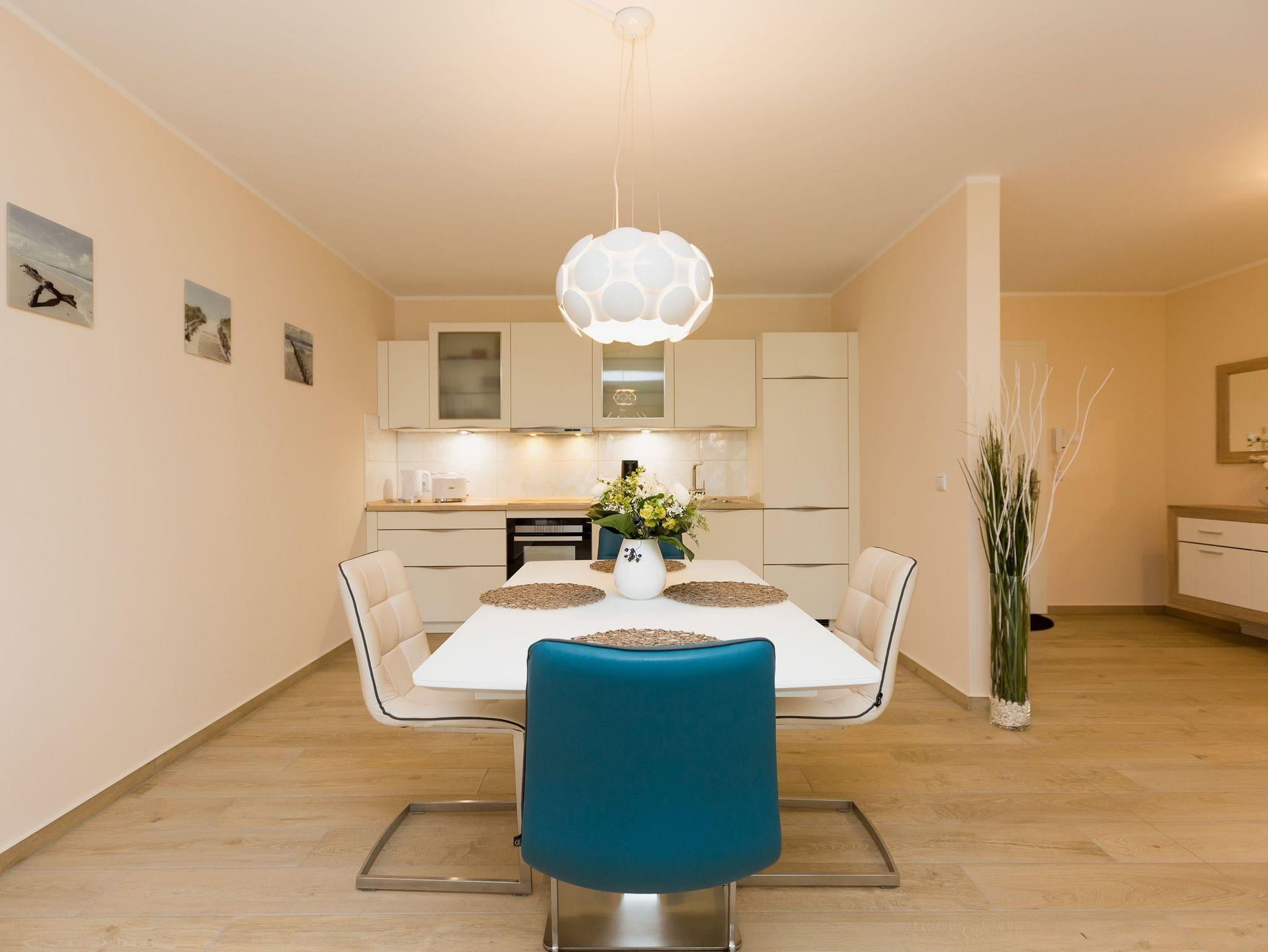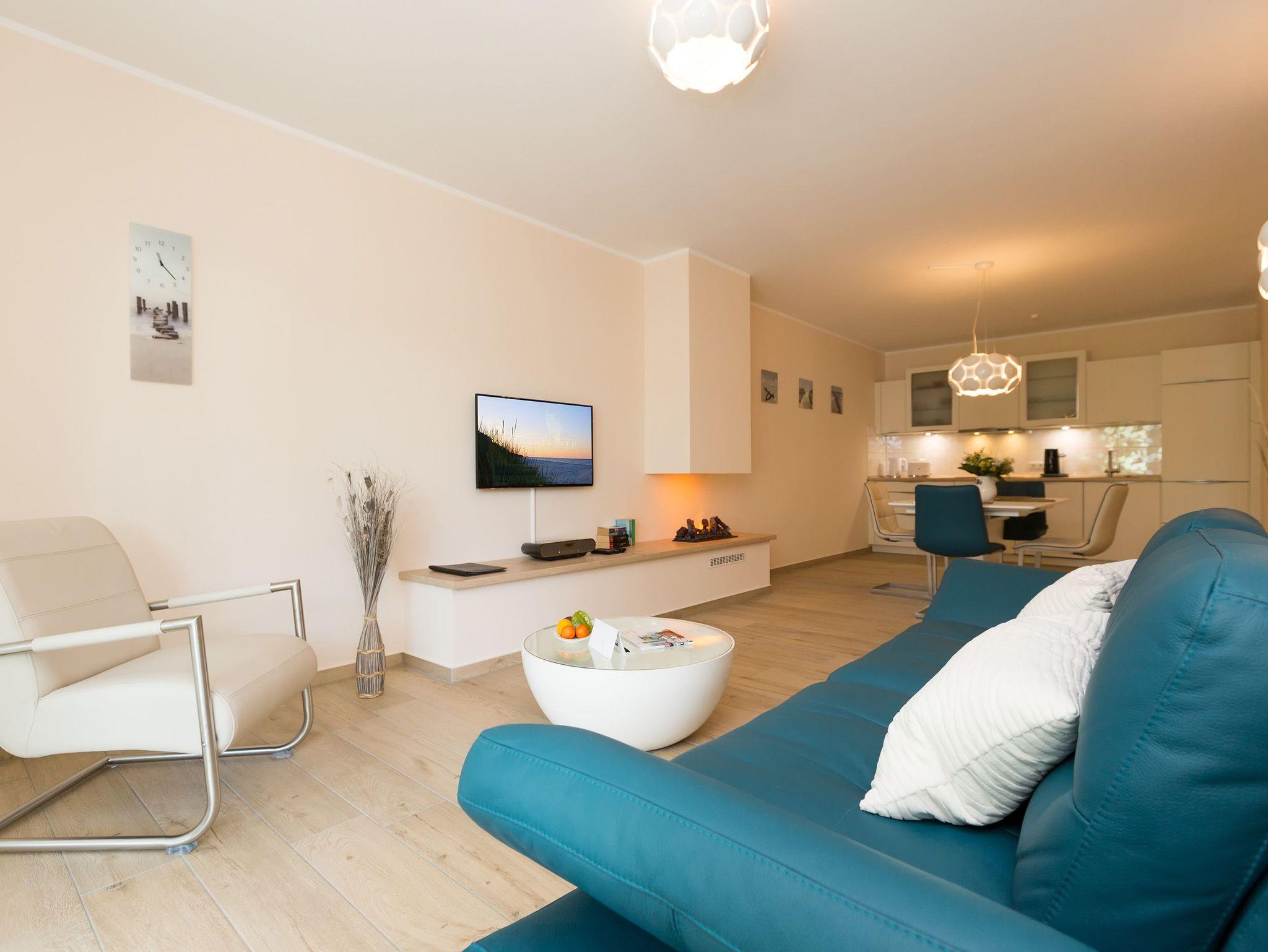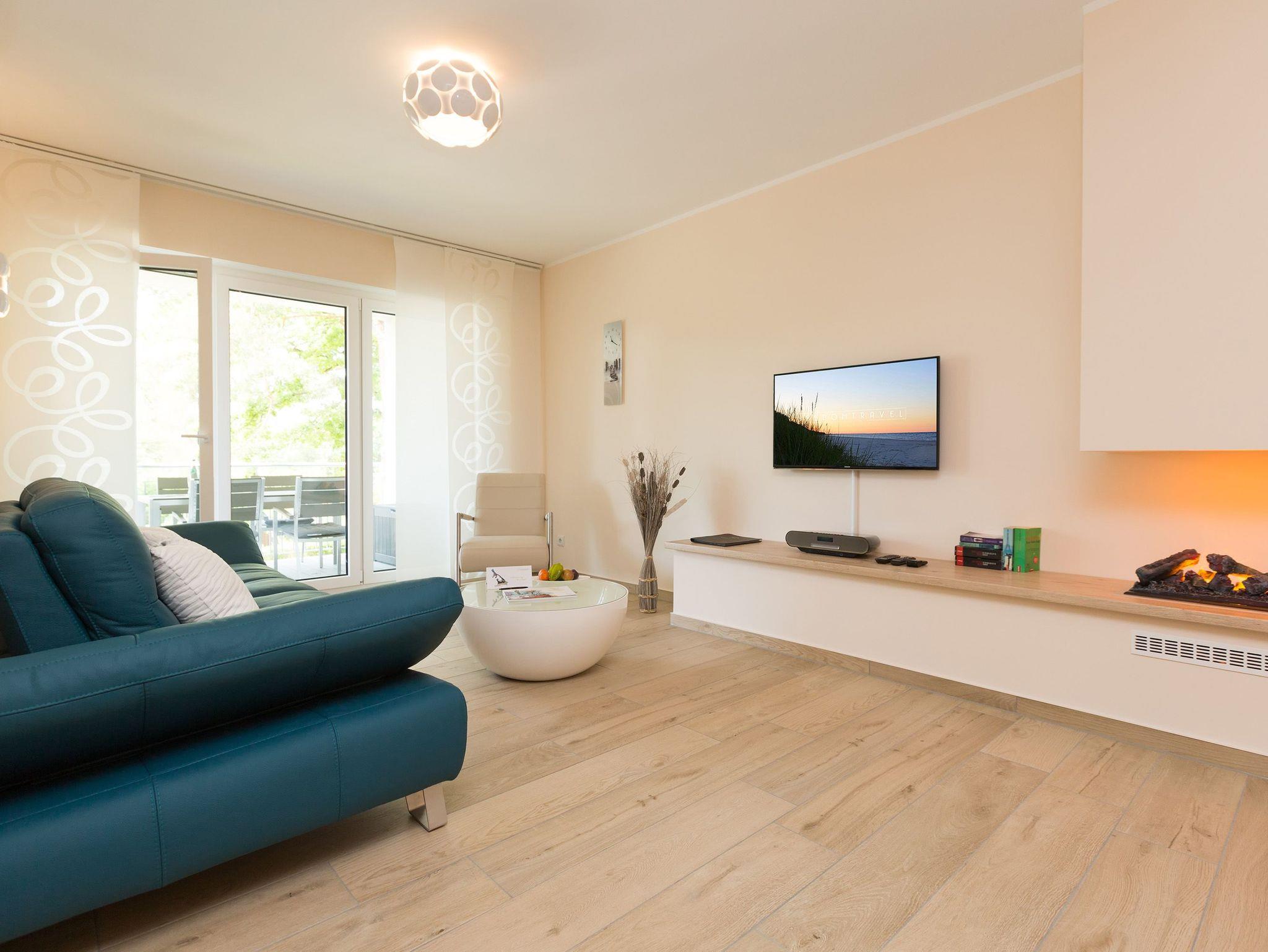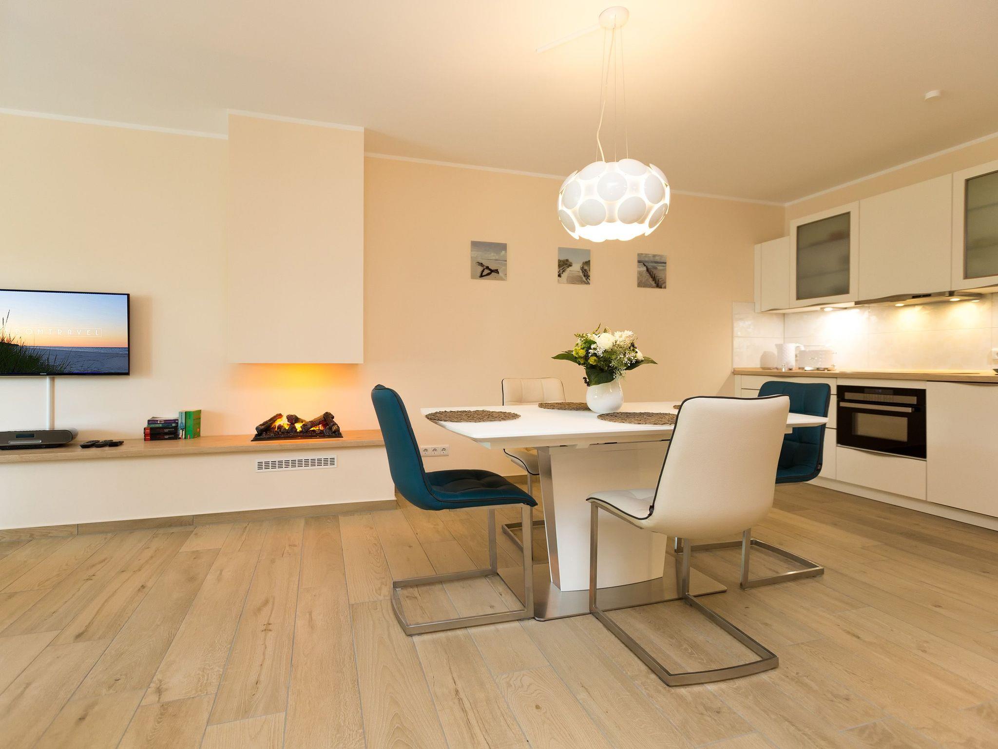 Helle Farben, modernes Design und eine hochwertige Ausstattung machen die Ferienwohnung Nummer 09 im ersten Obergeschoss der Dünenresidenz Heringsdorf zu einem idealen Ort zum Ostseeurlauben. Das wunderschöne 3-Zimmer-Appartement bietet auf 80 Quadratmetern Platz für vier Personen und ein Kleinkind (in einem Kinderreisebett). Eine luftig weite Atmosphäre verströmt der mit geschmackvollen Design-Möbeln eingerichtete Wohn-Essbereich mit offener Küche. Die Sitzgruppe mit Flat-TV lädt zum Chillen ein. Wer Abende mit Kamin liebt, kann diese Dank des offenen Elektro-Kamins auch im Sommer genießen. Denn die muschelige Kaminwärme lässt sich per Knopfdruck zu- aber auch abschalten. Das Appartement verfügt über zwei Schlafzimmer; eines mit einem großen 1,80 m x 2,00 m Doppelbett und eines mit einem 1,40 m x 2,00 m Doppelbett. Das Bad hat Dusche, Waschtisch und WC. Ein Höhepunkt in der Wohnungsausstattung ist mit Sicherheit die Infrarotsauna mit Radio, die kostenfrei genutzt werden kann. Zwar ist der Strand nur 50 Meter entfernt, doch lässt es sich auch herrlich auf dem 20 Quadratmeter großen Balkon mit gemütlicher Lounge-Möbel-Ecke entspannen. Bettwäsche und Handtücher werden gestellt. Zu der Wohnung gehört ein Pkw-Stellplatz in der Tiefgarage (max. Einfahrtshöhe 1,93 m). Über einen Fahrstuhl können sie ins erste Obergeschoss hinauffahren. Das WLAN ist kostenfrei nutzbar.