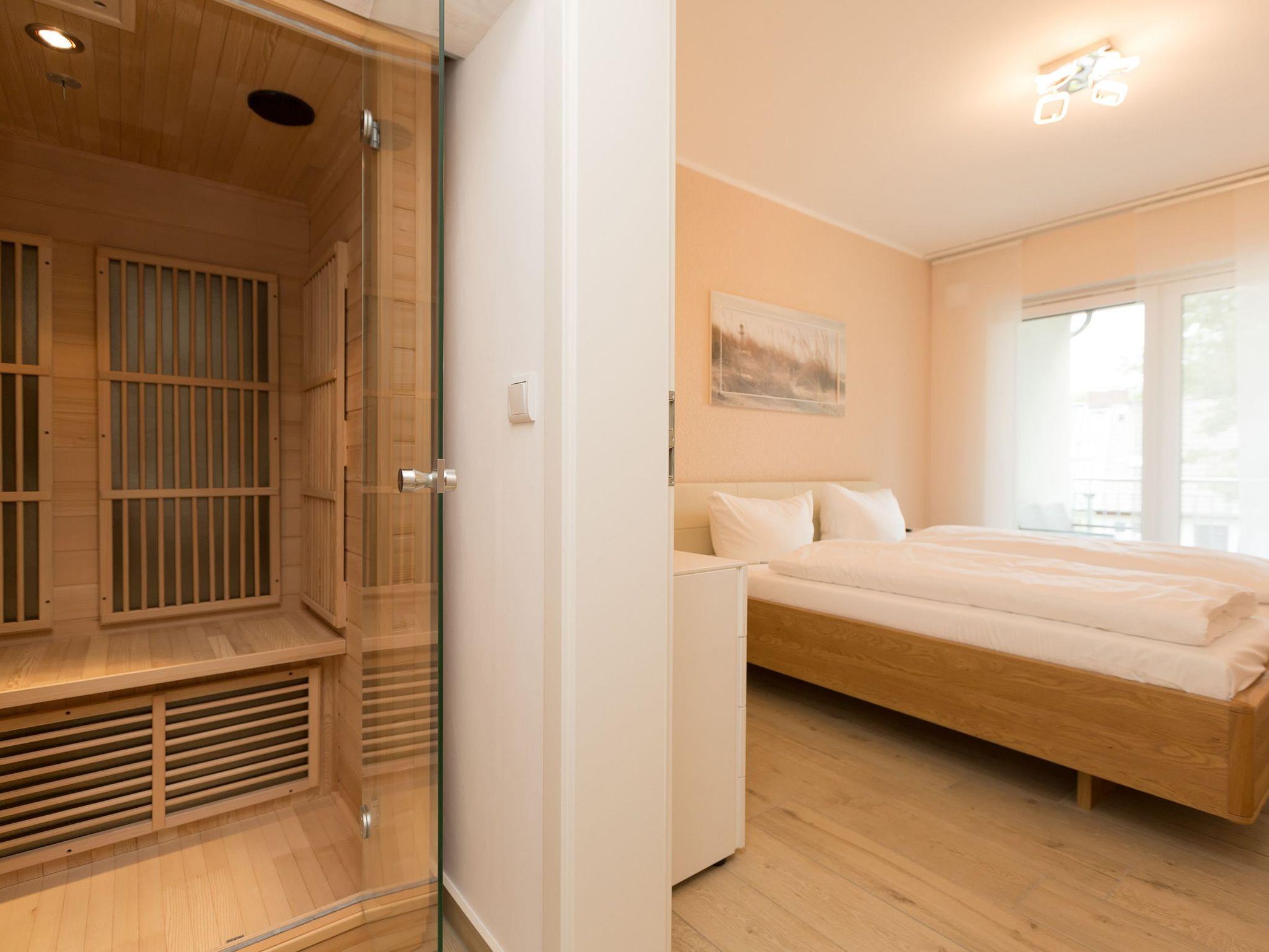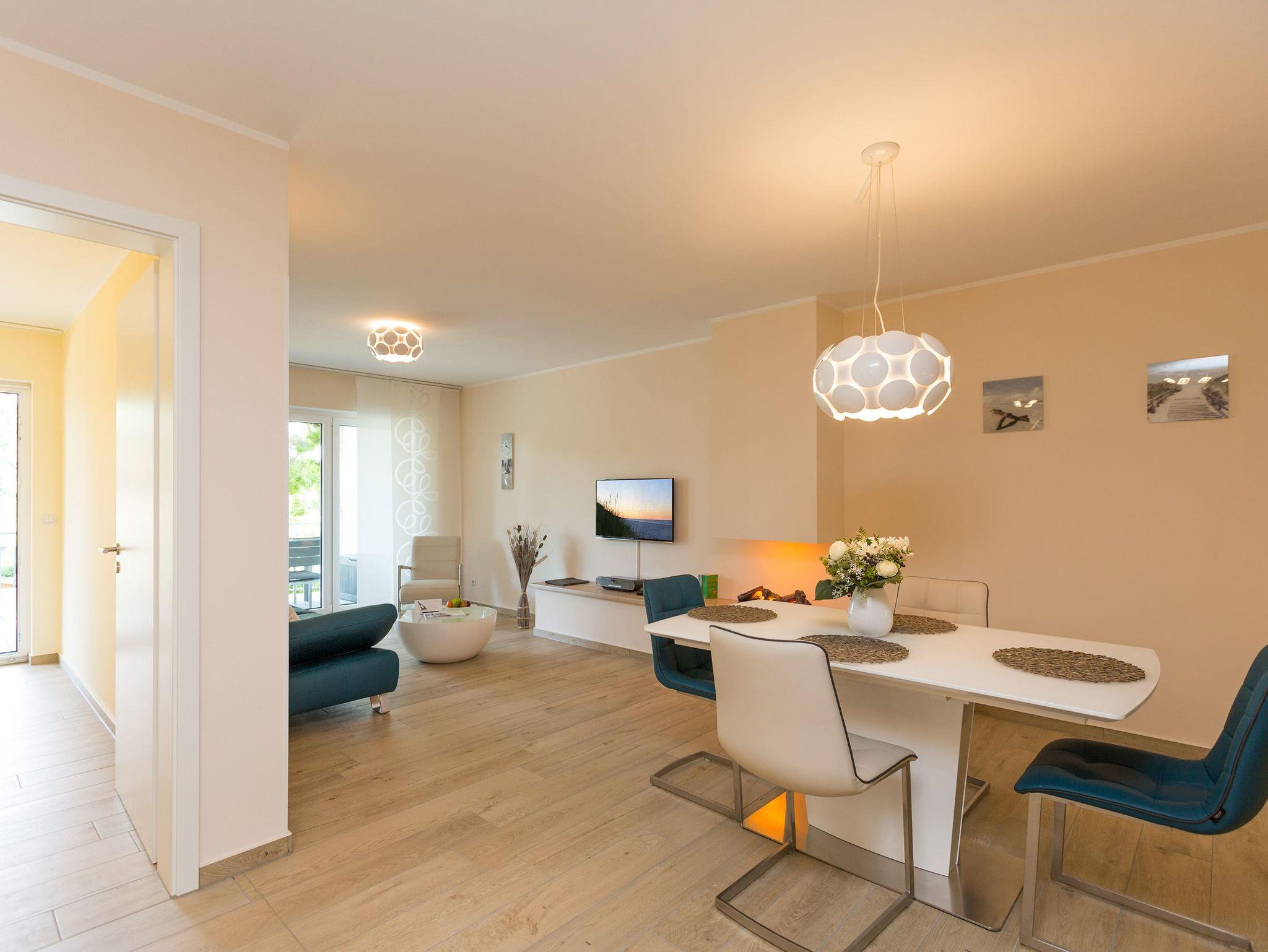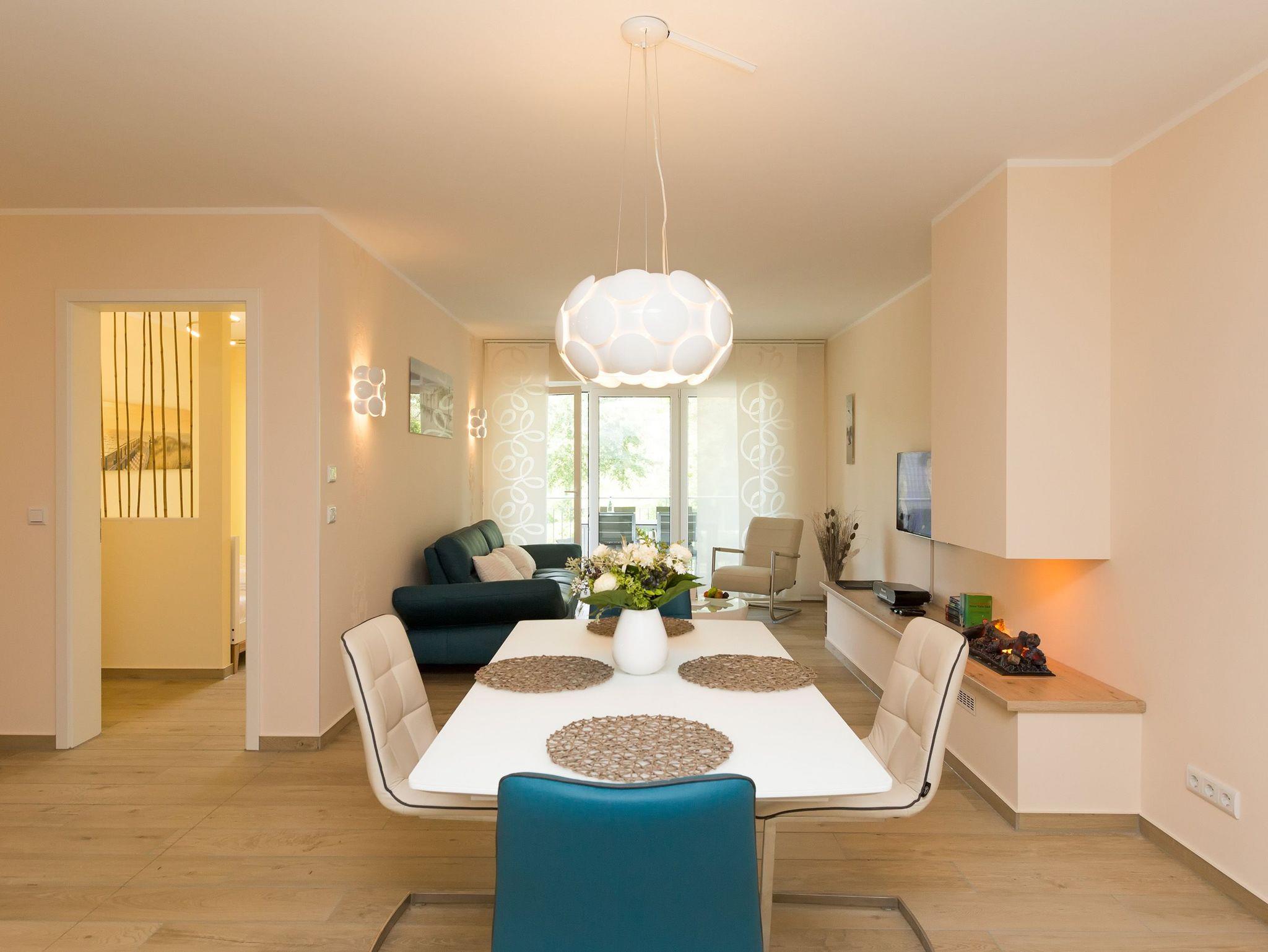 Helle Farben, modernes Design und eine hochwertige Ausstattung machen die Ferienwohnung Nummer 09 im ersten Obergeschoss der Dünenresidenz Heringsdorf zu einem idealen Ort zum Ostseeurlauben. Das wunderschöne 3-Zimmer-Appartement bietet auf 80 Quadratmetern Platz für vier Personen und ein Kleinkind (in einem Kinderreisebett). Eine luftig weite Atmosphäre verströmt der mit geschmackvollen Design-Möbeln eingerichtete Wohn-Essbereich mit offener Küche. Die Sitzgruppe mit Flat-TV lädt zum Chillen ein. Wer Abende mit Kamin liebt, kann diese Dank des offenen Elektro-Kamins auch im Sommer genießen. Denn die muschelige Kaminwärme lässt sich per Knopfdruck zu- aber auch abschalten. Das Appartement verfügt über zwei Schlafzimmer; eines mit einem großen 1,80 m x 2,00 m Doppelbett und eines mit einem 1,40 m x 2,00 m Doppelbett. Das Bad hat Dusche, Waschtisch und WC. Ein Höhepunkt in der Wohnungsausstattung ist mit Sicherheit die Infrarotsauna mit Radio, die kostenfrei genutzt werden kann. Zwar ist der Strand nur 50 Meter entfernt, doch lässt es sich auch herrlich auf dem 20 Quadratmeter großen Balkon mit gemütlicher Lounge-Möbel-Ecke entspannen. Bettwäsche und Handtücher werden gestellt. Zu der Wohnung gehört ein Pkw-Stellplatz in der Tiefgarage (max. Einfahrtshöhe 1,93 m). Über einen Fahrstuhl können sie ins erste Obergeschoss hinauffahren. Das WLAN ist kostenfrei nutzbar.