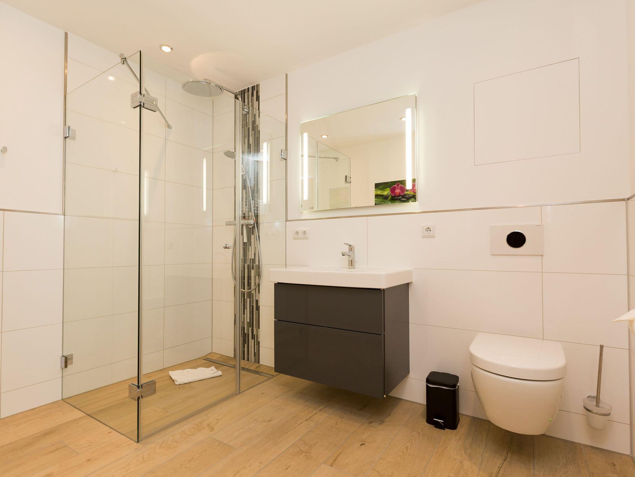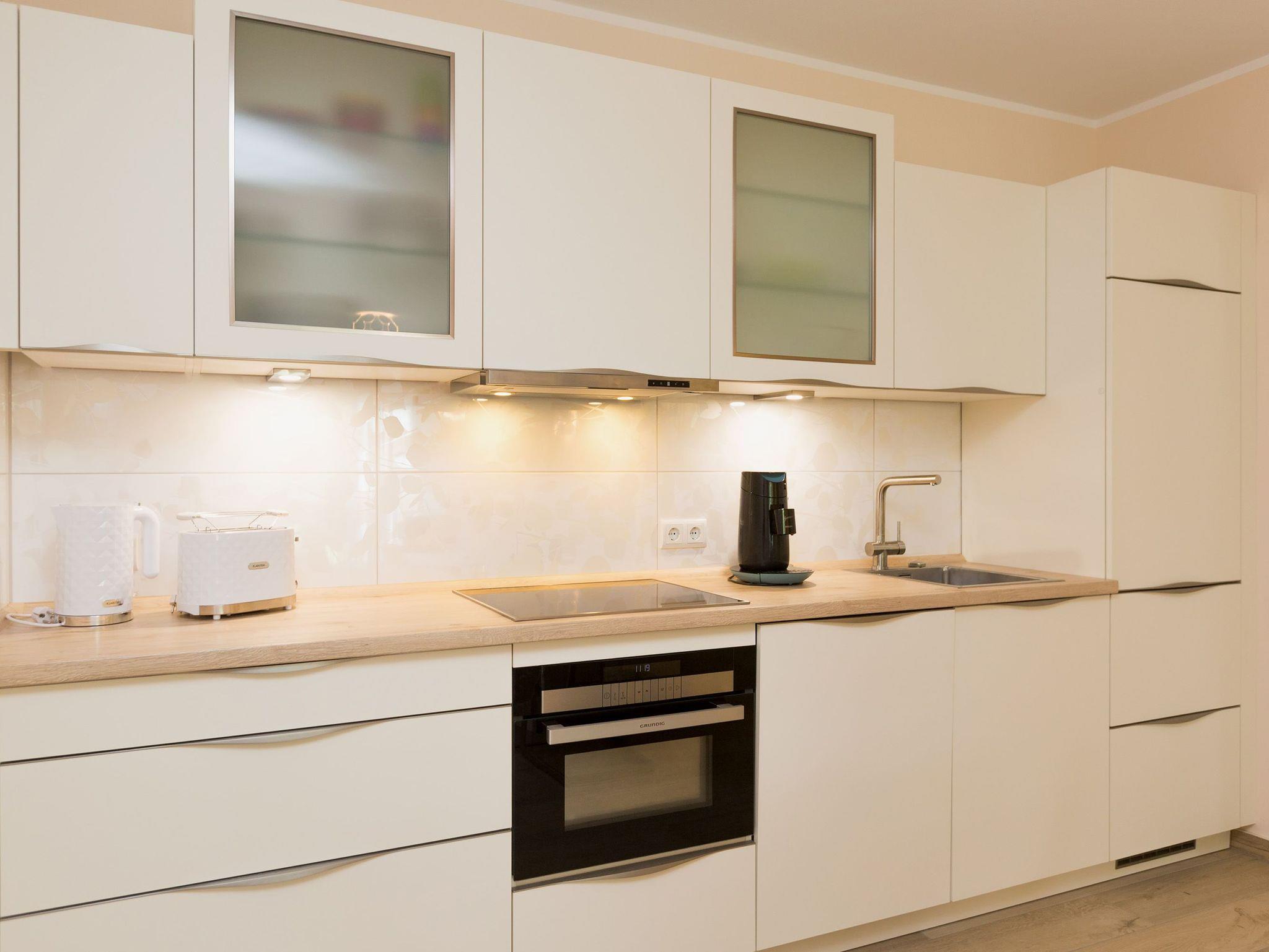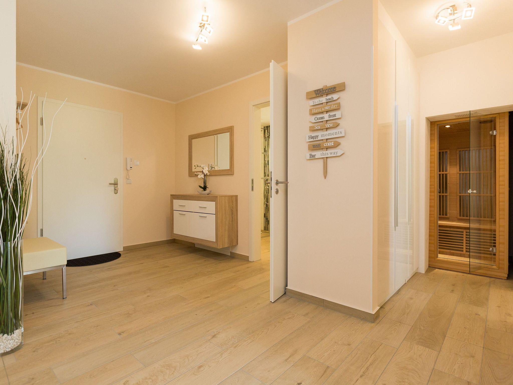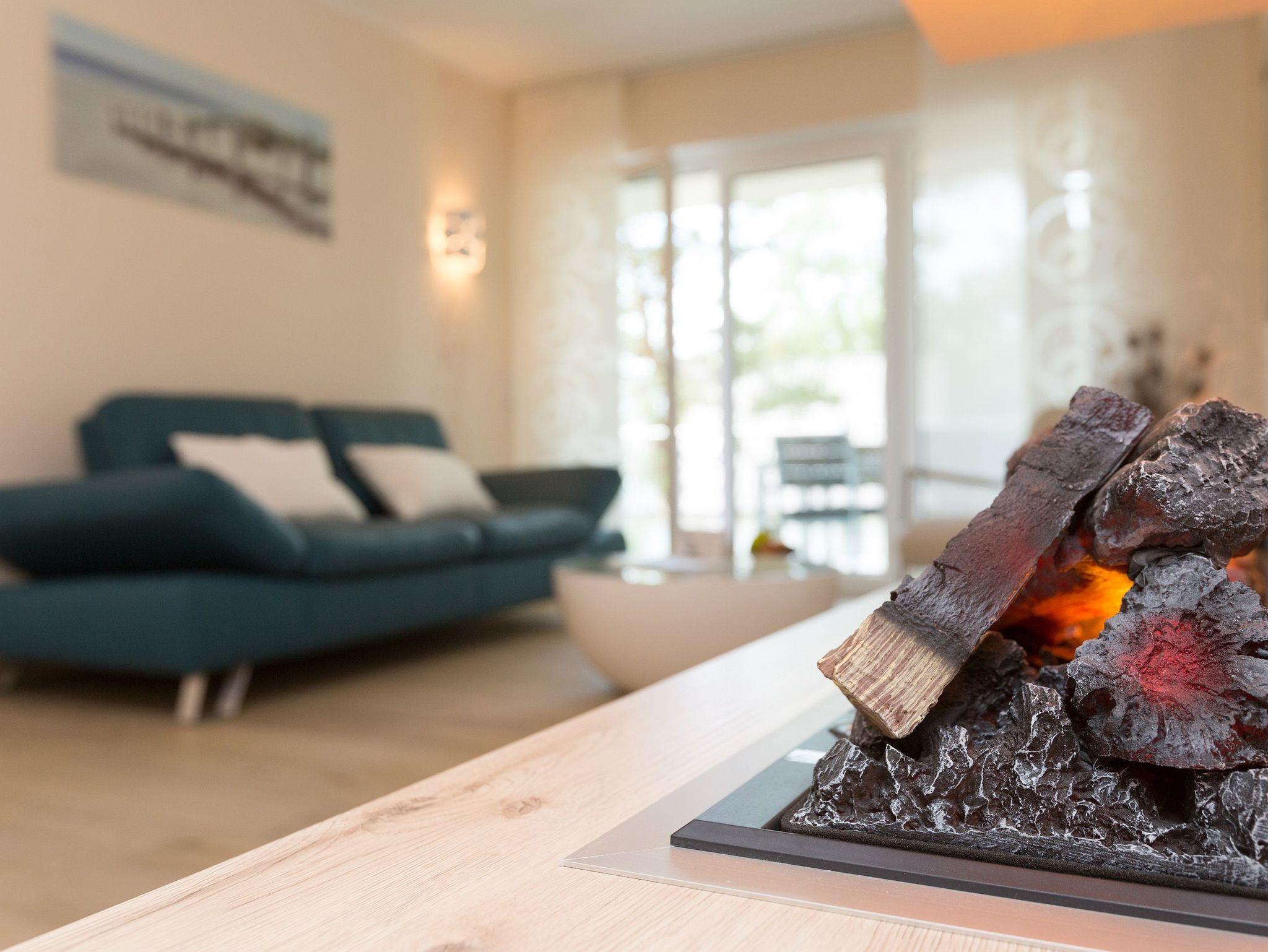 Helle Farben, modernes Design und eine hochwertige Ausstattung machen die Ferienwohnung Nummer 09 im ersten Obergeschoss der Dünenresidenz Heringsdorf zu einem idealen Ort zum Ostseeurlauben. Das wunderschöne 3-Zimmer-Appartement bietet auf 80 Quadratmetern Platz für vier Personen und ein Kleinkind (in einem Kinderreisebett). Eine luftig weite Atmosphäre verströmt der mit geschmackvollen Design-Möbeln eingerichtete Wohn-Essbereich mit offener Küche. Die Sitzgruppe mit Flat-TV lädt zum Chillen ein. Wer Abende mit Kamin liebt, kann diese Dank des offenen Elektro-Kamins auch im Sommer genießen. Denn die muschelige Kaminwärme lässt sich per Knopfdruck zu- aber auch abschalten. Das Appartement verfügt über zwei Schlafzimmer; eines mit einem großen 1,80 m x 2,00 m Doppelbett und eines mit einem 1,40 m x 2,00 m Doppelbett. Das Bad hat Dusche, Waschtisch und WC. Ein Höhepunkt in der Wohnungsausstattung ist mit Sicherheit die Infrarotsauna mit Radio, die kostenfrei genutzt werden kann. Zwar ist der Strand nur 50 Meter entfernt, doch lässt es sich auch herrlich auf dem 20 Quadratmeter großen Balkon mit gemütlicher Lounge-Möbel-Ecke entspannen. Bettwäsche und Handtücher werden gestellt. Zu der Wohnung gehört ein Pkw-Stellplatz in der Tiefgarage (max. Einfahrtshöhe 1,93 m). Über einen Fahrstuhl können sie ins erste Obergeschoss hinauffahren. Das WLAN ist kostenfrei nutzbar.