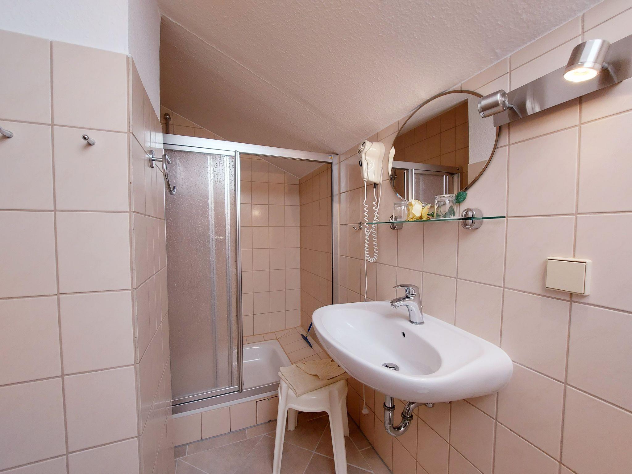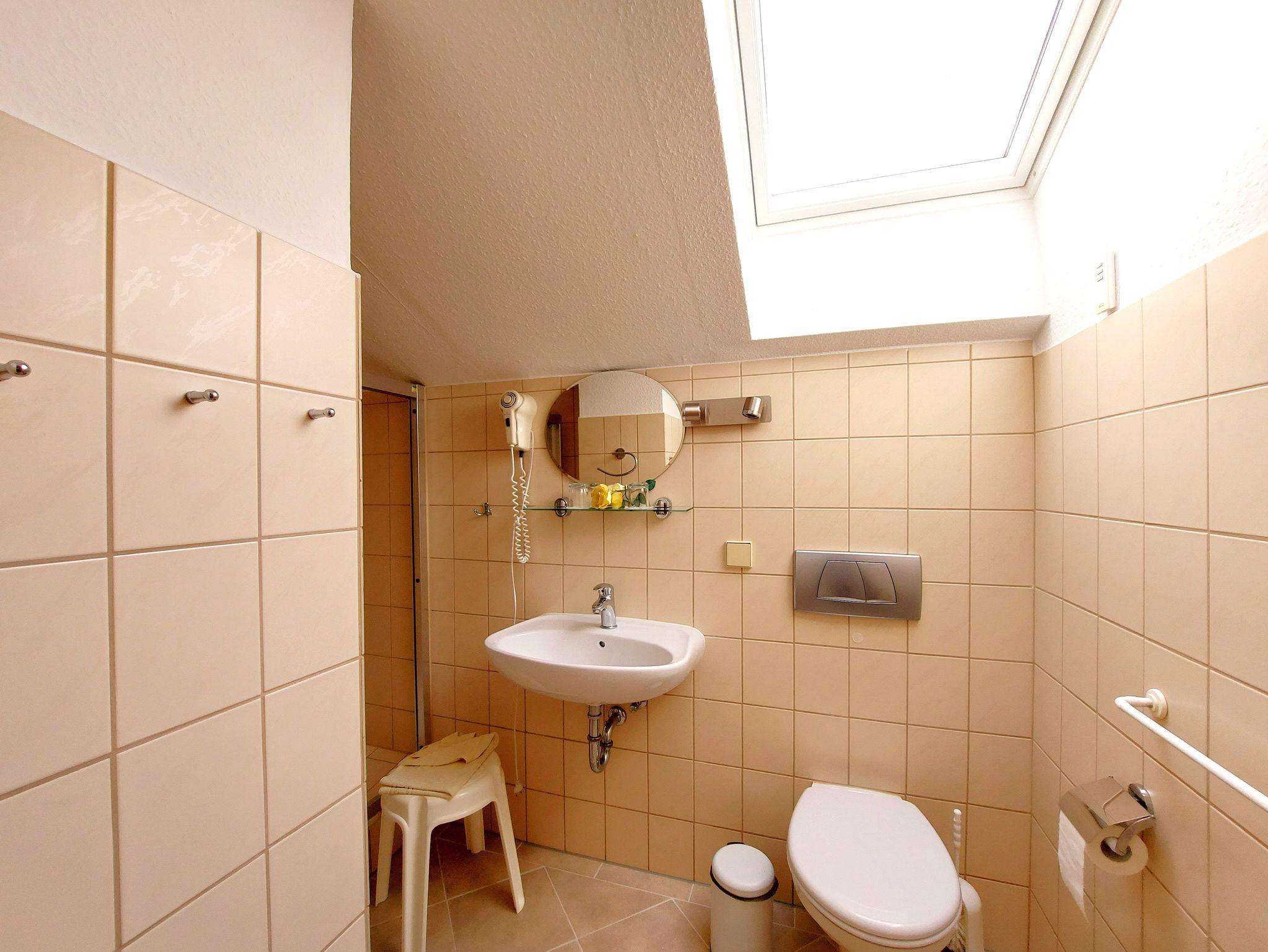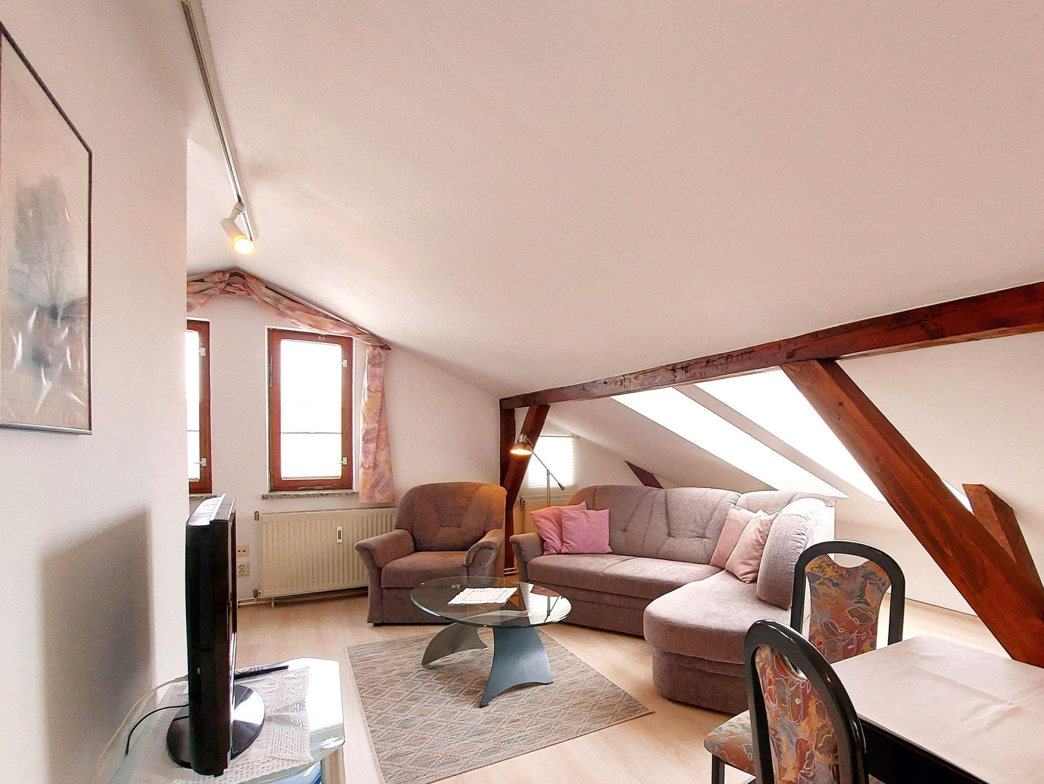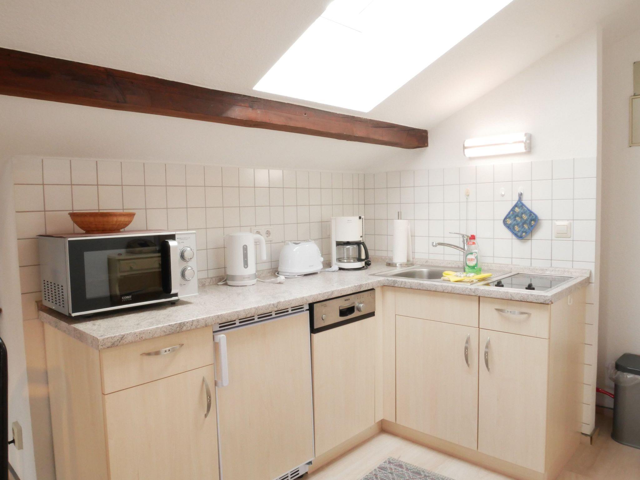 Die Ferienwohnung 5 befindet sich im Dachgeschoss des Hauses. Sie teilt sich auf in ein Wohnzimmer mit offener Küche und Essbereich. Im Wohnzimmer befindet sich eine gemütliche Couch, ein Sessel und ein Flachbildfernseher. Die Küche ist ausgestattet mit Backofen, Herd, Kühlschrank mit Gefriermöglichkeit, Mikrowelle, Spülmaschine, Kaffeemaschine, Wasserkocher und Toaster.