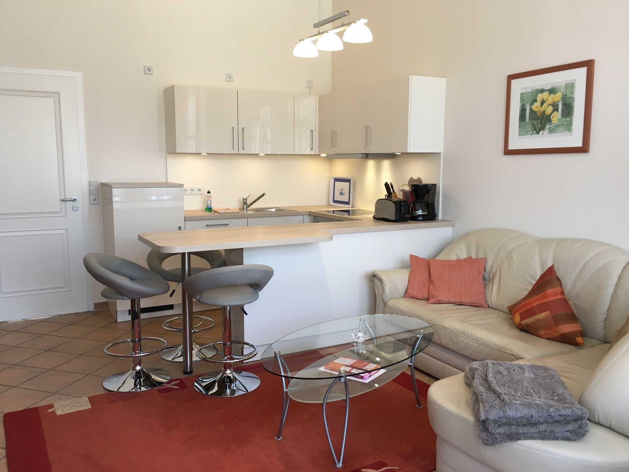 Das moderne 2 Zimmer- Appartement ist ca. 53m² groß und besteht aus einem stilvollen Wohn-Essraum mit Veranda und offener Küchenzeile. Das Schlafzimmer ist mit einem Doppelbett und Kleiderschrank ausgestattet. Zur Wohnung gehören ein großes Badezimmer mit Doppelwaschtisch, Dusche und Badewanne. Hier sind ausschließlich hochwertige Materialien und Marken-Sanitärobjekte verarbeitet worden. Die exklusive Ferienwohnung 7 ist mit italienischen Fliesen und Parkett ausgelegt. Zur Ferienwohnung gehört ein offener Balkon und ein Stellplatz auf dem Gelände.