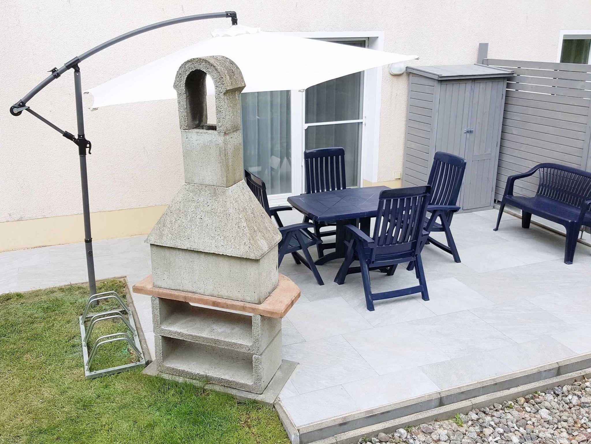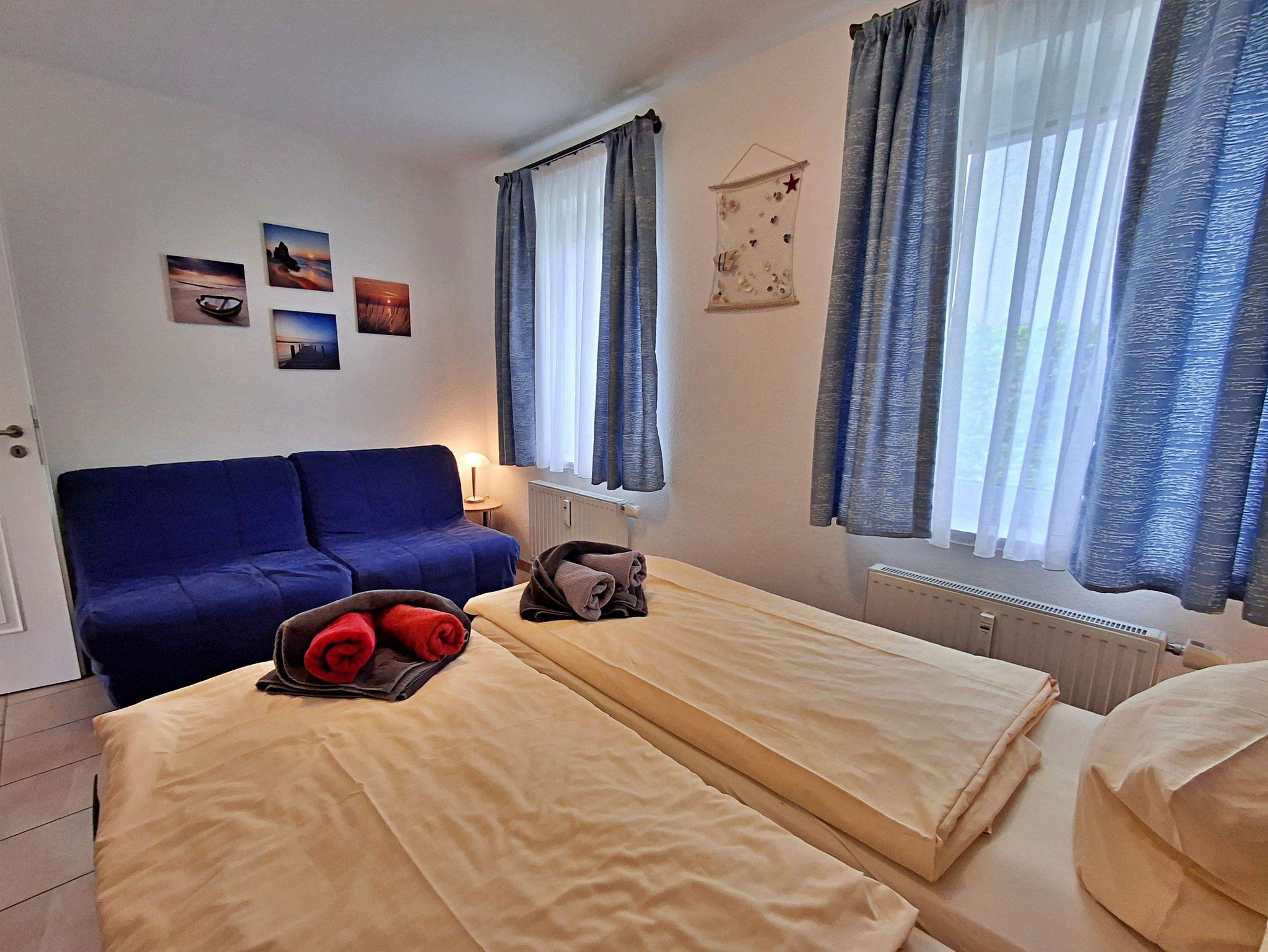 Willkommen in Ihrer gemütlichen Ferienwohnung! Mit ca. 53 qm bietet sie Platz für bis zu vier Personen - und auf Anfrage auch für eine fünfte Person. Das Wohnzimmer lädt zum Wohlfühlen ein, mit einer bequemen Eckcouch, die sich bei Bedarf in ein Schlafsofa mit einer Liegefläche von 1,60 x 2,00 m verwandeln lässt und Flachbild-TV. Hier können Sie entspannte Abende verbringen oder gemeinsam essen, denn ein Esstisch mit vier Stühlen ist ebenfalls vorhanden. Die voll ausgestattete Küche ist ein echtes Highlight - mit Ceranherd, Backofen, Geschirrspüler, Mikrowelle, Kühlschrank mit Gefriermöglichkeit und vielem mehr können Sie Ihre Lieblingsgerichte zubereiten. Für kleine Mahlzeiten oder einen Kaffee gibt es außerdem einen zusätzlichen kleinen Essbereich. Im Schlafzimmer erwartet Sie ein komfortables Doppelbett (1,60 x 2,00 m) sowie zwei praktische, ausklappbare Schlafsessel (je 0,90 x 1,90 m), die zusätzlichen Platz bieten. Das Bad mit ebenerdiger Dusche, WC und Haarfön sorgt für Komfort und Bequemlichkeit. Draußen können Sie auf der möblierten Terrasse entspannen und den Grill anwerfen - perfekt für schöne Stunden im Freien mit Familie oder Freunden. Selbstverständlich ist auch WLAN inklusive, sodass Sie Ihre Urlaubserlebnisse mit Familie und Freunden zuhause teilen können. Der Parkplatz befindet sich direkt am Haus, sodass Sie Ihr Auto bequem und sicher abstellen können.