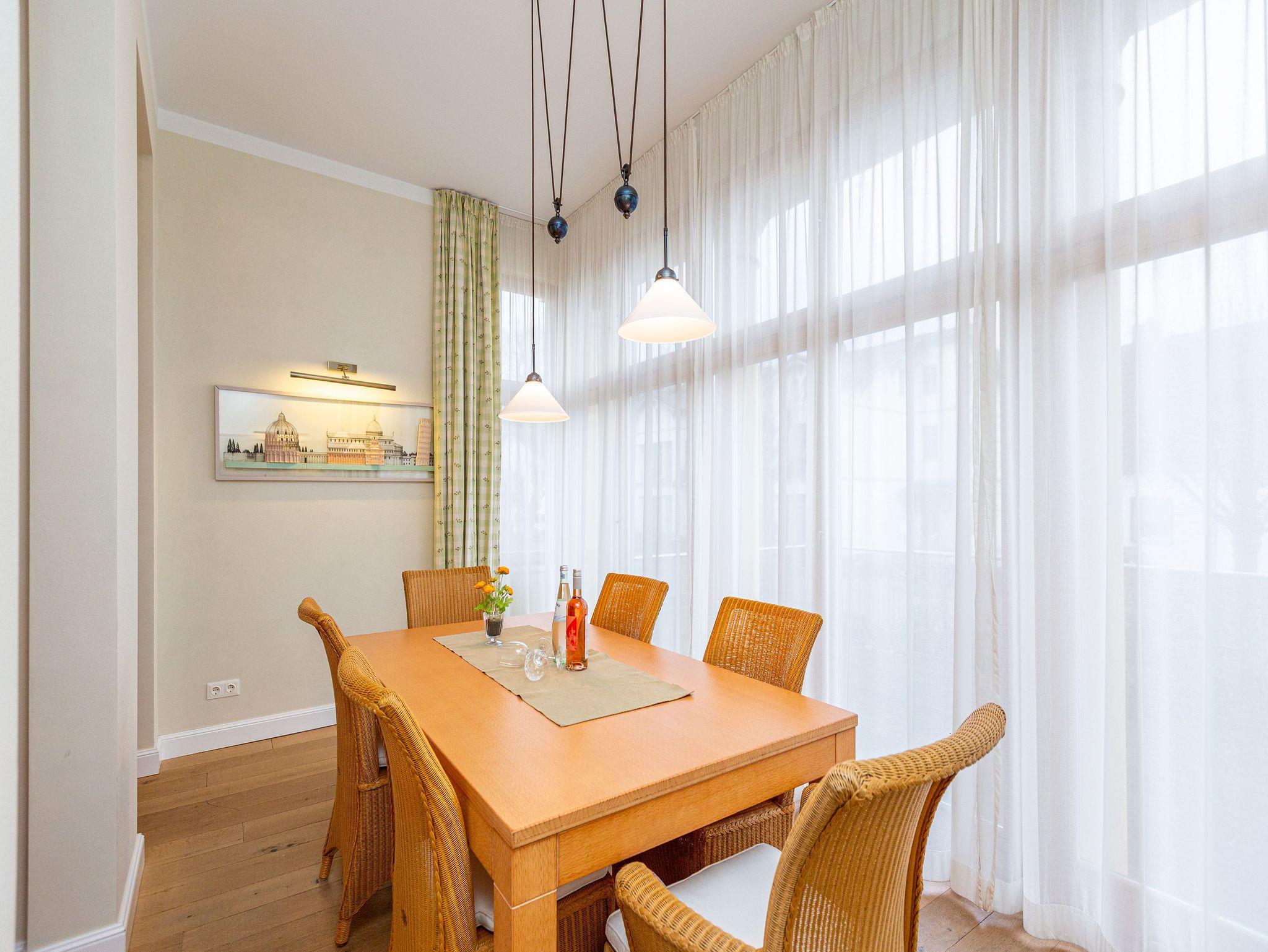 Moderner Landhausstil auf wohnlichen Holzdielen - willkommen in der gemütlichen Ferienwohnung PROVENCE (82 qm). Frische Farben, stilvolle Pinienmöbel auch hier stimmt einfach alles. Dieses großzügige 2-Raum-Appartement im Hochparterre bietet 2 Personen und einem Kleinkind (Babyreisebett und Hochstuhl zubuchbar) Platz für einen entspannten Urlaub. Der großzügige Wohnbereich unterteilt sich in eine bequeme Sitzgruppe mit Flat-TV und den Essbereich in der offenen Veranda. Ein großer Westbalkon verlängert den Wohnbereich und lädt zum Entspannen ein. Die Küche ist selbstverständlich komplett ausgestattet, von hier hat man auch Zugang zum zweiten großen Balkon: Frühstück in der Morgensonne! Auch das Schlafzimmer mit dem Doppelbett (1,80 m breit ) lädt zum Träumen ein. Neben dem schönen Bad mit großer Glasdusche und WC, steht noch ein Gäste-WC zur Verfügung. Für Ihren Komfort ist das Appartement mit dem 1. Satz Handtücher ausgestattet und liebevoll bezogen.
