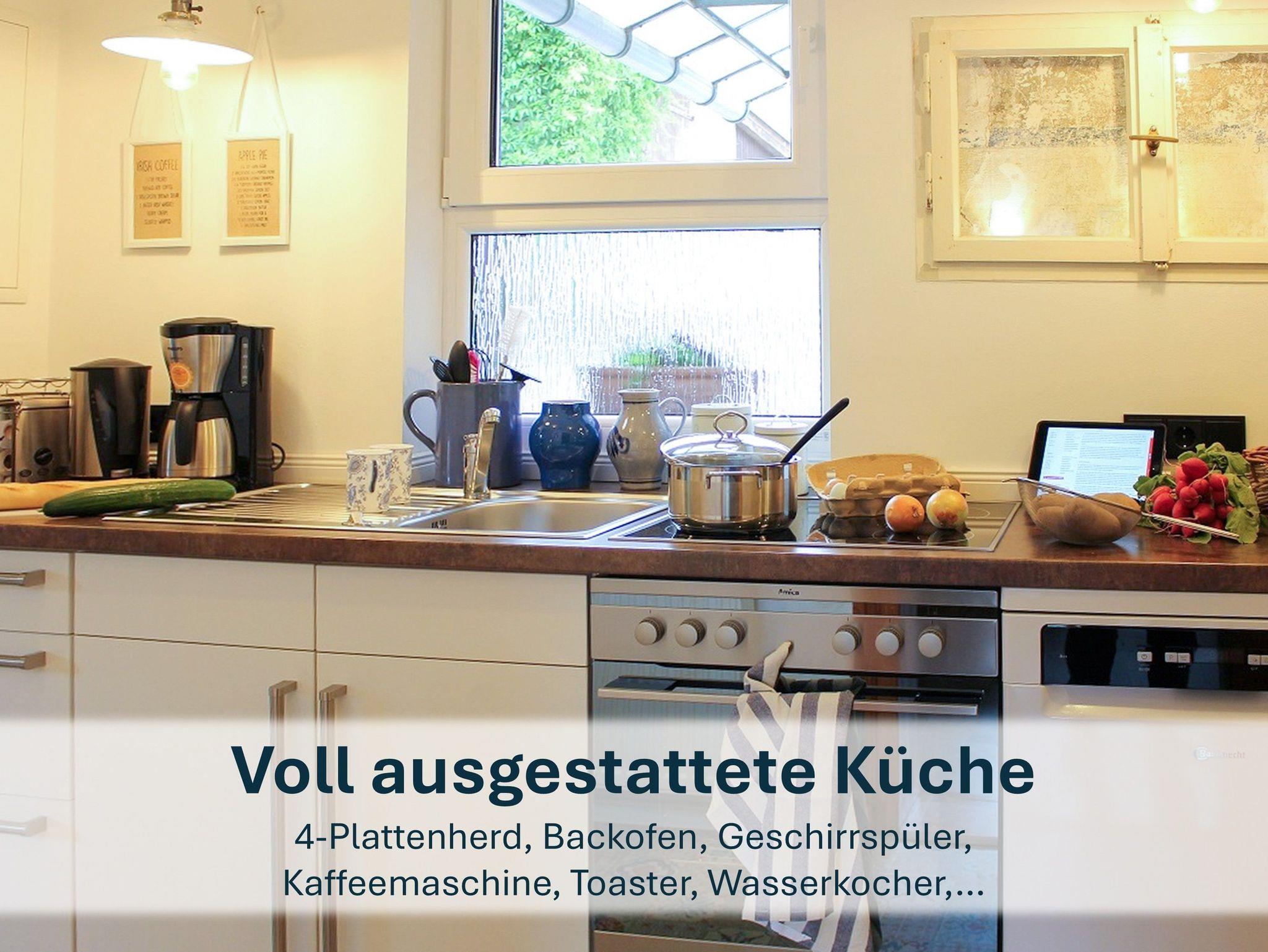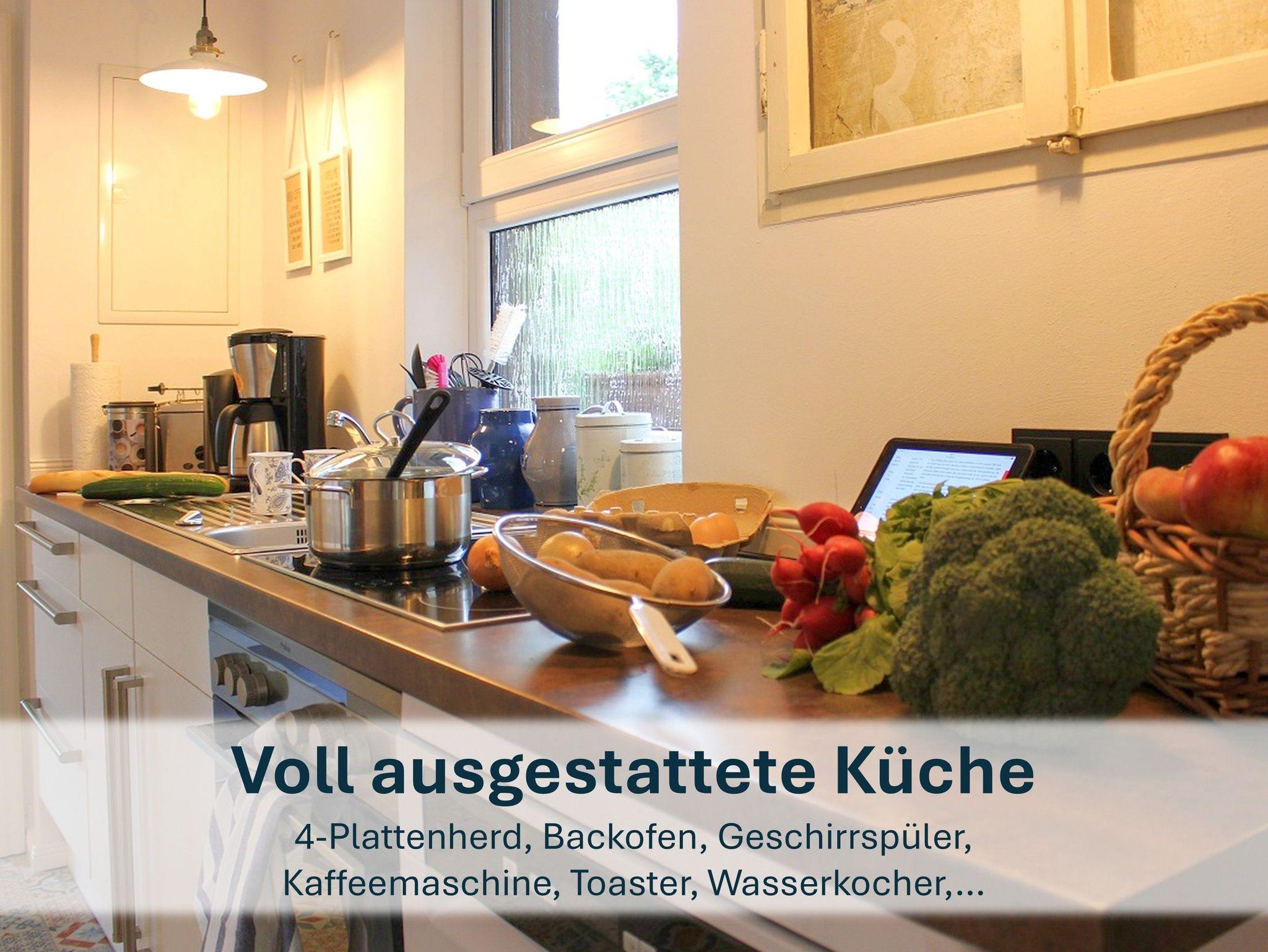 Die voll ausgestattete Küche bietet Cerankochfeld, Backofen, Kühlschrank mit Gefrierfach, Kaffeemaschine, Wasserkocher, Toaster und Geschirr für vier Personen - ideal für gesellige Mahlzeiten. Auch Reinigungsutensilien und ein Hauswirtschaftsbereich mit Bügelbrett und Staubsauger sind vorhanden.
