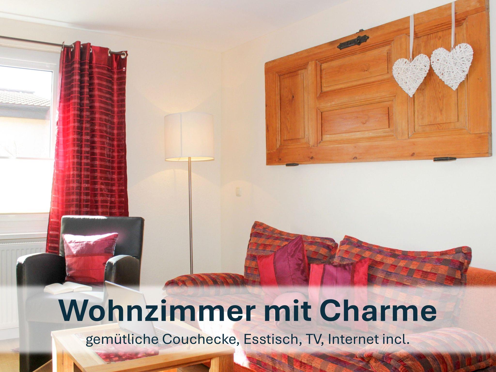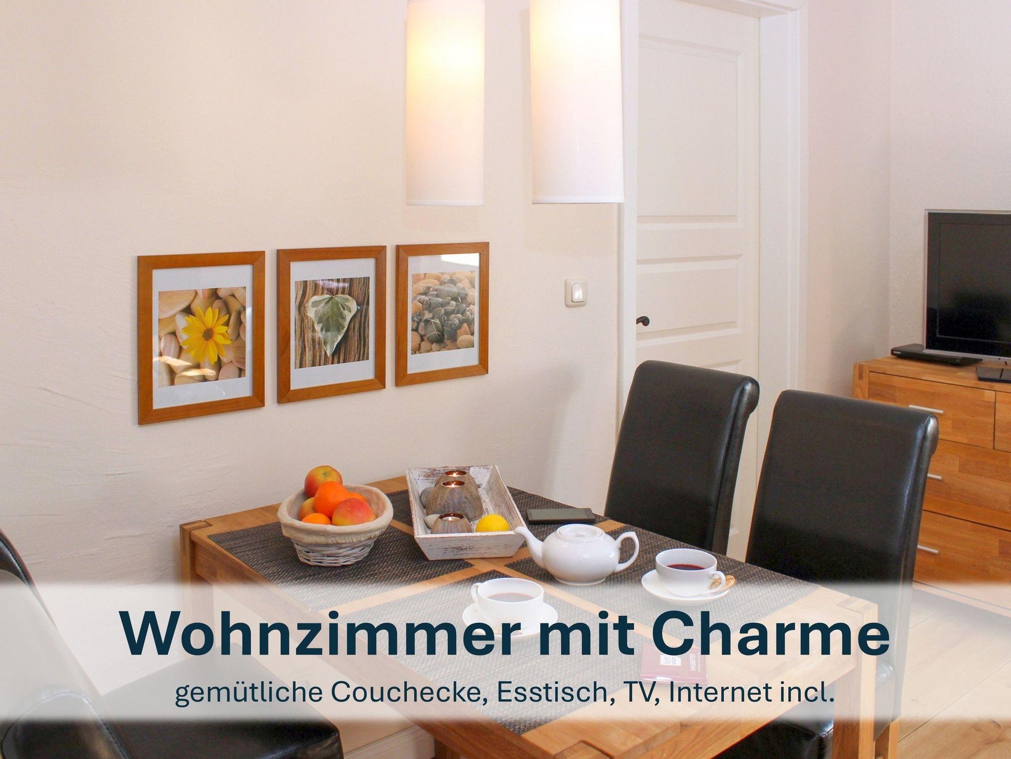 Im Wohnbereich laden eine bequeme Couch, ein moderner Flachbildfernseher und kostenloses WLAN zum Entspannen ein. Warme Farben und liebevolle Details sorgen für eine wohnliche Atmosphäre.